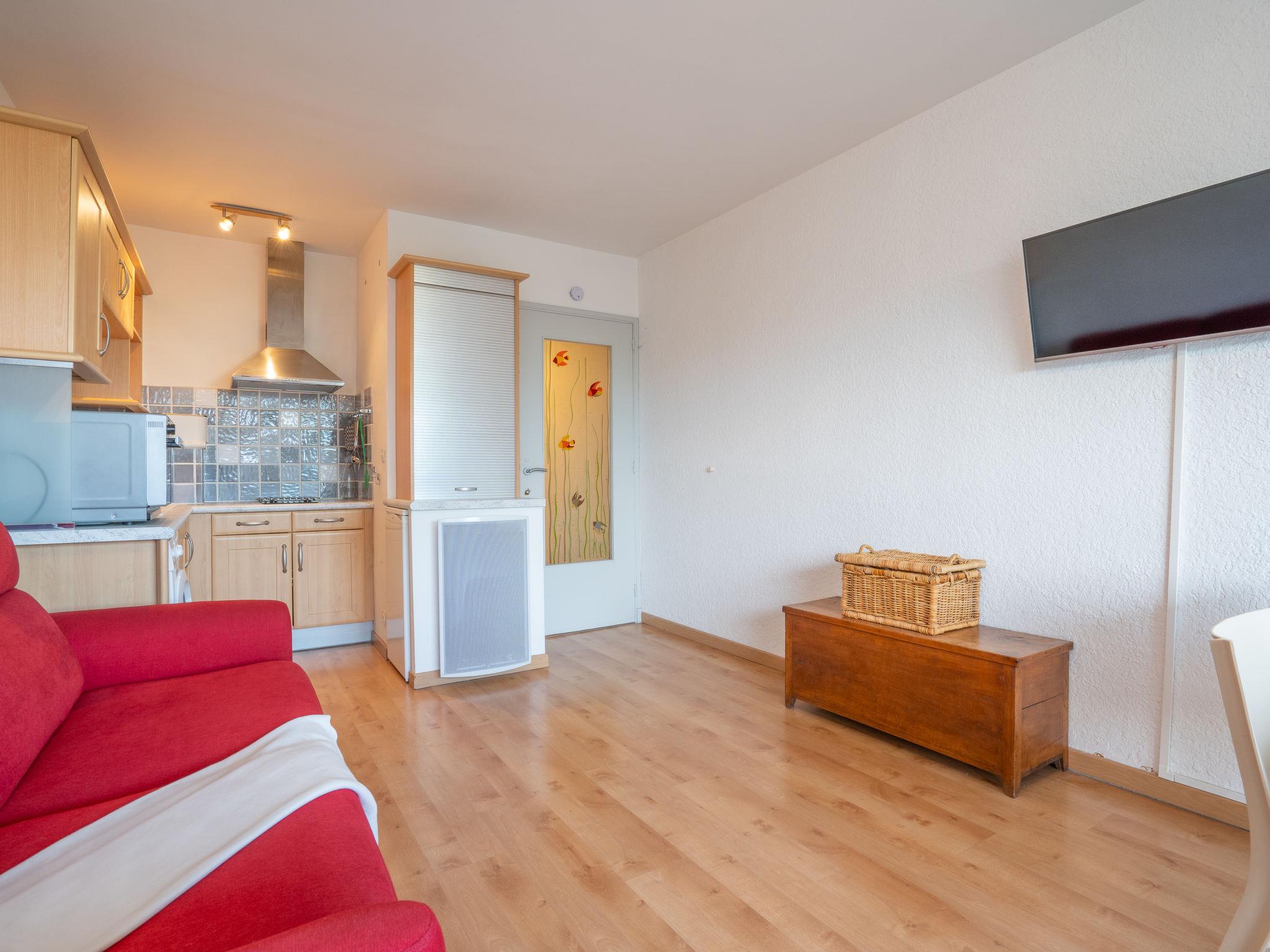 1-room studio 30 m2 on 1st floor, south facing position. Simple and comfortable furnishings: living/dining room with panoramic window with 1 double sofabed (1 x 160 cm, length 200 cm), TV (flat screen), fan. Exit to the terrace. Sleeping alcove with 1 x 2 bunk beds (80 cm, length 190 cm). Kitchenette (2 ceramic glass hob hotplates, toaster, kettle, electric coffee machine, combination microwave). Shower/WC. Heating. Terrace 5 m2. Terrace furniture. View of the sea. Facilities: washing machine, iron, hair dryer. Internet (WiFi, extra). Parking space n D16 (1 car). Please note: suitable for families. 1 small pet/ dog allowed. TV only FR. Smoke alarm, no lift. Instead of an enclosed bedroom, some sleeping areas are located in an open-plan area (gallery, alcove, etc.). FJS1057HT