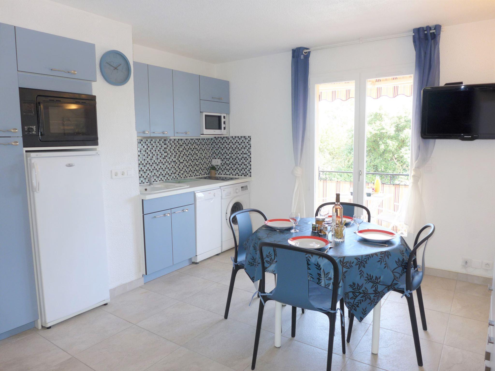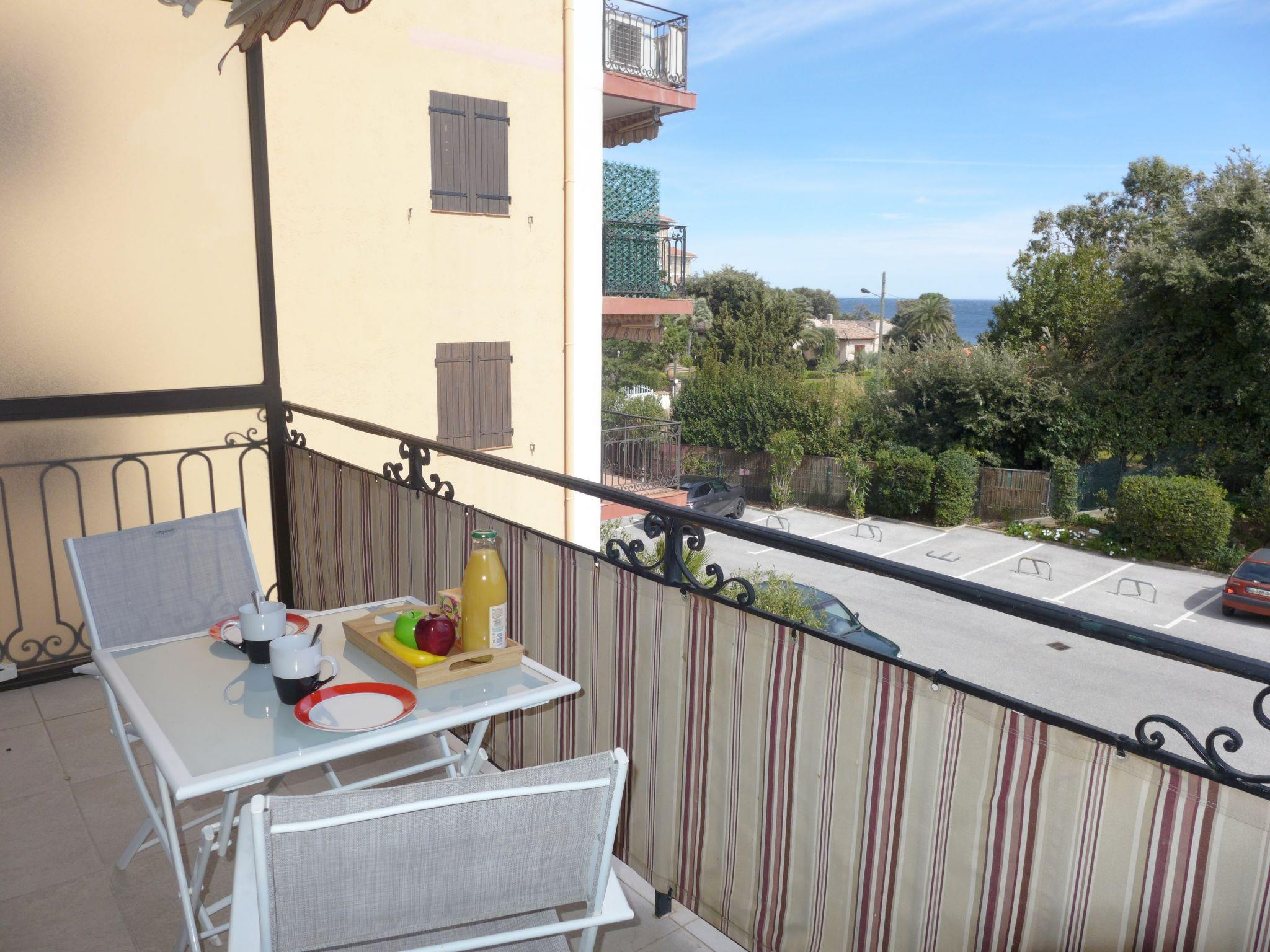 2-room apartment 30 m2 on 2nd floor, east facing position. Beautiful and modern furnishings: living/dining room with TV (flat screen). Exit to the balcony. 1 room with 1 french bed (1 x 140 cm, length 190 cm), air conditioning. Kitchenette (oven, dishwasher, 2 induction hot plates, toaster, kettle, microwave, freezer, electric coffee machine, Capsules for coffee machine (Nespresso) extra). Shower/WC. Heating. Balcony 7 m2. Terrace furniture. Partial view of the sea. Facilities: washing machine, iron, hair dryer. Internet (WiFi, free). Please note: non-smokers only. TV only FR. Smoke alarm. 739
