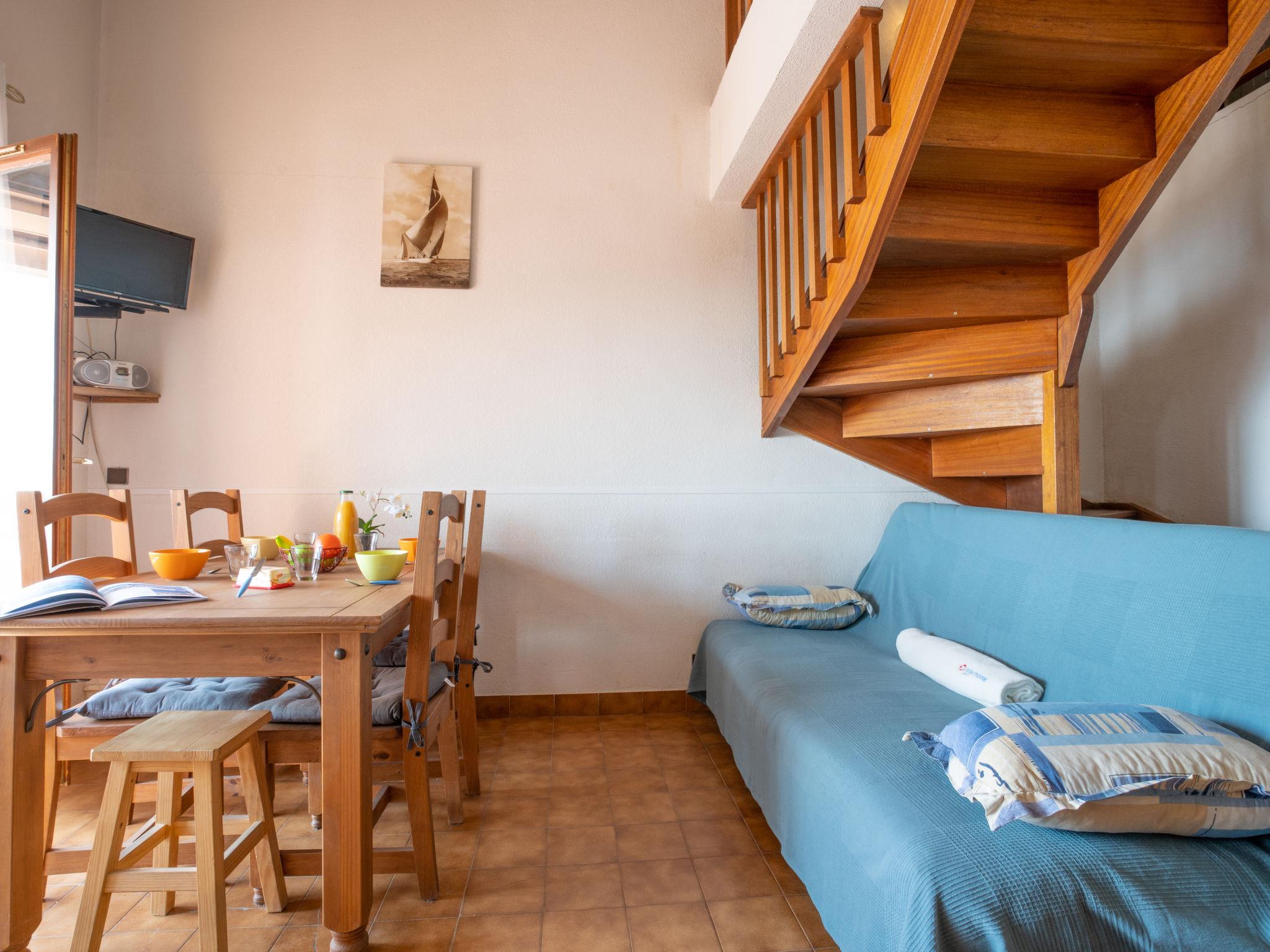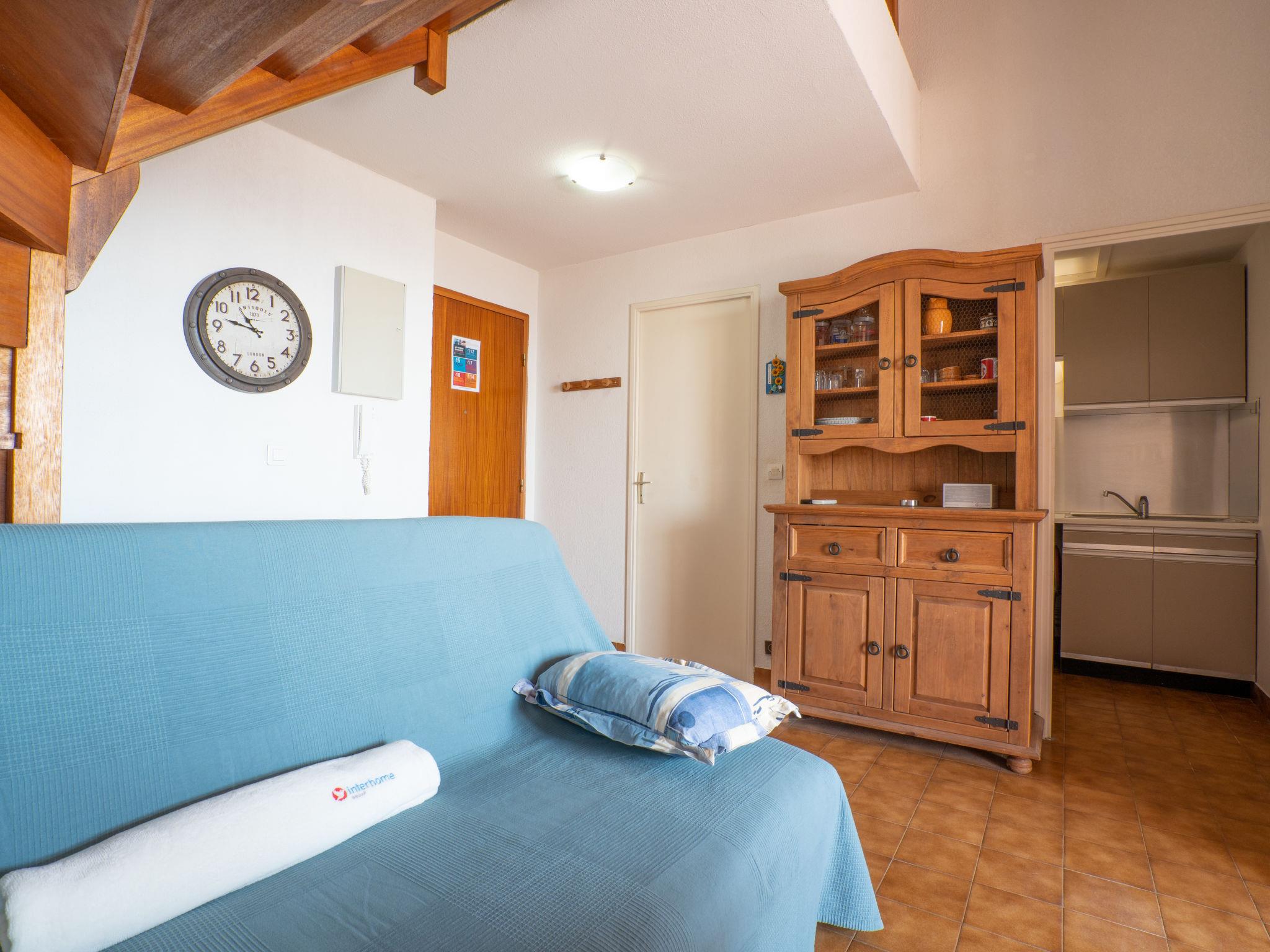 2-room apartment 41 m2 on 2 levels on 4th floor, south-east facing position. Simple furnishings: living/dining room with 1 sofabed, TV, radio and air conditioning. Exit to the terrace. 1 small room with 1 x 2 bunk beds (90 cm, length 190 cm), fan. Gallery with 1 french bed (1 x 140 cm, length 190 cm). Small kitchen (2 hot plates, toaster, kettle, electric coffee machine, combination microwave). Bath/WC. Heating. Terrace 5 m2. Terrace furniture. View of the sea. Facilities: iron, hair dryer. Internet (WiFi, extra). Please note: TV only FR. Smoke alarm. Instead of an enclosed bedroom, some sleeping areas are located in an open-plan area (gallery, alcove, etc.). FJS1139HT