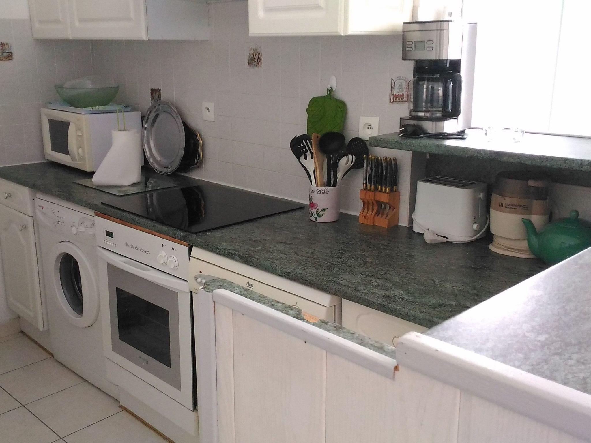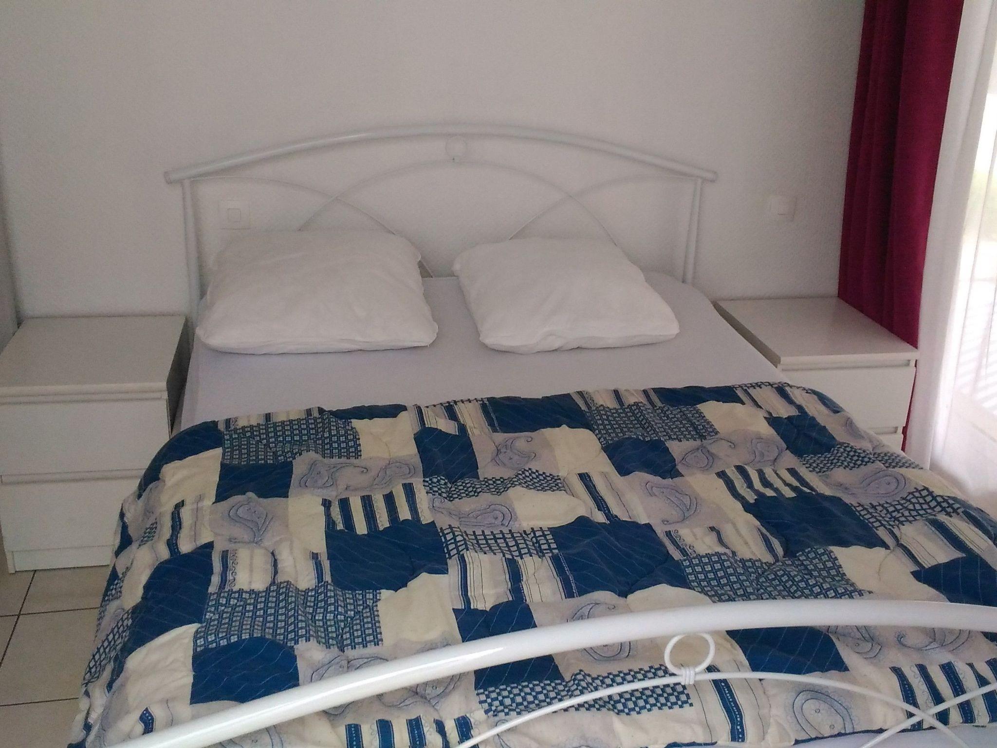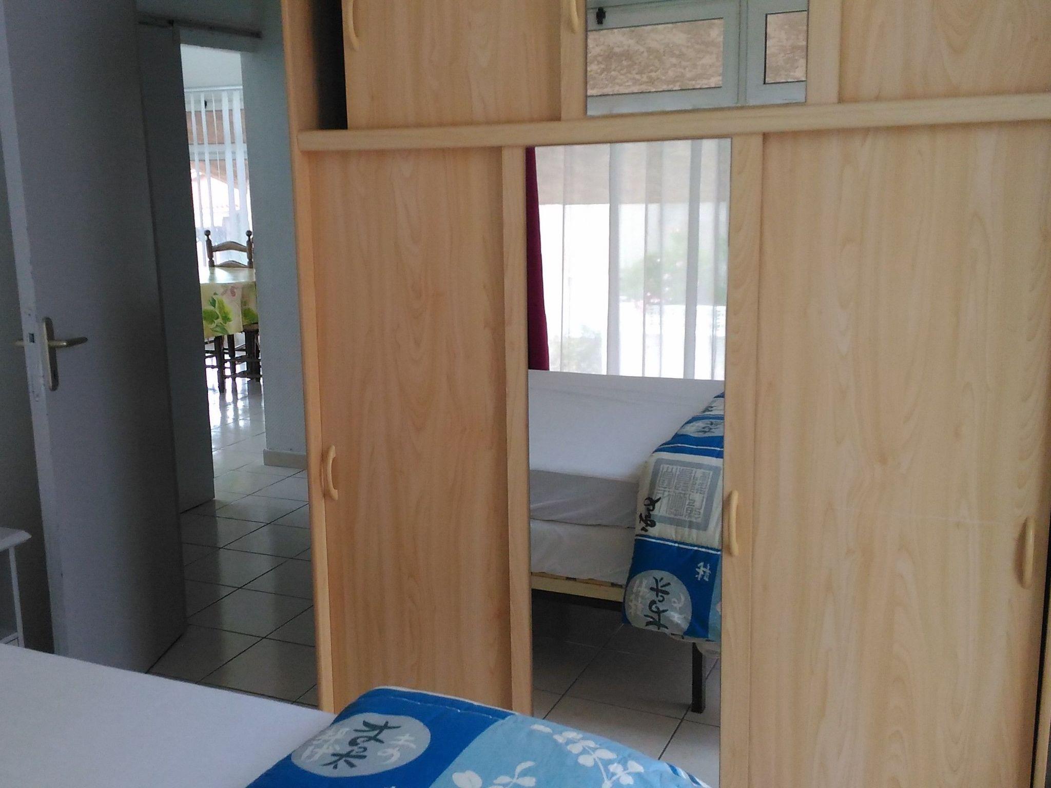 The flat is accessed via a private terrace. The air-conditioned living room offers a unique view of the pool and access to the two terraces. In the living room you will find a double sofa bed (measuring 140 cm wide when open). In addition, there are two bedrooms, each with a 140 cm wide double bed. The second terrace is accessible from these two bedrooms. The third bedroom has bunk beds for two people (90 cm wide). The window in this bedroom overlooks the main square of the holiday home. The kitchen is separated from the living room by a bar. There is a washing machine, dishwasher, fridge with freezer, oven, microwave, induction hob, coffee maker, toaster and electric griddle. The bathroom has a hydromassage shower.