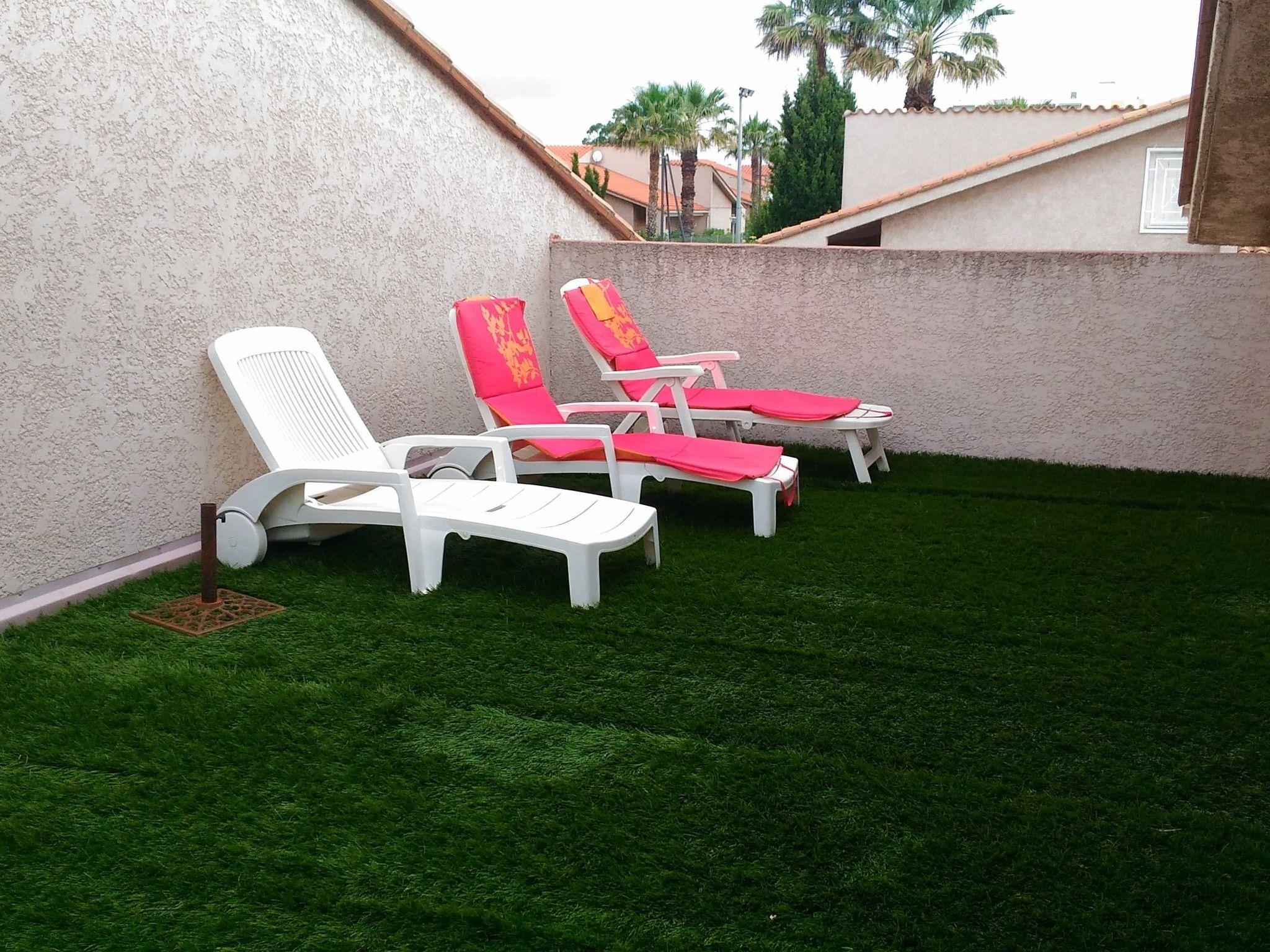 The two terraces measure approximately 37 m². The terrace, accessible from the living room, has an awning, armchairs and a barbecue.