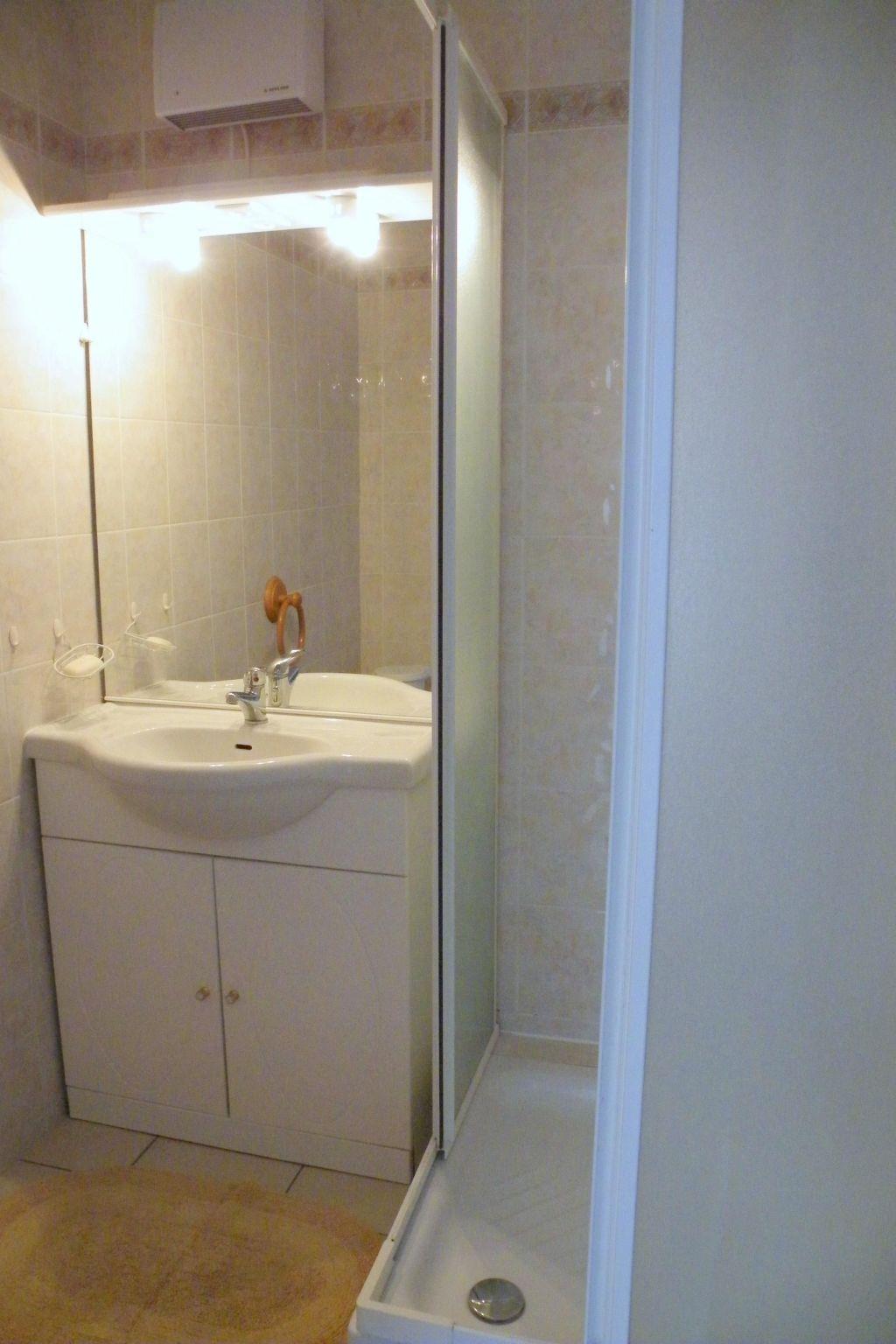 The flat has two entrances: one from the 40 m² courtyard, the other from the central square of the holiday home. There are two bedrooms, one with a 140 cm-wide double bed and the other with two 90 cm-wide single beds. One of the bedrooms overlooks the courtyard and has a French window, and is air-conditioned. The second bedroom overlooks the central square of the holiday home. The living room has a double sofa bed (140 cm wide when unfolded). The kitchen has a bar separating it from the living room. There is a washing machine, dishwasher, oven, microwave, induction hob, coffee maker, toaster and electric griddle. The bathroom has a hydromassage shower.