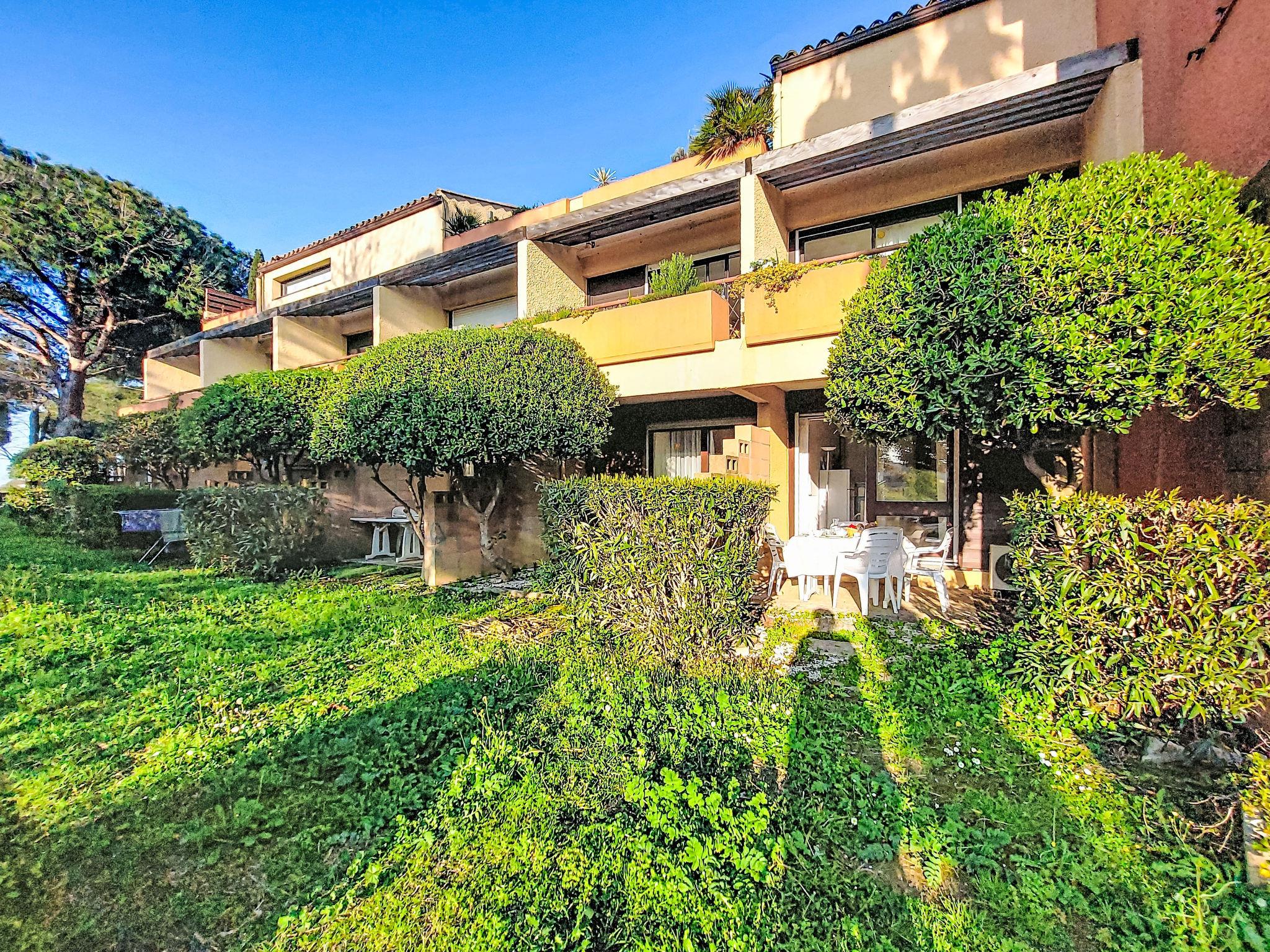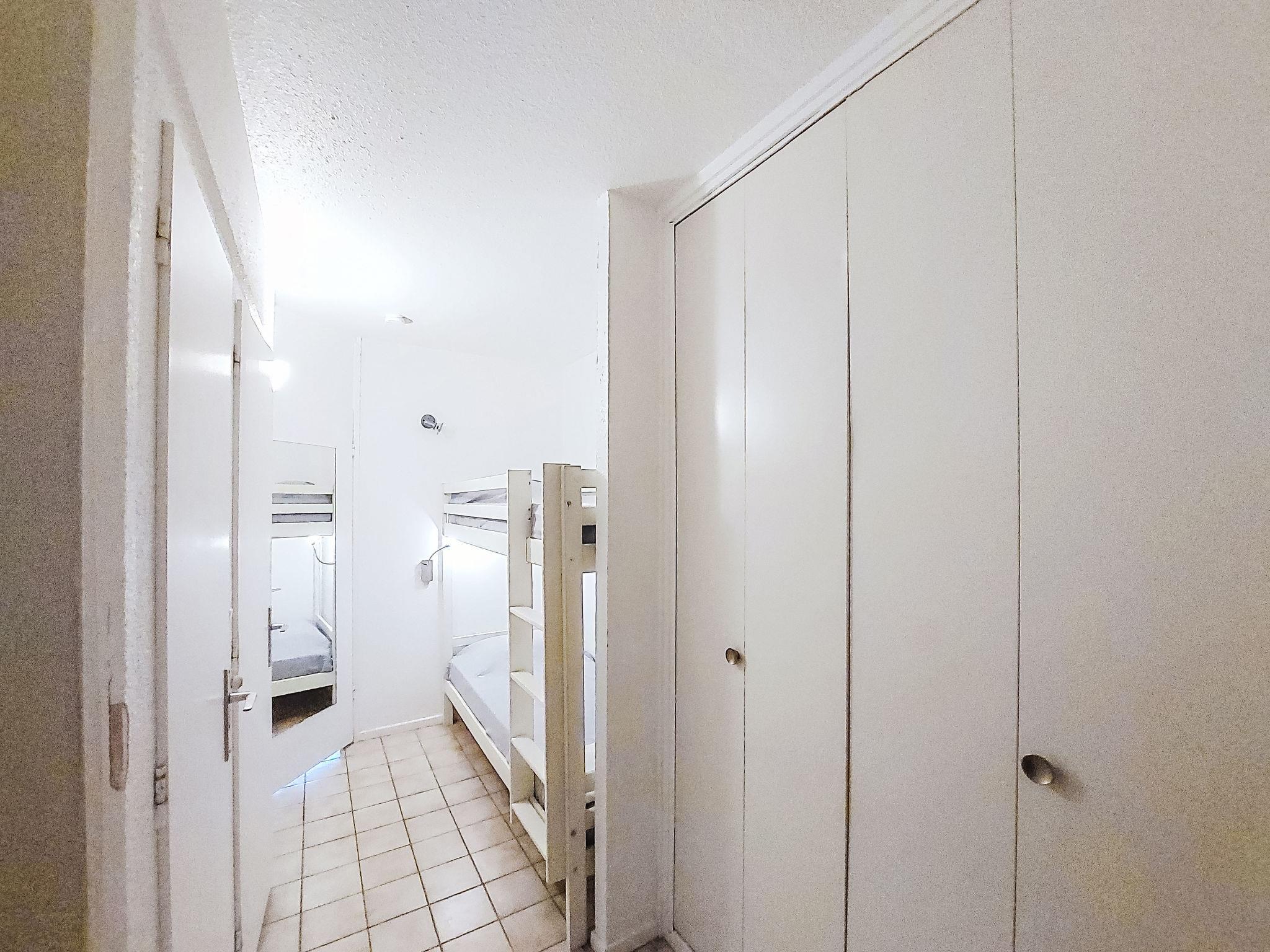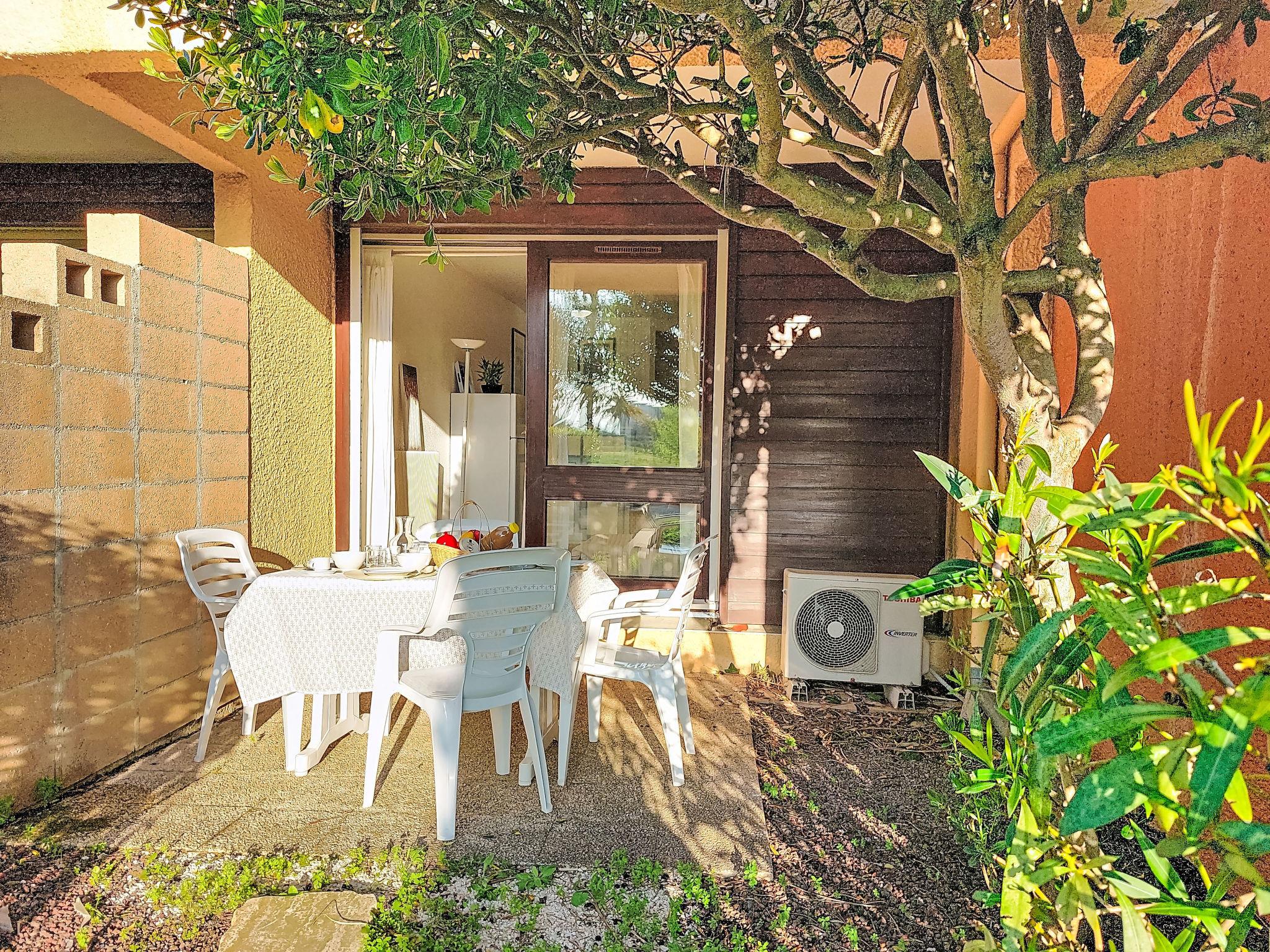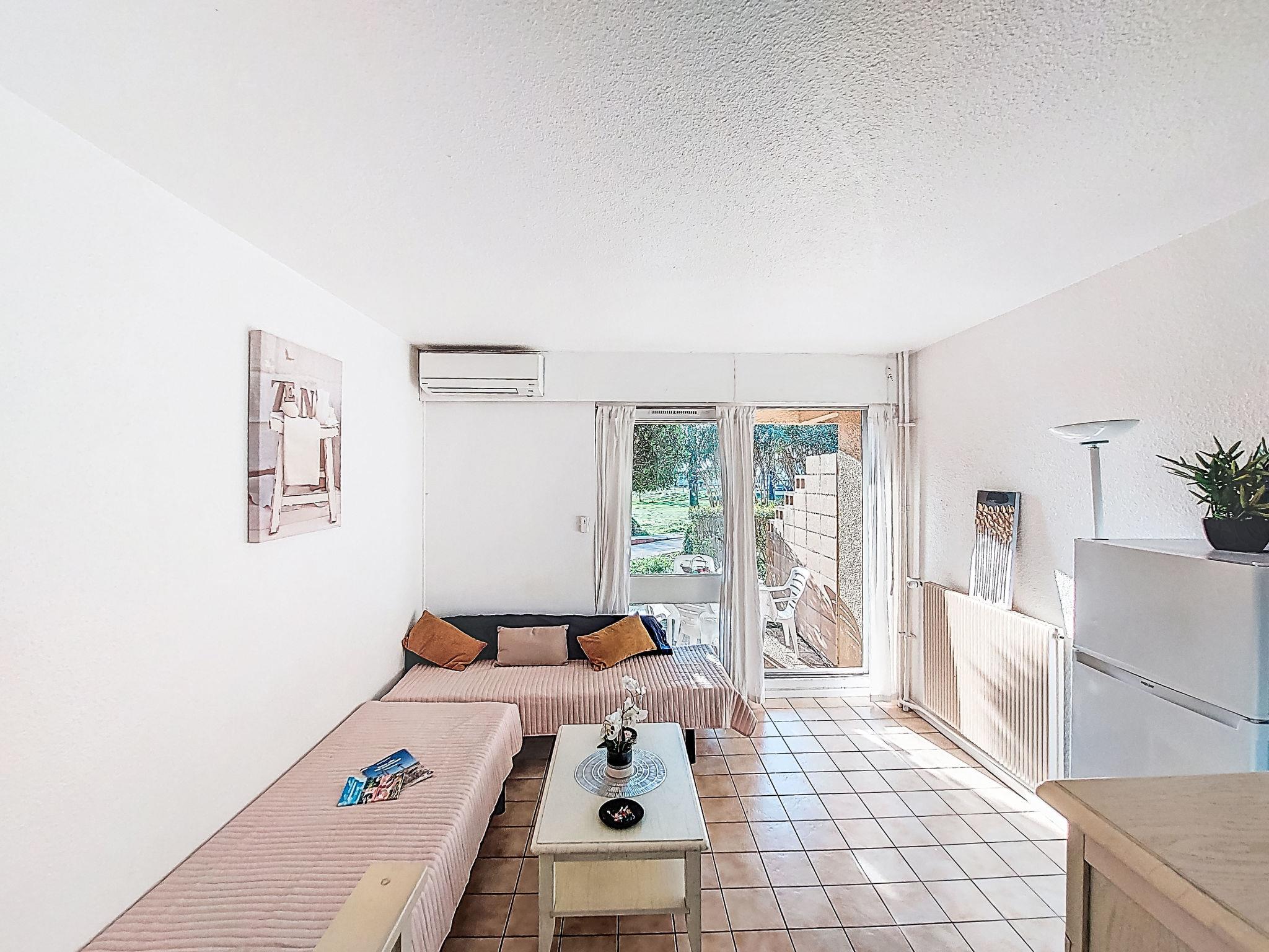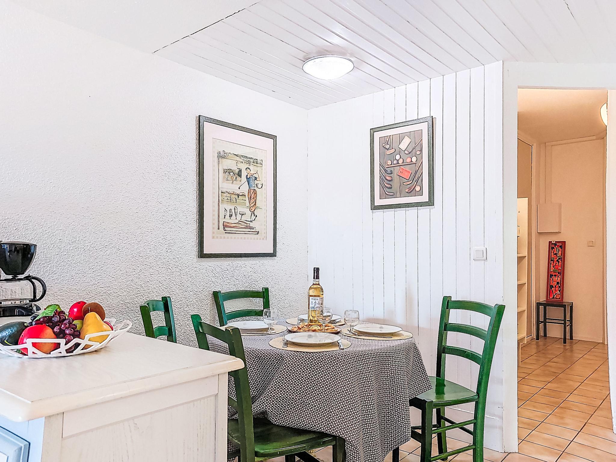 1-room studio 28 m2, on the ground floor. Simple furnishings: entrance hall with 1 x 2 bunk beds (80 cm, length 190 cm). Living/dining room with 2 beds (80 cm, length 190 cm), TV (flat screen), air conditioning. Exit to the terrace. Kitchenette (3 ceramic glass hob hotplates, toaster, kettle, microwave, freezer, electric coffee machine). Bathroom, sep. WC. Heating. Terrace 10 m2, north-west facing position. Terrace furniture. View of the garden and golf course. Facilities: washing machine. Internet (WiFi, extra). Please note: non-smokers only. Maximum 1 small pet/ dog allowed. Smoke alarm. Offer by a private individual according to Art. 155, IV of CGI.