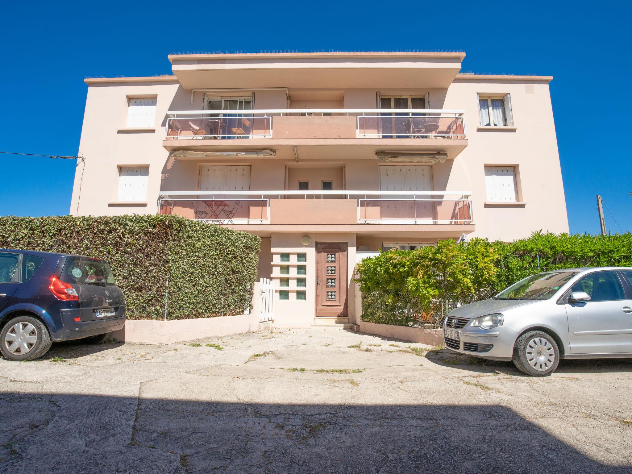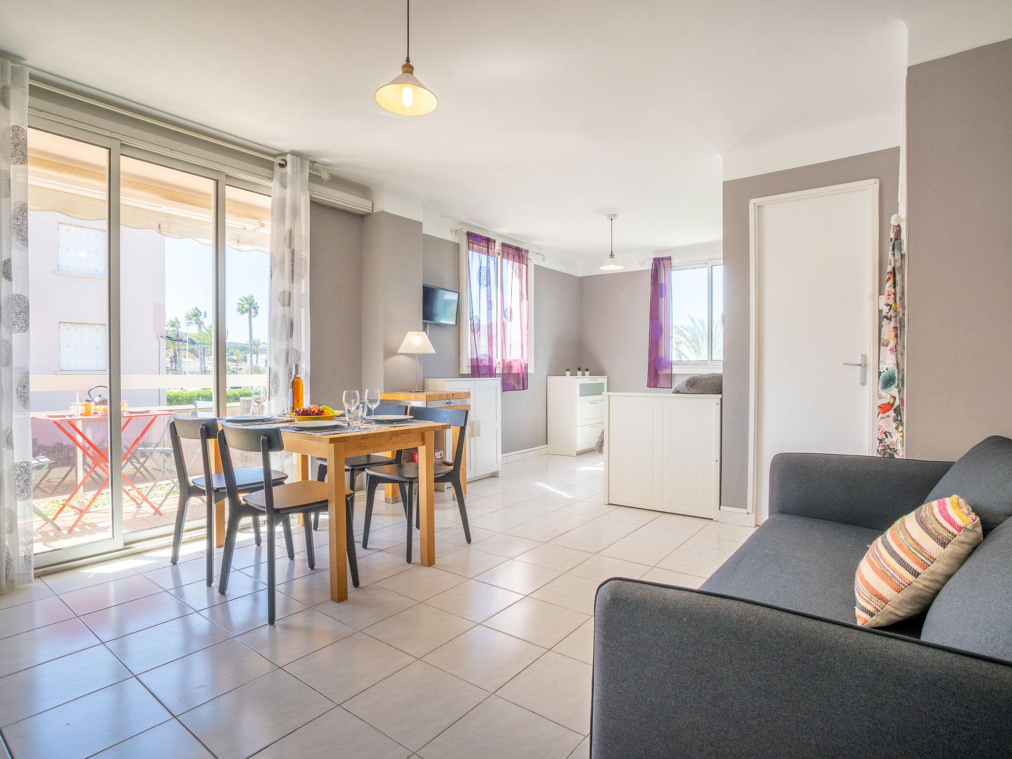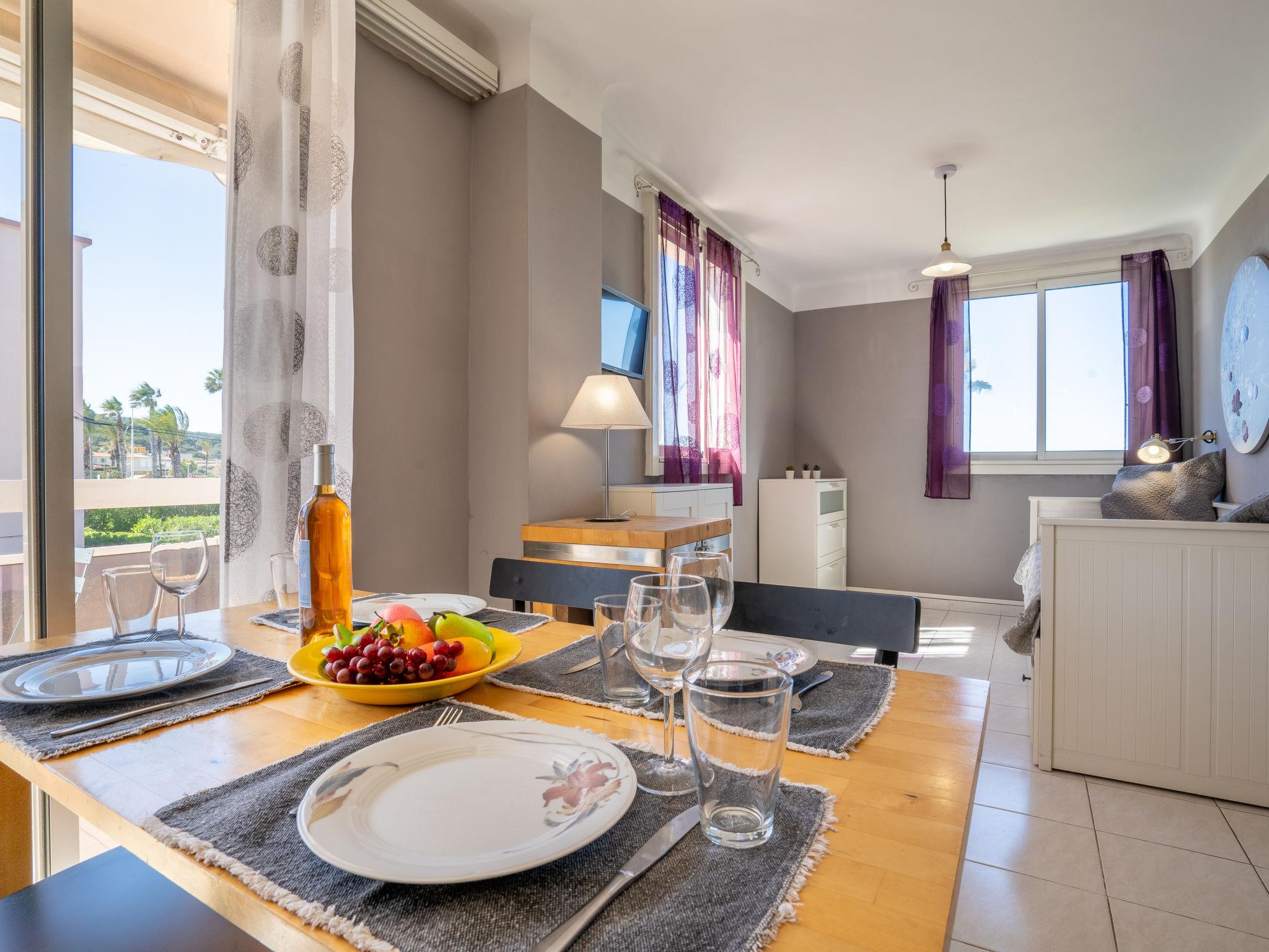 1-room apartment 30 m2 on 1st floor. Simple furnishings: living/dining room with 1 pull-out bed (2 x 80 cm, length 200 cm), TV. Exit to the terrace. Kitchenette (2 ceramic glass hob hotplates, toaster, kettle, microwave, freezer, electric coffee machine, Capsules for coffee machine (Senséo) extra). Shower/WC. Electric heating. Terrace 5 m2, roofed, south-east facing position. Terrace furniture. Side view of the sea. Facilities: washing machine, iron. Internet (WiFi, extra). Parking space n 5. Please note: maximum 1 pet/ dog allowed. TV only FR. Smoke alarm. 83112 000179 QU
