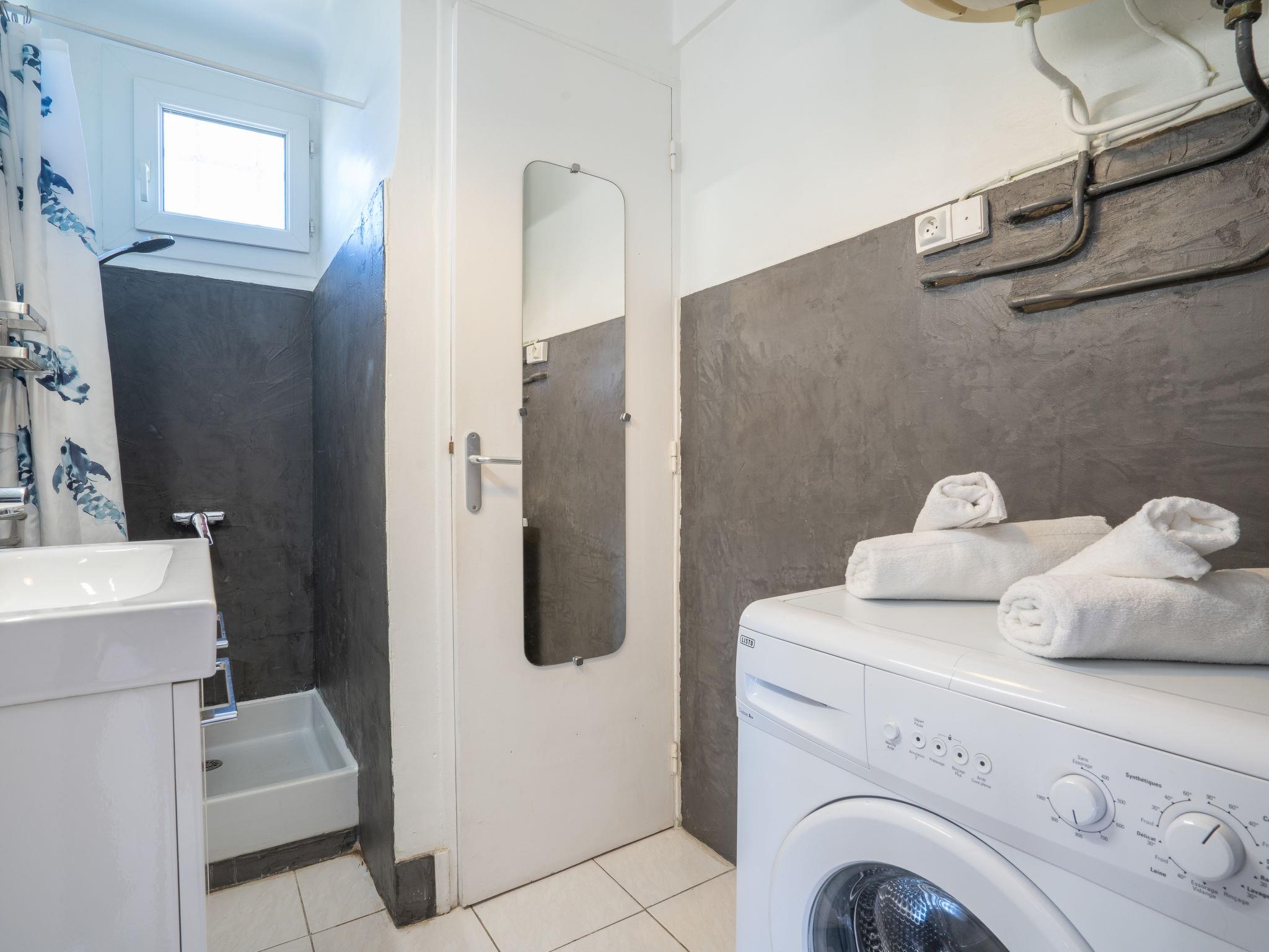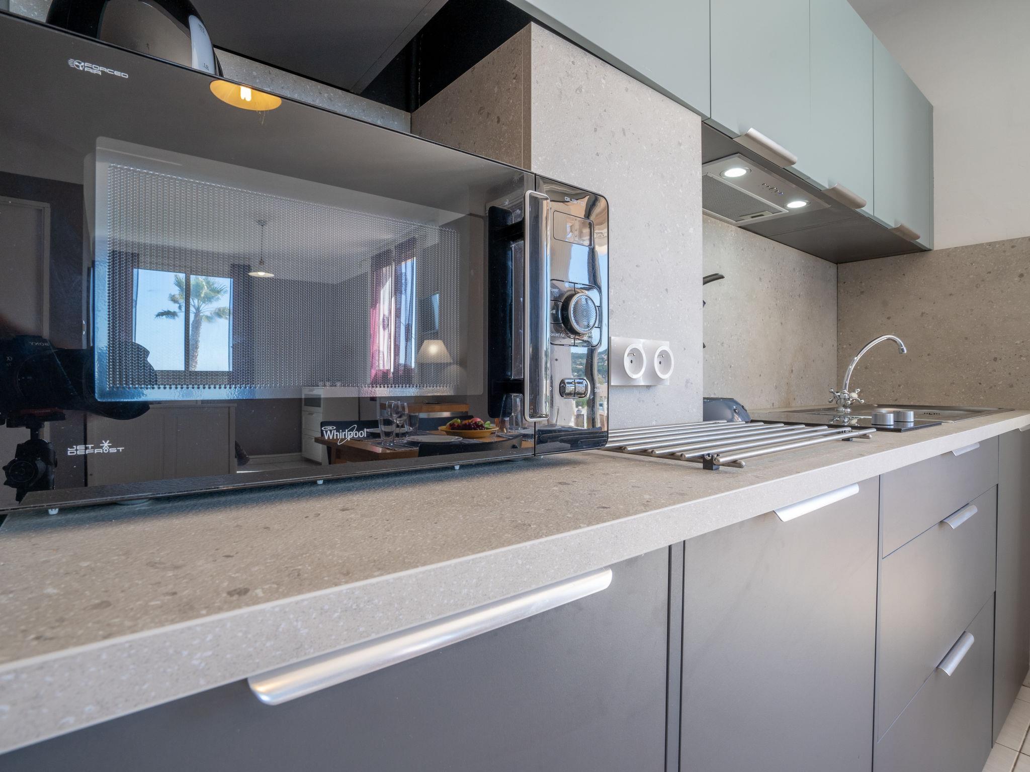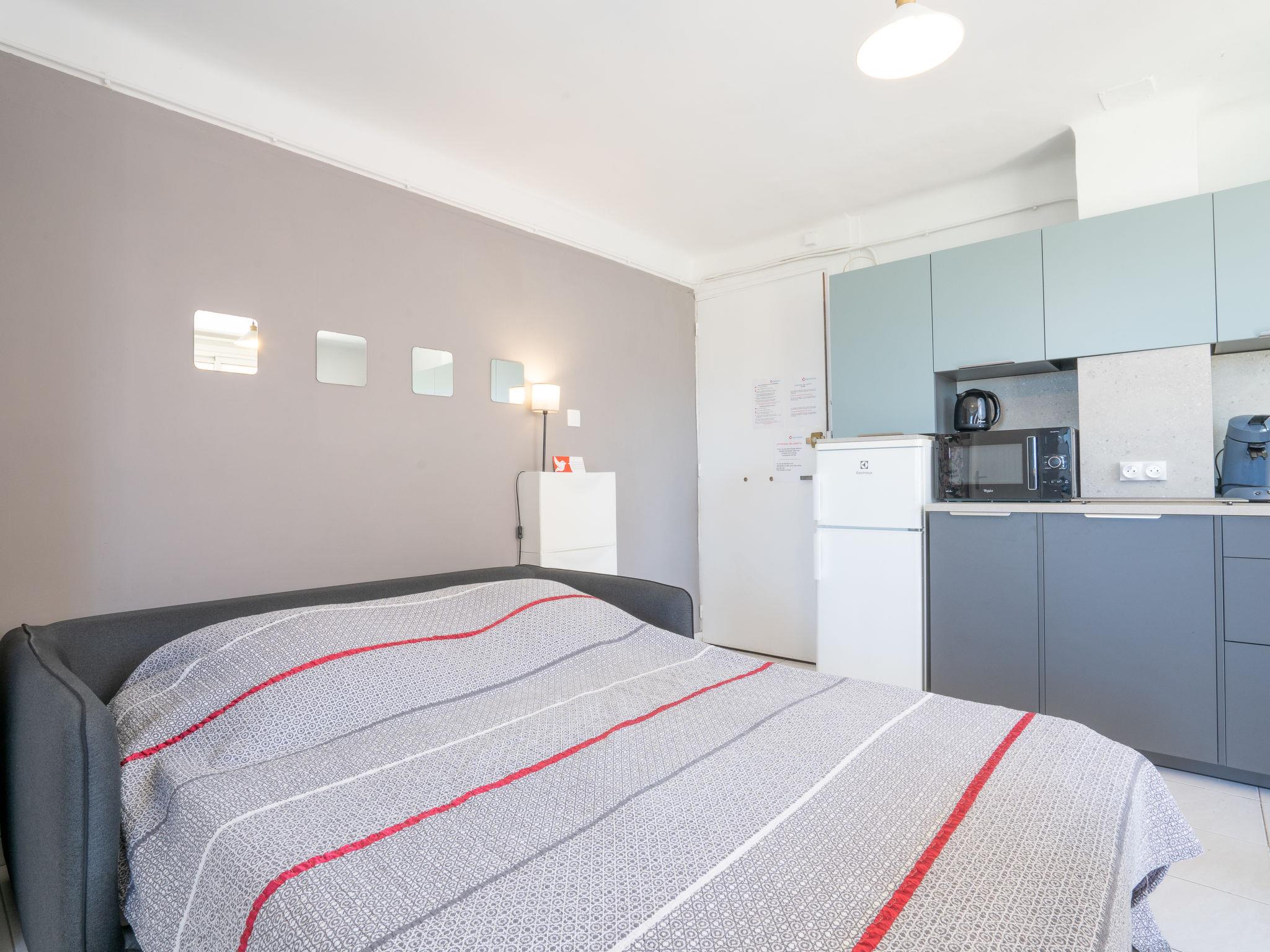 1-room apartment 30 m2 on 1st floor. Simple furnishings: living/dining room with 1 pull-out bed (2 x 80 cm, length 200 cm), TV. Exit to the terrace. Kitchenette (2 ceramic glass hob hotplates, toaster, kettle, microwave, freezer, electric coffee machine, Capsules for coffee machine (Senséo) extra). Shower/WC. Electric heating. Terrace 5 m2, roofed, south-east facing position. Terrace furniture. Side view of the sea. Facilities: washing machine, iron. Internet (WiFi, extra). Parking space n 5. Please note: maximum 1 pet/ dog allowed. TV only FR. Smoke alarm. 83112 000179 QU