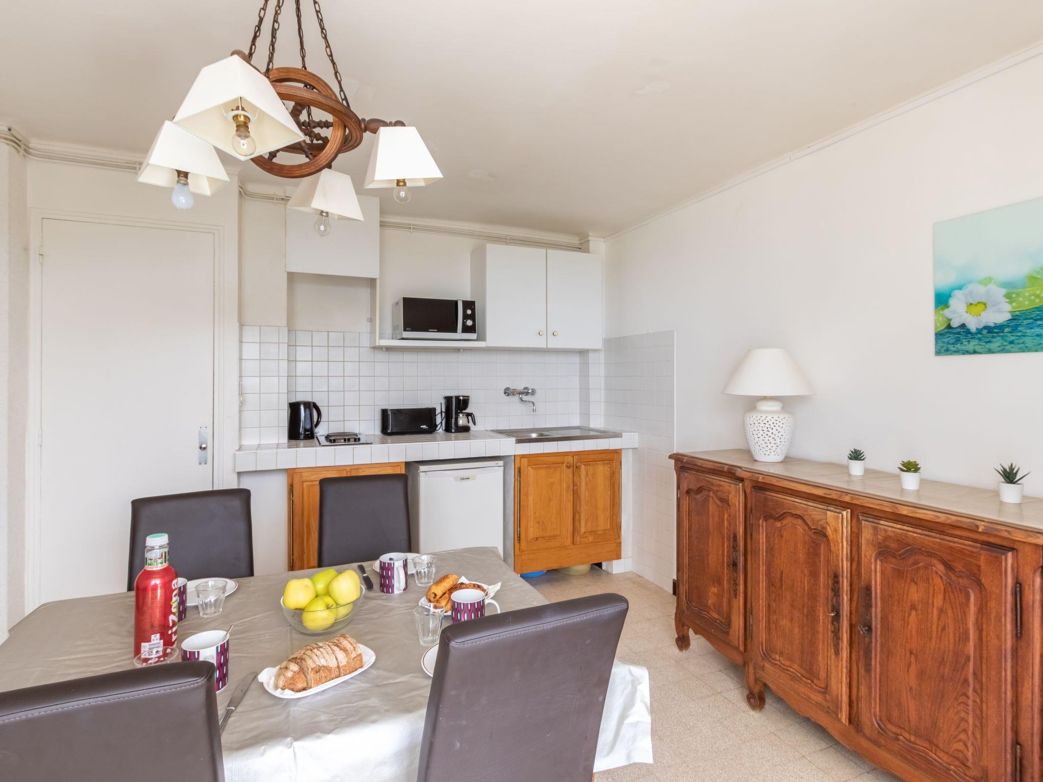 3-room apartment 52 m2 on 1st floor. Simple and practical furnishings: living/dining room with TV (flat screen). Exit to the terrace. 1 room with 2 beds (80 cm, length 190 cm). 1 room with 1 french bed (140 cm, length 190 cm). Kitchenette (2 hot plates, toaster, kettle, microwave, electric coffee machine). Shower, sep. WC. No heating option. Terrace 6 m2, south-west facing position. Terrace furniture. View of the sea. Facilities: Internet (WiFi, extra). Parking (1 car). Please note: not suitable for children under 3 years. TV only FR. Smoke alarm. 8311200068401