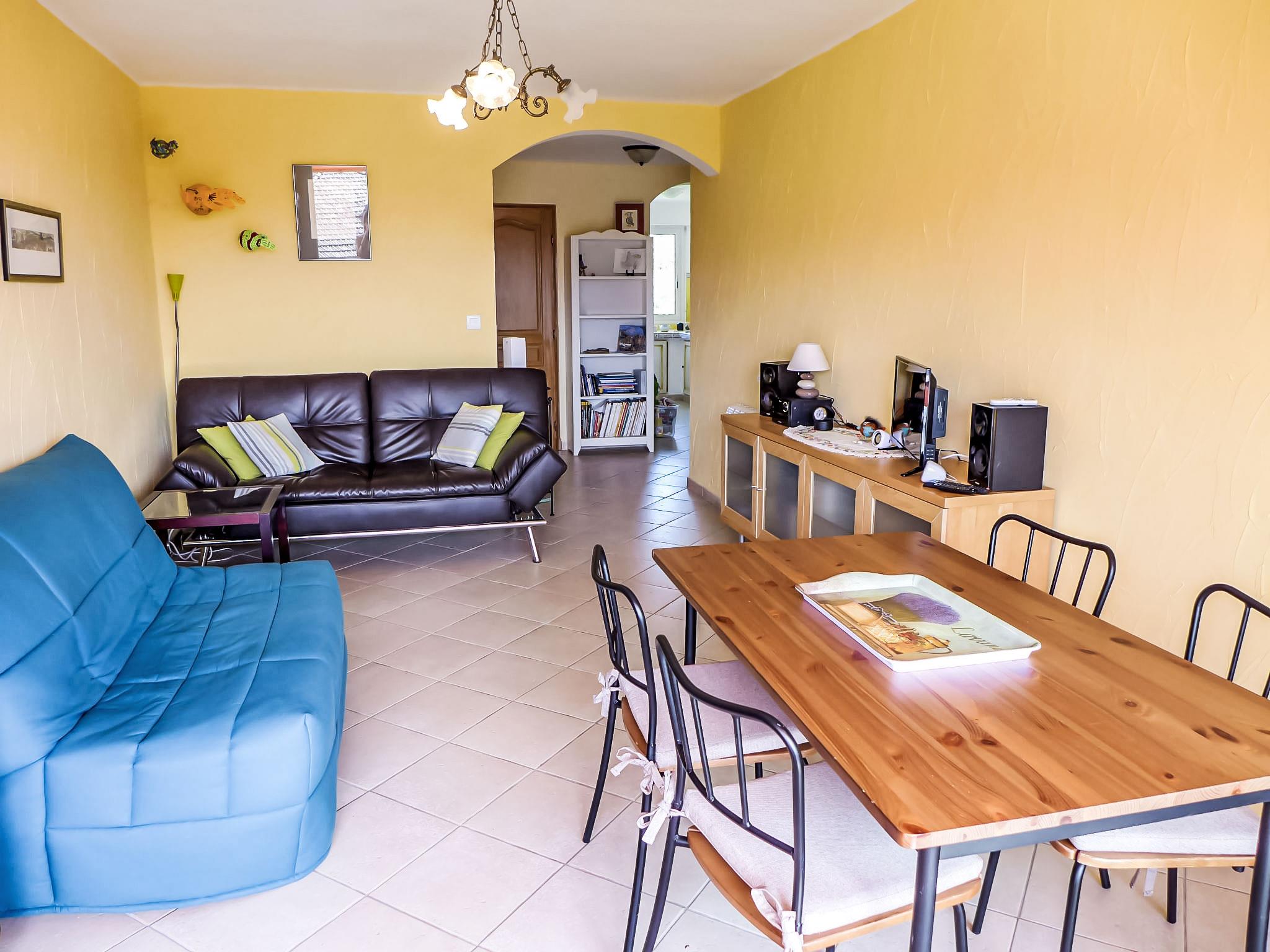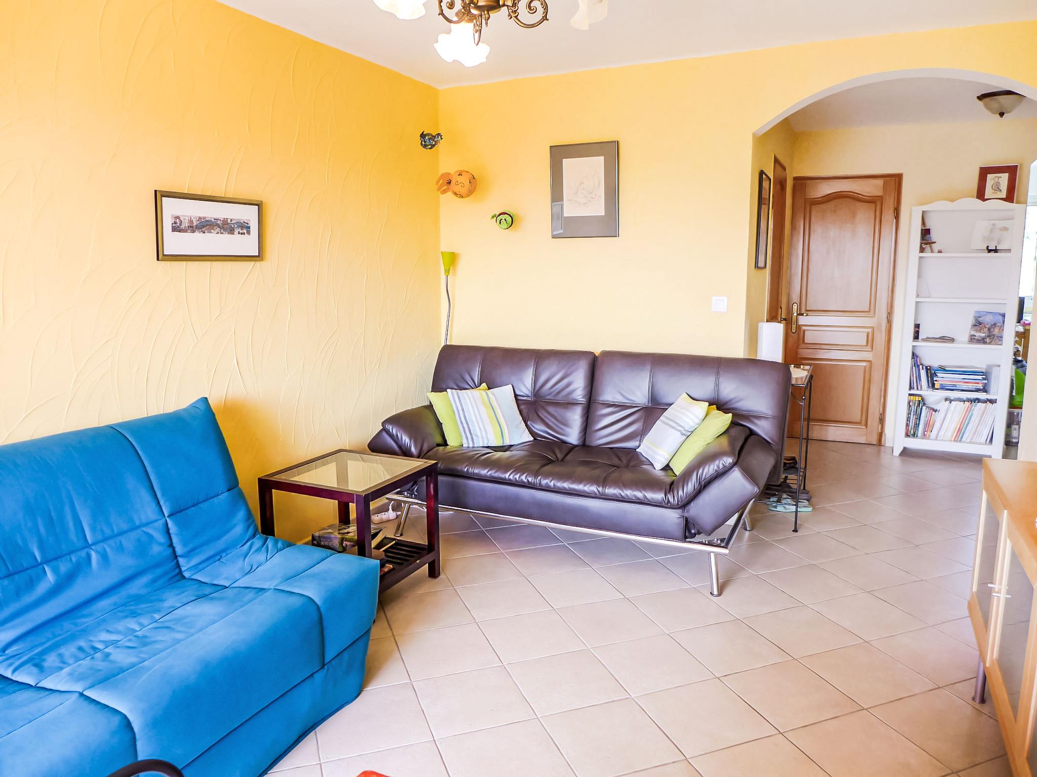 2-room apartment 45 m2 on 3rd floor. Bright, beautiful furnishings: living/dining room with 1 double sofabed (140 cm, length 200 cm), TV and international TV channels (flat screen), hi-fi system, DVD and air conditioning. Exit to the terrace. 1 room with 1 french bed (140 cm, length 190 cm). Open kitchen (oven, dishwasher, 3 induction hot plates, toaster, kettle, freezer, electric coffee machine). Shower, sep. WC. Electric heating. Terrace 5 m2, roofed, south-west facing position. Terrace furniture. Facilities: washing machine, iron. Internet (WiFi, extra). Parking space n 21. Please note: non-smokers only. Smoke alarm, no lift. 83112 000070 S5
