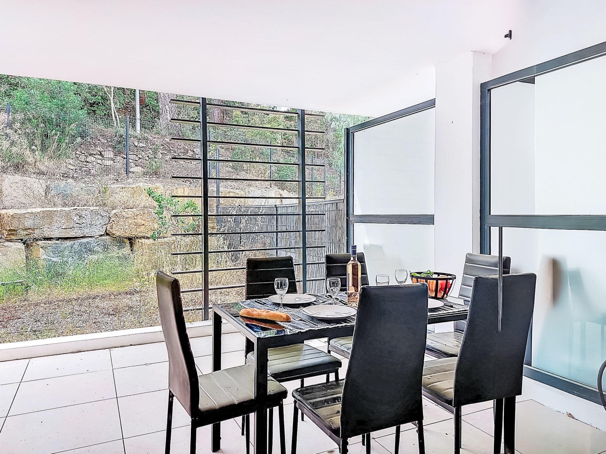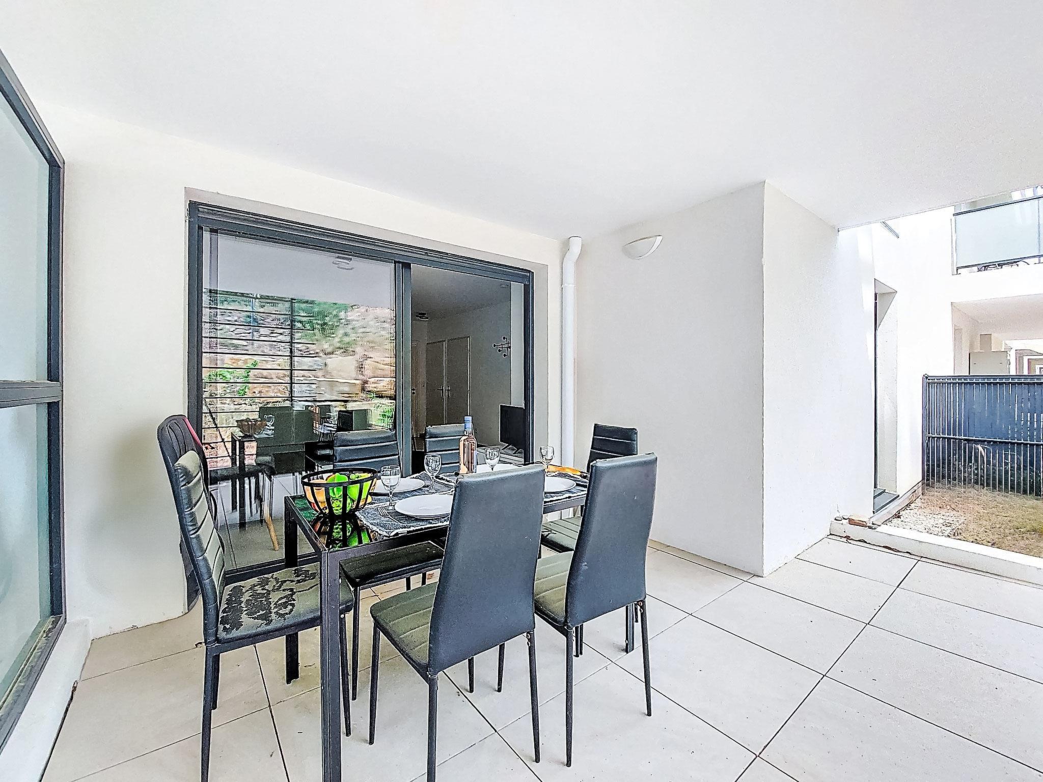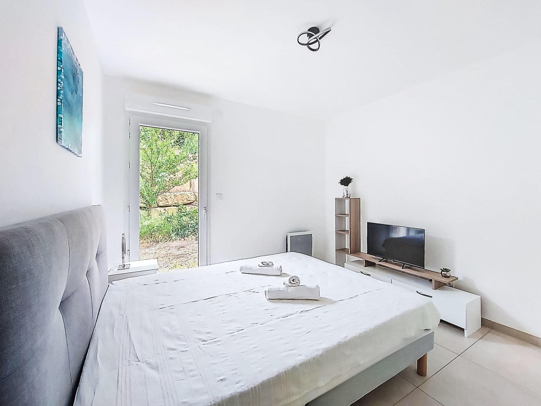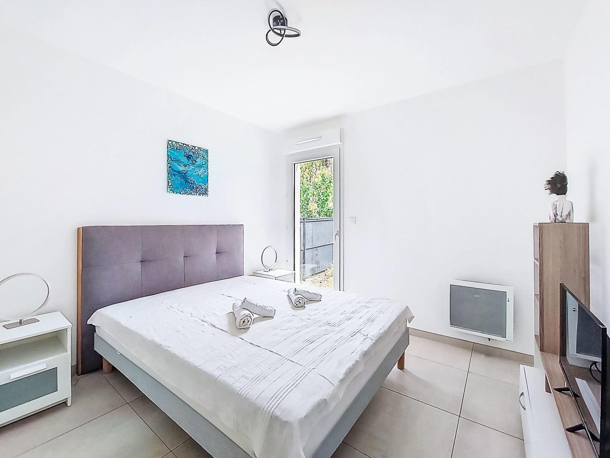2-room apartment 41 m2, on the upper ground floor. Bright, comfortable and beautiful furnishings: living/dining room with 1 sofabed (140 cm, length 190 cm), TV (flat screen). Exit to the terrace. 1 room with 1 french bed (140 cm, length 200 cm), TV. Exit to the garden. Open kitchen (oven, dishwasher, 3 induction hot plates, toaster, kettle, freezer, electric coffee machine, Capsules for coffee machine (Nespresso) extra). Shower, sep. WC. Electric heating. Terrace 13 m2, garden 34 m2. Terrace furniture. Facilities: washing machine. Internet (WiFi, extra). Parking space n 18 (roofed, 1 car). Please note: non-smokers only. TV only FR. Smoke alarm. Offer by a private individual according to Art. 155, IV of CGI. 83112001752EZ