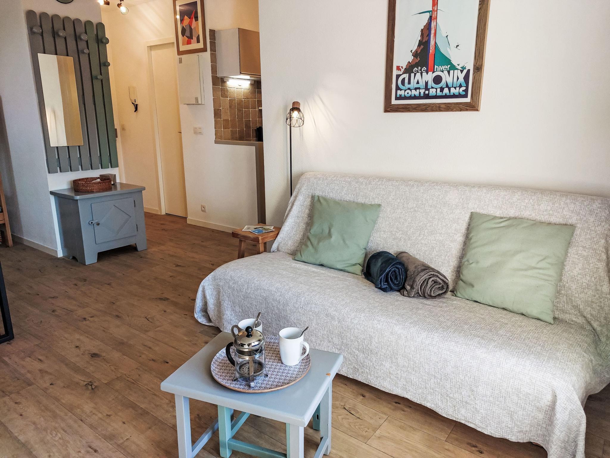 "La Comtesse 28", 1-room studio 30 m2 on 3rd floor. Renovated: living/dining room with 1 x 2 bunk beds (80 cm, length 200 cm), TV (flat screen). Exit to the balcony. 1 small room 6 m2 with 1 french bed (140 cm). Kitchenette (mini-oven, oven, dishwasher, 2 ceramic glass hob hotplates, toaster, kettle, electric coffee machine, Capsules for coffee machine (Nespresso)). Shower/WC. Electric heating. Balcony 4 m2, west facing position. Balcony furniture. Very beautiful view of the mountains. Facilities: washing machine. Internet (WiFi, free). Parking space n 134 (roofed, 1 car). Please note: non-smokers only. TV only FR. Smoke alarm. Offer by a private individual according to Art. 155, IV of CGI.