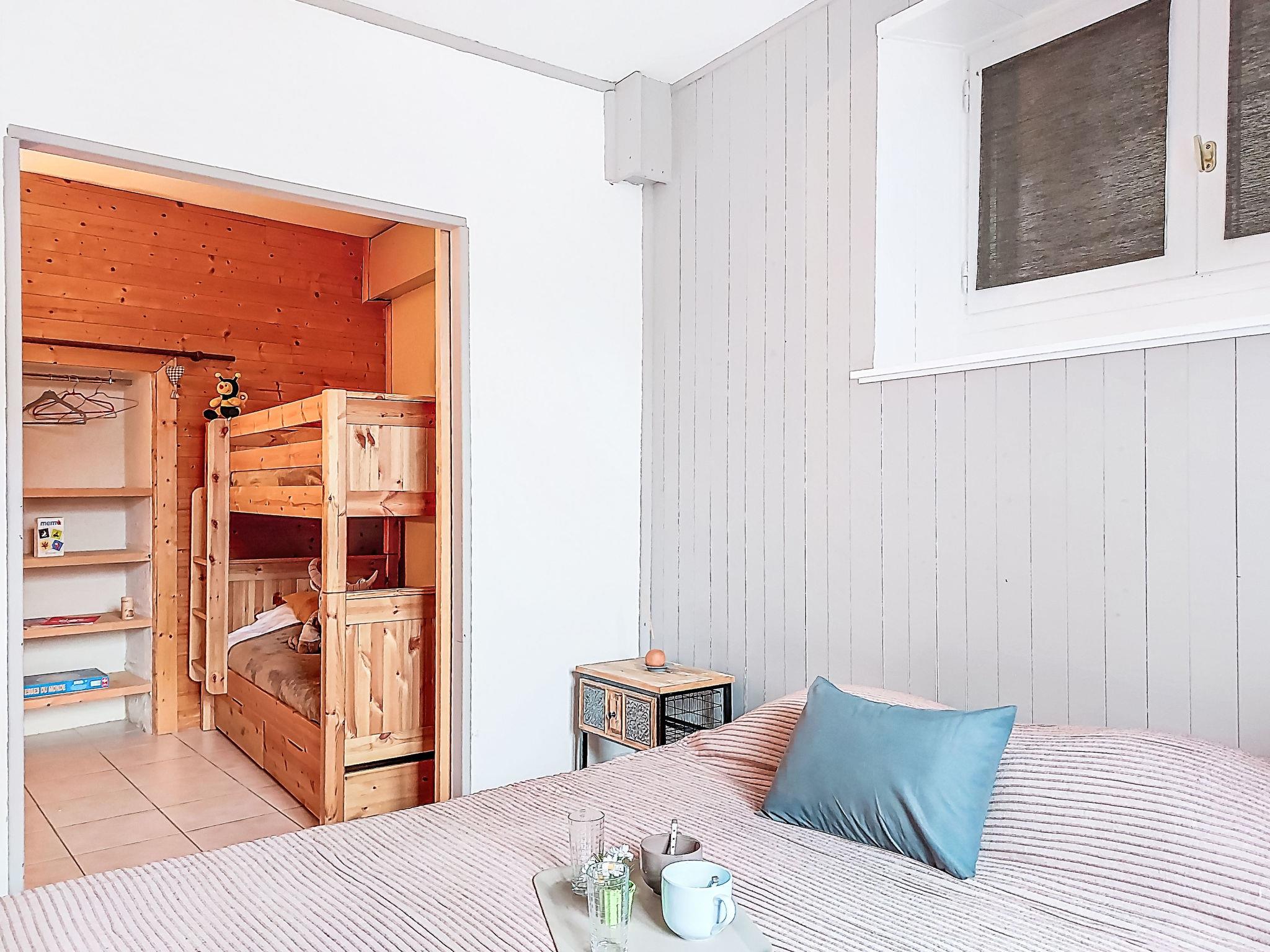 "Namaste", 3-room apartment 60 m2, on the ground floor. Living/dining room with 1 sofabed (140 cm, length 190 cm), TV (flat screen). Walk-through room with 1 french bed (160 cm, length 190 cm). Interconnecting room with 1 x 2 bunk beds (90 cm, length 190 cm). Open kitchen (4 hot plates, oven, toaster, kettle, microwave, freezer, electric coffee machine, Capsules for coffee machine (Nespresso) extra). Hip bath, sep. WC. Electric heating. Facilities: baby cot for up to 3 year olds. Internet (WiFi, extra). Parking (roofed, 1 car). Please note: non-smokers only. Maximum 1 small pet/ dog allowed. TV only FR. Smoke alarm. Offer by a private individual according to Art. 155, IV of CGI.