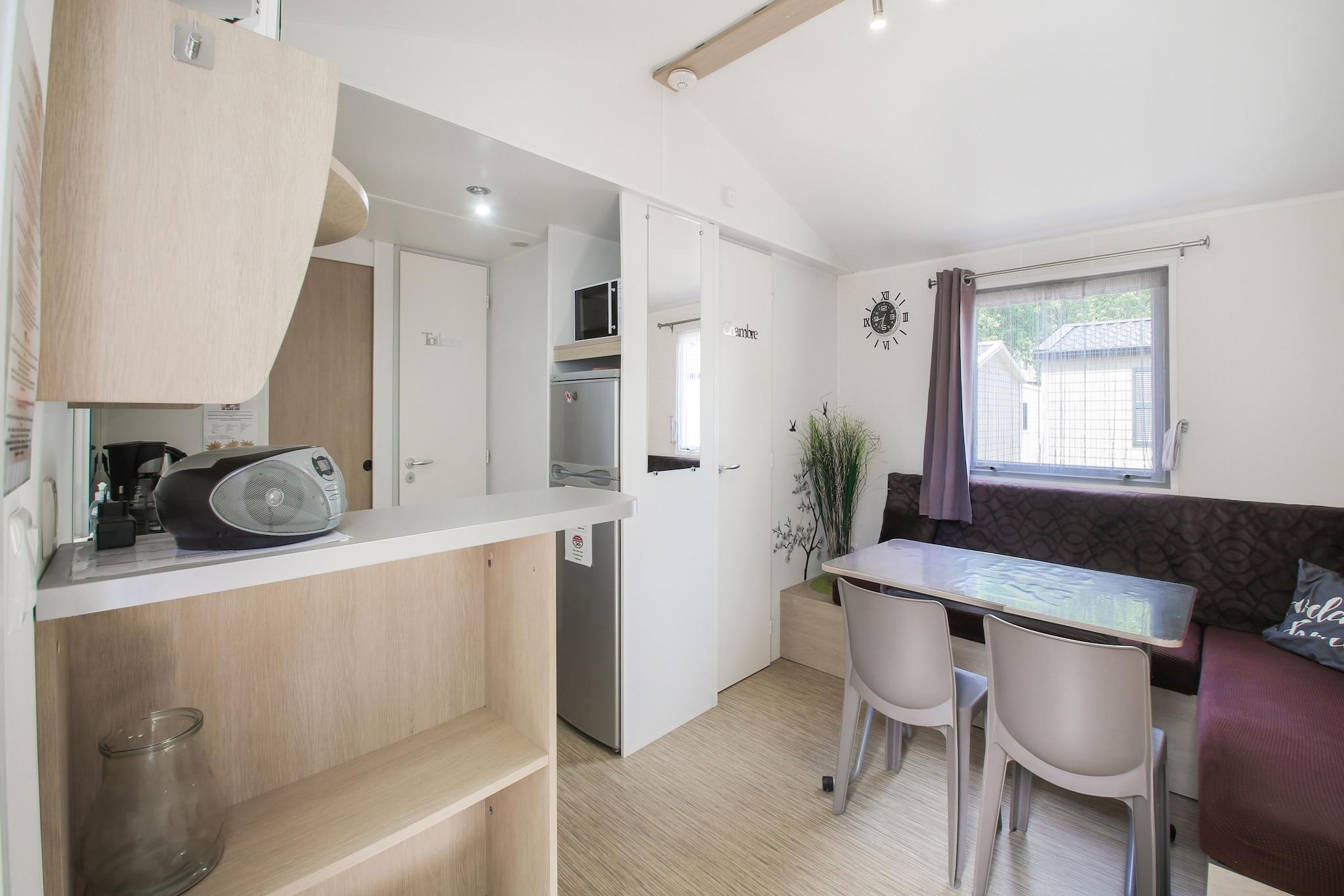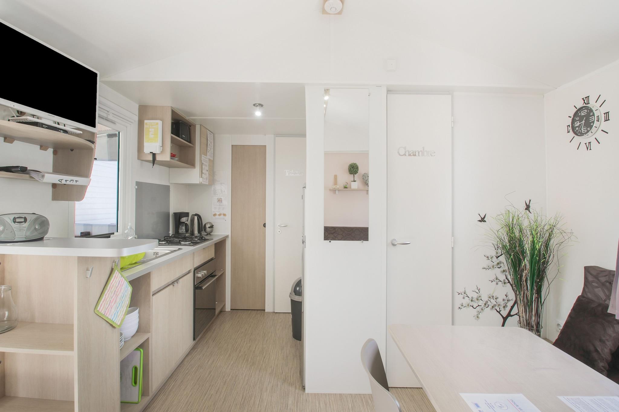 Escape to the beautiful Vendée coast with a stay in this welcoming mobile home, perfectly designed for a group of four. The interior features a bright dining and living area equipped with a TV, a dining table, and a comfortable seating area for planning your next adventure. Year-round comfort is ensured with a heater and a portable air conditioner, while the layout provides both privacy and convenience for couples or small families. The home offers two bedrooms: one with a double bed and a second with two single beds. The heart of the home is the well-equipped kitchen, which includes a refrigerator, microwave, oven, griddle, coffee maker, and kettle, along with all necessary dishes and cutlery. For added practicality, a washing machine is provided. The bathroom is fitted with a shower and sink, complemented by a separate toilet. While free Wi-Fi is available in the campsite's common areas, paid Wi-Fi is available within the mobile home. Guests also have access to the park's shared swimming pools, available from April through early November. Ideally located for explorers, the property features a private, furnished terrace and free on-site parking. Please note that charging electric or hybrid car batteries is strictly prohibited on the campsite. Note: Please note an additional fees are required for pool access badges, optional end-of-stay cleaning (EURO200), or pre-booked linen (EURO20/person) and towel (EURO15/person) rentals; otherwise, guests are responsible for cleaning and providing their own linens. Rental fees apply for linens, towels, and baby cots; optional cleaning is EURO180, and breakfast is available on-site. Pool and activity badges require an extra fee, with a 20% discount if ordered at least 48 hours in advance (children under 4 are free).
