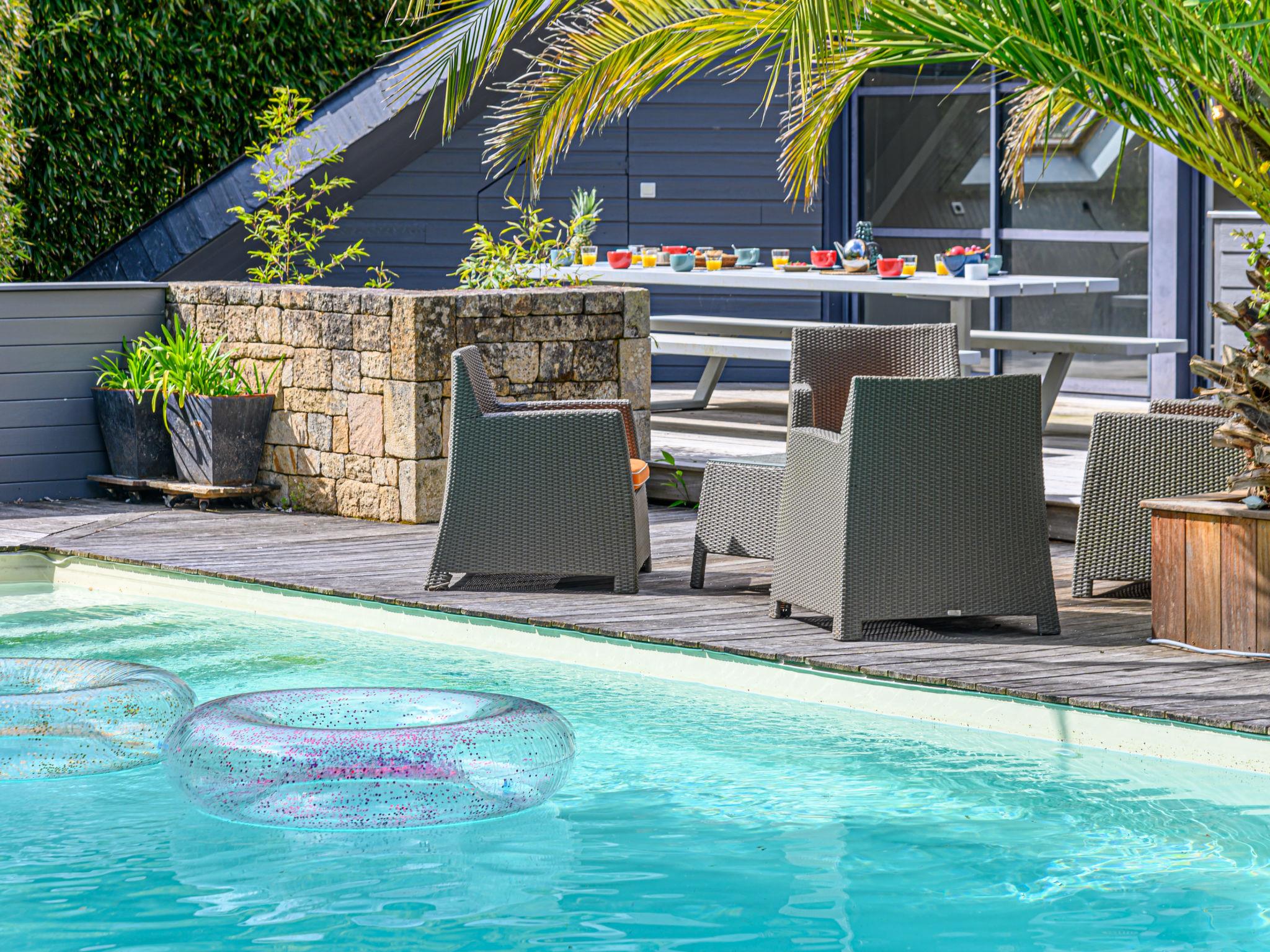Villa "Villa Pyramide II", 3 storeys. Property composed of main house and outbuilding, on the outskirts, 2 km from the centre of Saint-Philibert, 50 m from the sea, from the beach, in a cul-de-sac. For shared use: tennis. Private: well-kept garden 370 m2, swimming pool heated (11 x 5 m, depth 150 - 150 cm, seasonal availability: 11.May. - 15.Oct.) with internal staircase and alarm system. Parking (for 5 cars) at the house. Grocery 2 km, restaurant 2 km, bakery 2000 km, café 2 km, sandy beach "Kernevest" 900 m. Sports harbour 1.5 km, golf course (18 hole) 12 km, sailing school 900 m, walking paths from the house 50 m. Nearby attractions: La Trinité-sur-mer 2 km, Carnac et ses alignements 7 km, Auray - Port de St Goustan 15 km, Presqu'île de Quiberon 25 km, Vannes 25 km, Belle-île, Houat et Hoëdic. Hiking paths: Golfe du Morbihan 20 km.