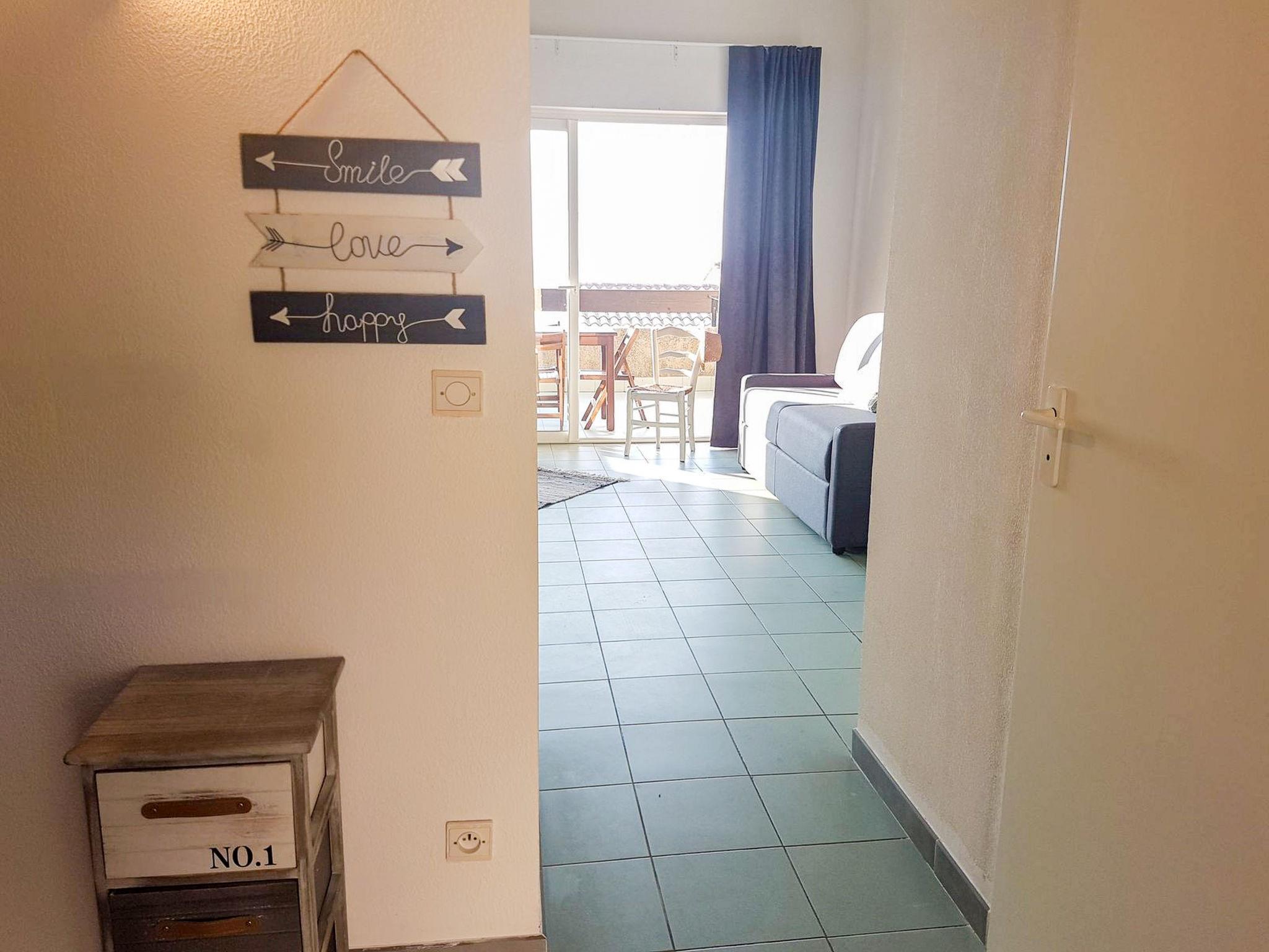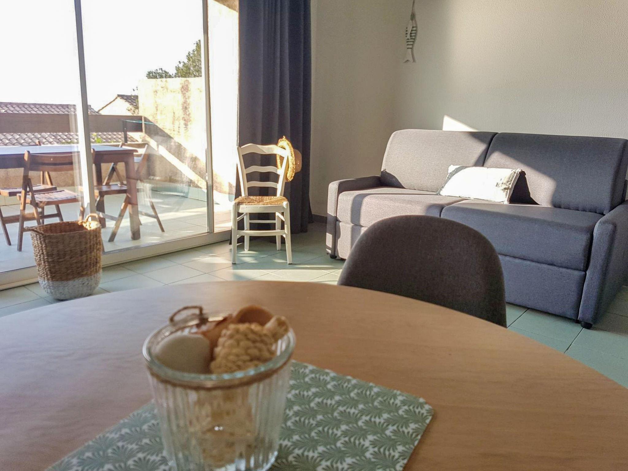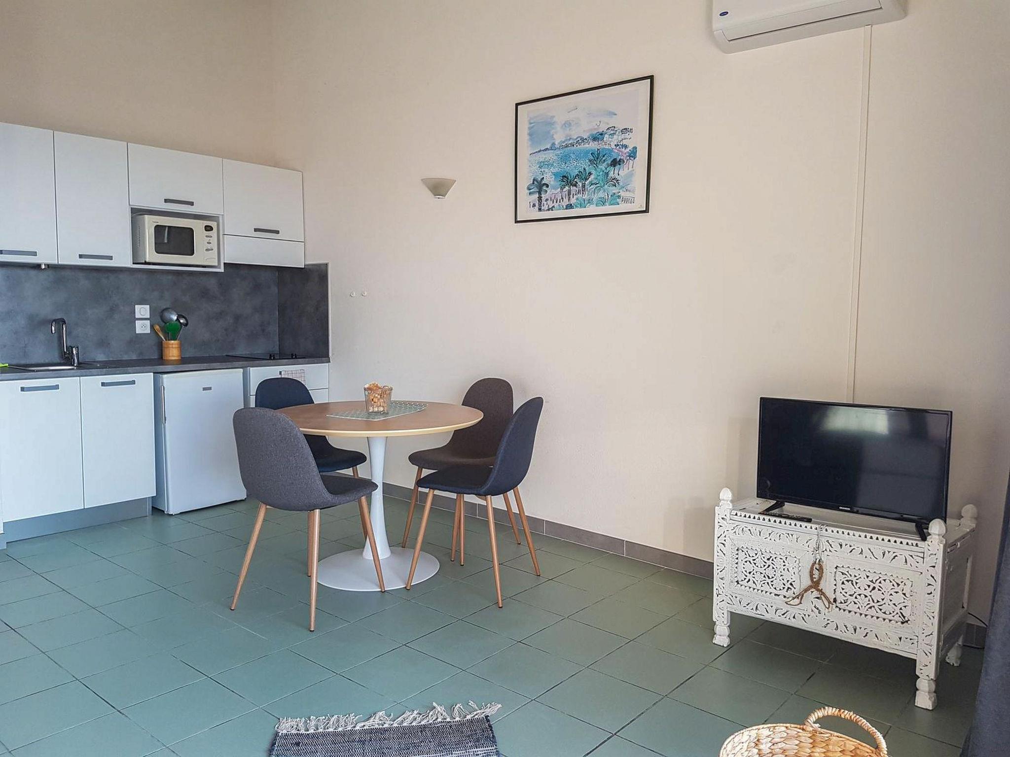 "Studio Cabine", 1-room studio 36 m2. Object suitable for 2 adults + 2 children. Simple and comfortable furnishings: living/sleeping room with 1 double sofabed (140 cm, length 190 cm), dining table and TV (flat screen), air conditioning. Exit to the terrace. Sleeping alcove with 1 x 2 bunk beds (90 cm, length 190 cm). Kitchenette (2 ceramic glass hob hotplates, kettle, microwave, electric coffee machine). Bathroom, sep. WC. Electric heating. Terrace 10 m2. Terrace furniture. View of the sea. Parking at the house. Please note: suitable for families. Non-smokers only. Smoke alarm. Instead of an enclosed bedroom, some sleeping areas are located in an open-plan area (gallery, alcove, etc.). Offer by a commercial proprietor according to Art. 155, IV, CGI