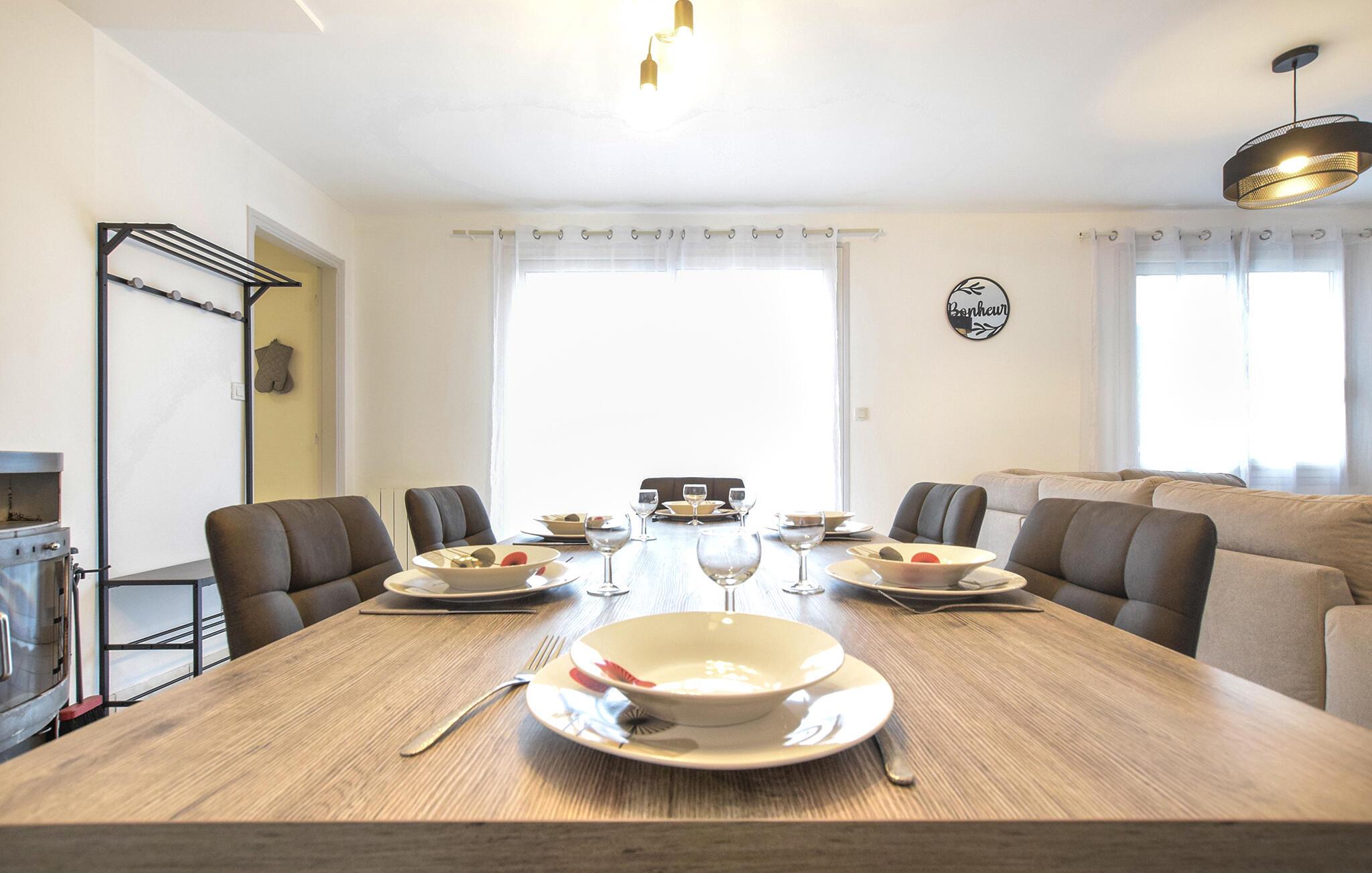 Dieses Haus überzeugt mit einer freundlichen Atmosphäre und einer gelungenen Mischung von modernem Komfort und gemütlichen Akzenten. Spielen Sie am großen Esstisch Karten, während im Hintergrund Ihre Lieblingsmusik läuft und das Feuer im Kaminofen für wohlige Wärme sorgt. Kochen Sie gemeinsam in der Küche, probieren Sie neue Rezepte aus und lassen Sie den Abend in geselliger Runde entspannt ausklingen.