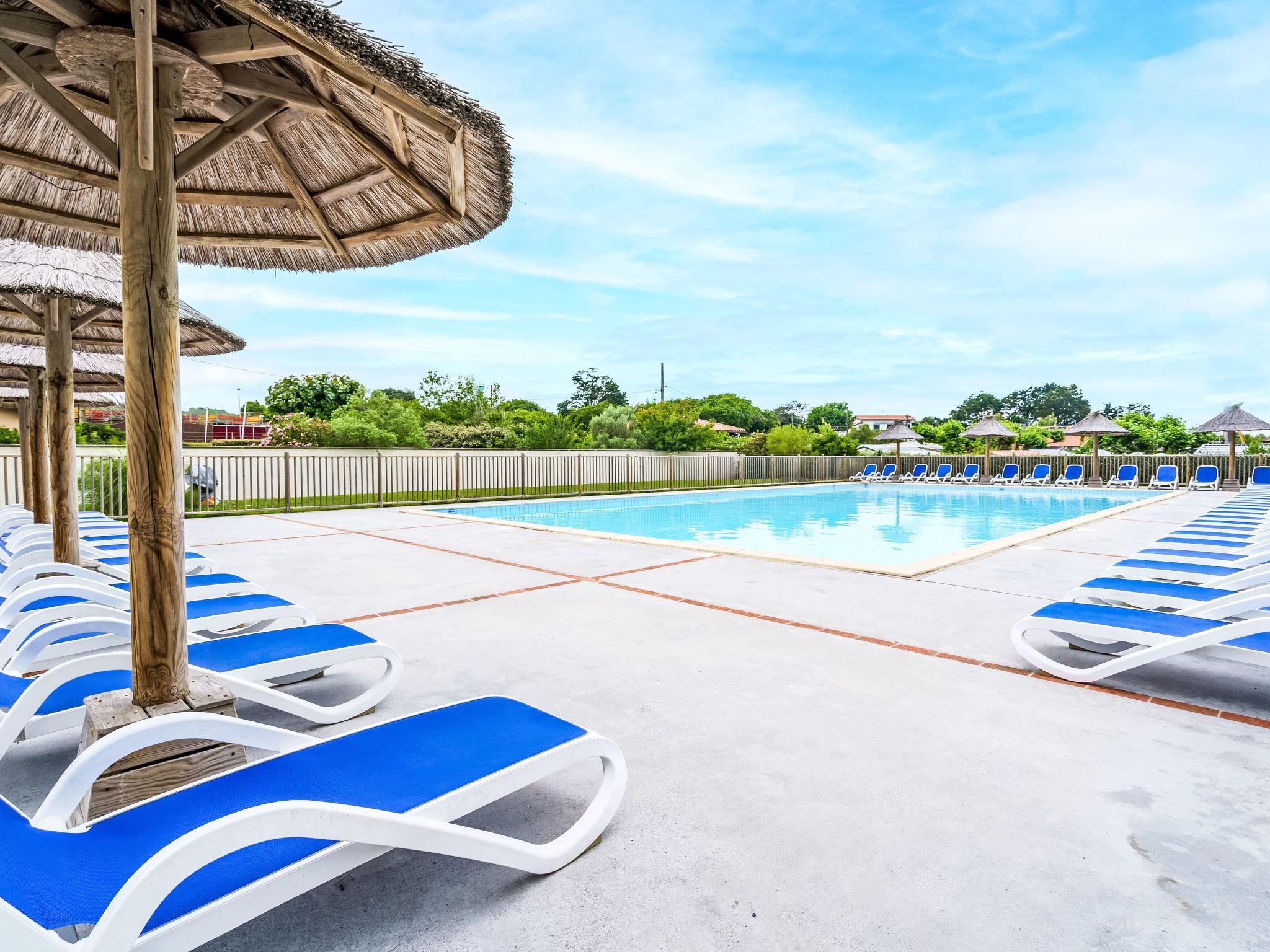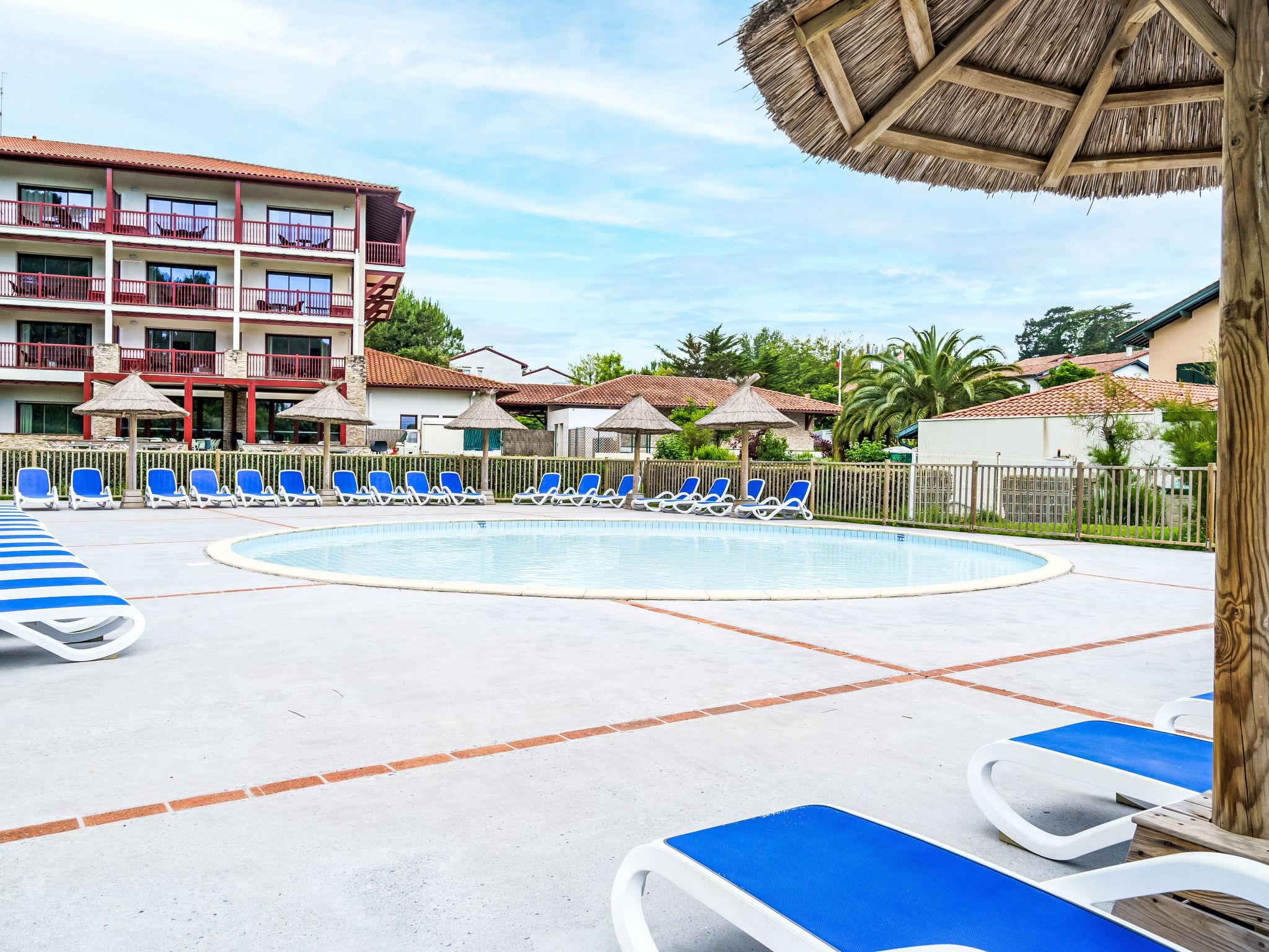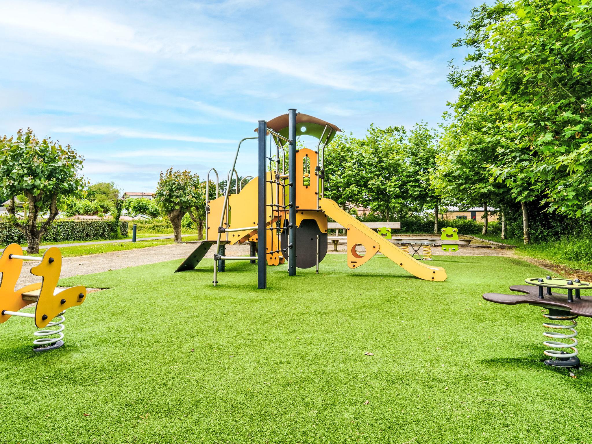 Saint Jean de Luz: Residence "Domaine Iratzia". In the resort 1.9 km from the centre of Saint Jean de Luz, 150 m from the sea, 100 m from the beach, direct access to the beach. For shared use: park, swimming pool heated (seasonal availability: 09.Apr. - 15.Sep.). WC in the pool area, outdoor shower, tennis, table tennis, boccia, children's playground. In the house: tumble dryer (for shared use, extra). Parking, communal covered parking. Shopping centre 3 km, bakery 2 km, pedestrian zone 3 km, 20 minute walk to the centre, bus stop 100 m. Sports harbour 3 km, golf course (18 hole) 4 km, tennis 4 km, riding stable 4 km. Nearby attractions: La Rhune 10 km, Maison de l'Infante 3 km, Ecomusée basque 3 km, Rocher de la Vierge 16 km, Thalasso 2 km. Well-known lakes can easily be reached: Lac de Saint Pée sur Nivelle 15 km.
