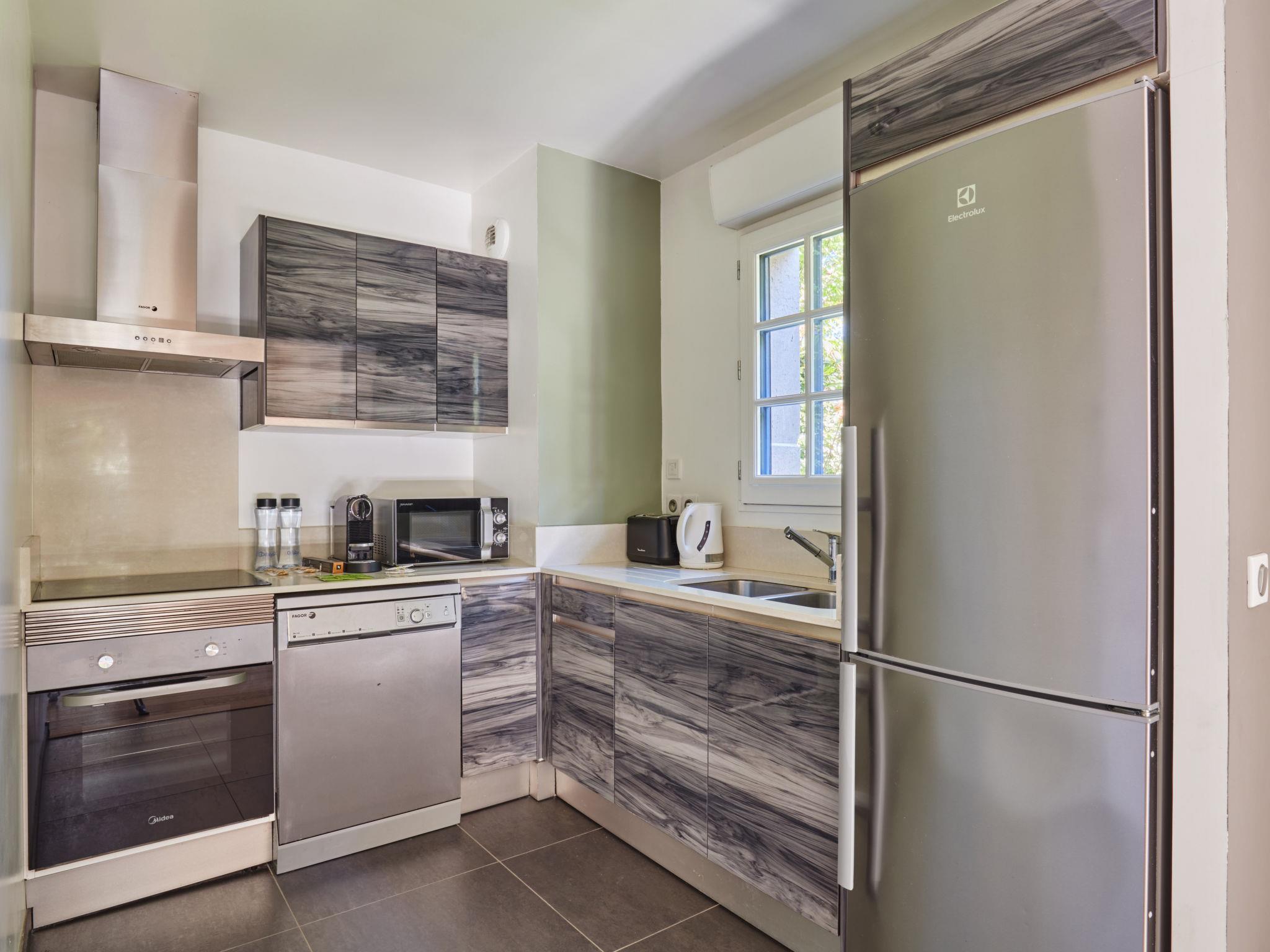 "Villas Odalys Collection Domaine de Lana", 4-room house 75 m2. Modern and tasteful furnishings: living/sleeping room with 1 double sofabed (140 cm, length 190 cm), dining table and TV (flat screen). Exit to the terrace. 1 room with 2 beds (90 cm, length 190 cm). 1 room with 1 french bed (140 cm, length 190 cm). Open kitchen (oven, dishwasher, 3 ceramic glass hob hotplates, toaster, kettle, microwave, freezer, electric coffee machine). Shower, sep. WC, double hand-basin. Gas heating. Terrace, small garden. Terrace furniture. Facilities: washing machine, children's high chair, baby cot. Internet (WiFi, free). Garage. Please note: non-smoking house. Maximum 2 pets/ dogs allowed. Smoke alarm.