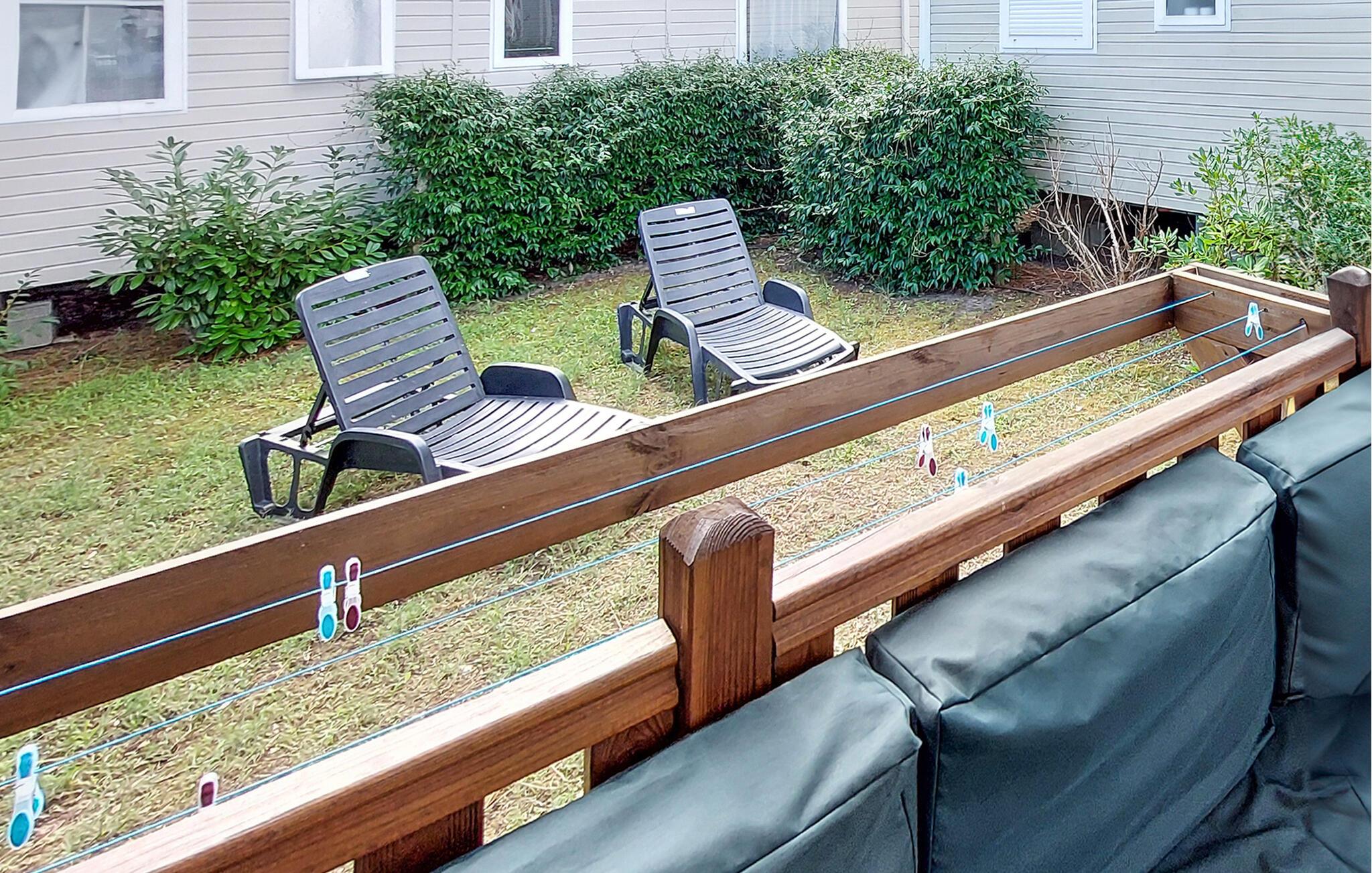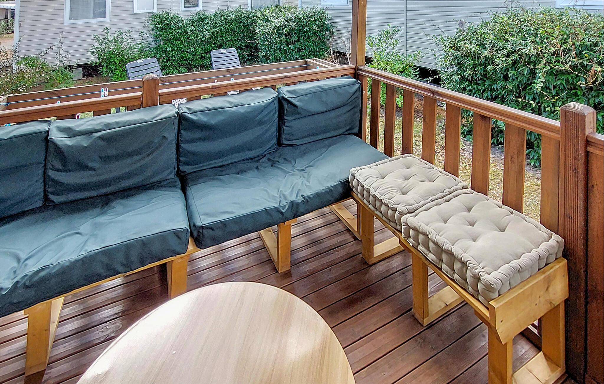 Draußen erwartet Sie eine überdachte Holzterrasse mit gemütlicher Sitzecke. Genießen Sie hier gemeinsame Mahlzeiten im Freien oder entspannte Abende bei einem Glas Wein. Im kleinen Gartenbereich können Sie auf den Sonnenliegen die Ruhe genießen, in Ihrer Urlaubslektüre schmökern oder einfach die Seele baumeln lassen.