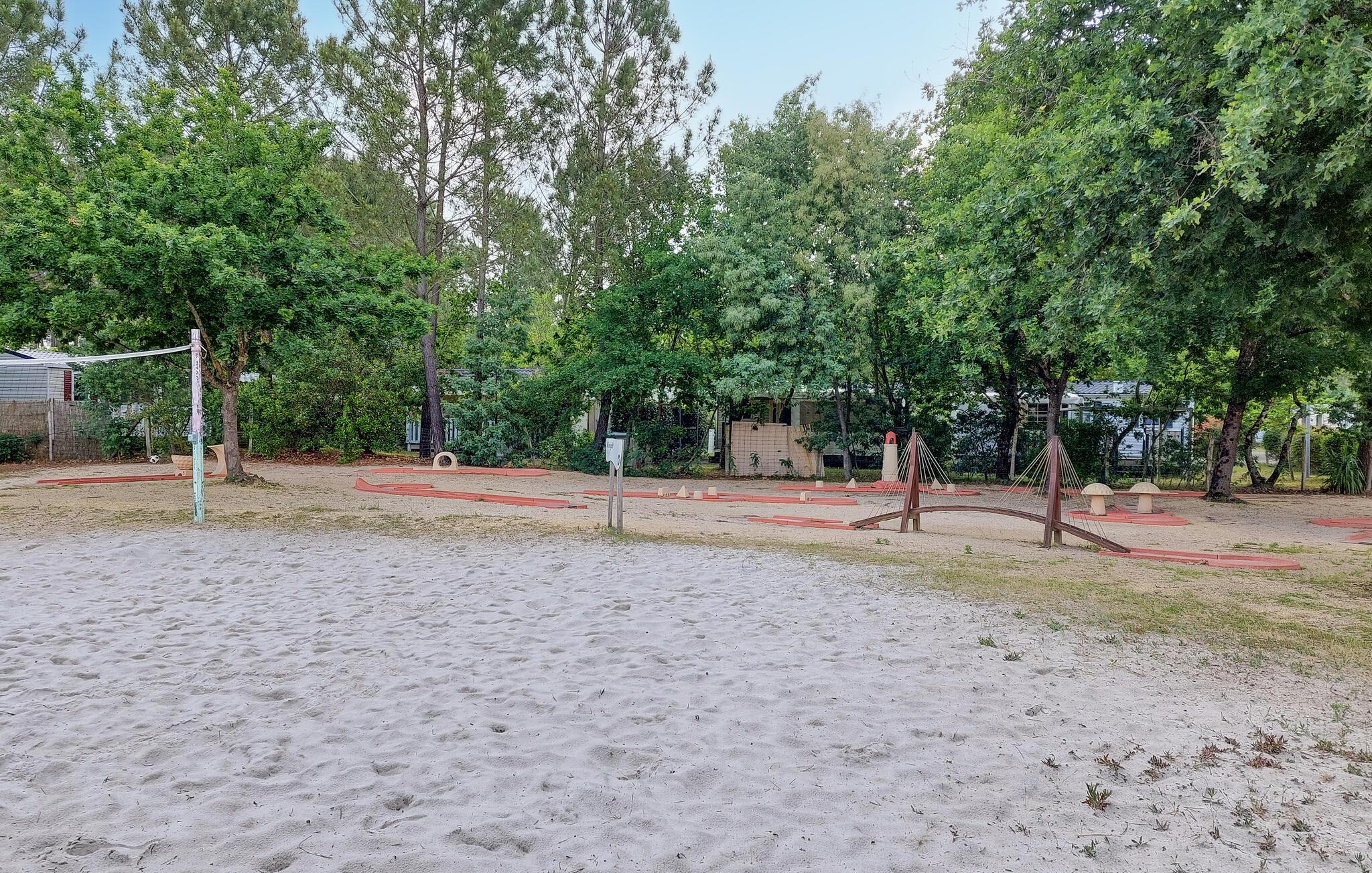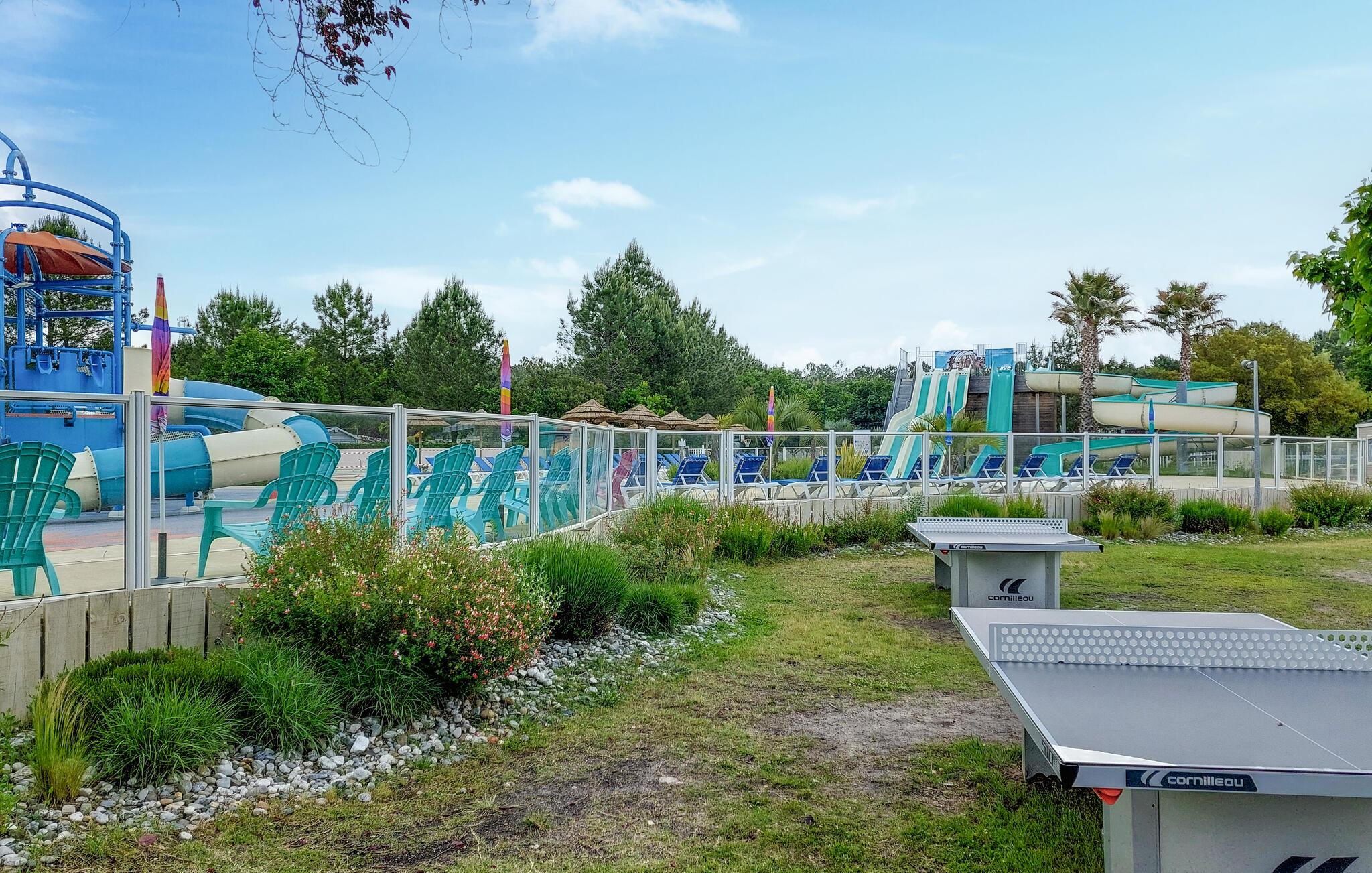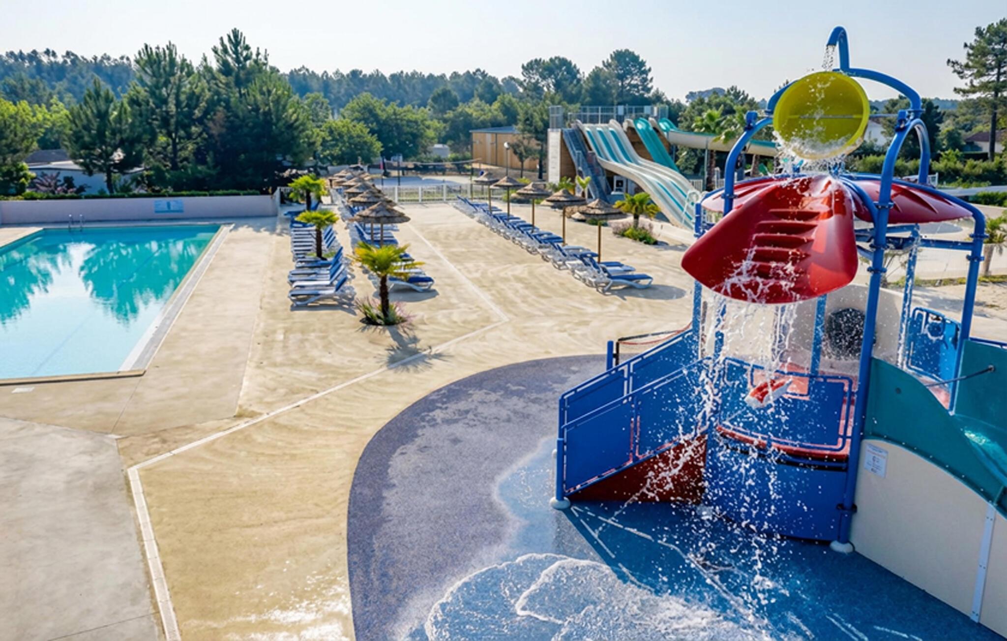 Profitieren Sie vom Zugang zu den vielfältigen kostenpflichtigen Aktivitäten des Campingplatzes. Ziehen Sie Bahnen im großen Pool, genießen Sie die Rutschen oder begleiten Sie Ihre Kinder in den farbenfrohen Wasserspielbereich. Der lange Sandstrand von Saint-Julien-en-Born und die umliegenden Pinienwälder laden zu Ausflügen, Radtouren und Spaziergängen ein.