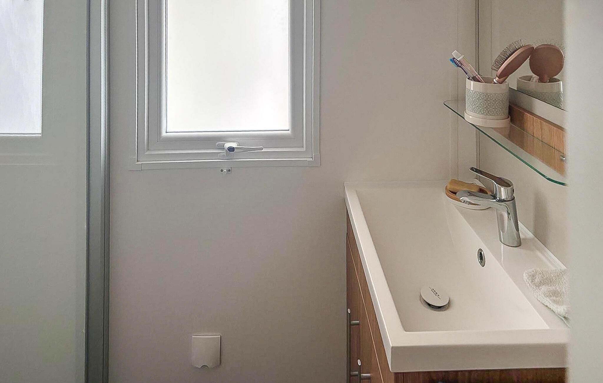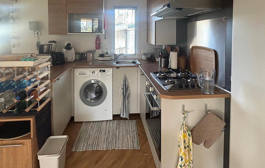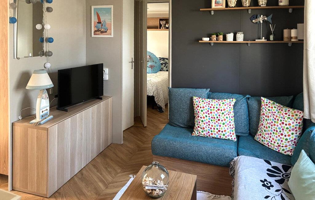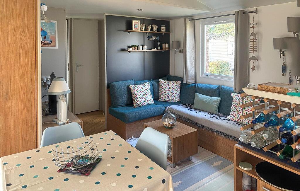 Verbringen Sie Ihren Urlaub in einem gut ausgestatteten Mobilheim auf einem einladenden Campingplatz. Genießen Sie die praktische Einrichtung und die vielen Möglichkeiten zur aktiven oder entspannten Urlaubsgestaltung direkt auf dem Gelände. Lehnen Sie sich auf dem großen Sofa zurück oder versammeln Sie sich zu den Mahlzeiten im offenen Wohn- und Essbereich. Die Küche ist kompakt und funktional, ideal für die Zubereitung einfacher Speisen.
