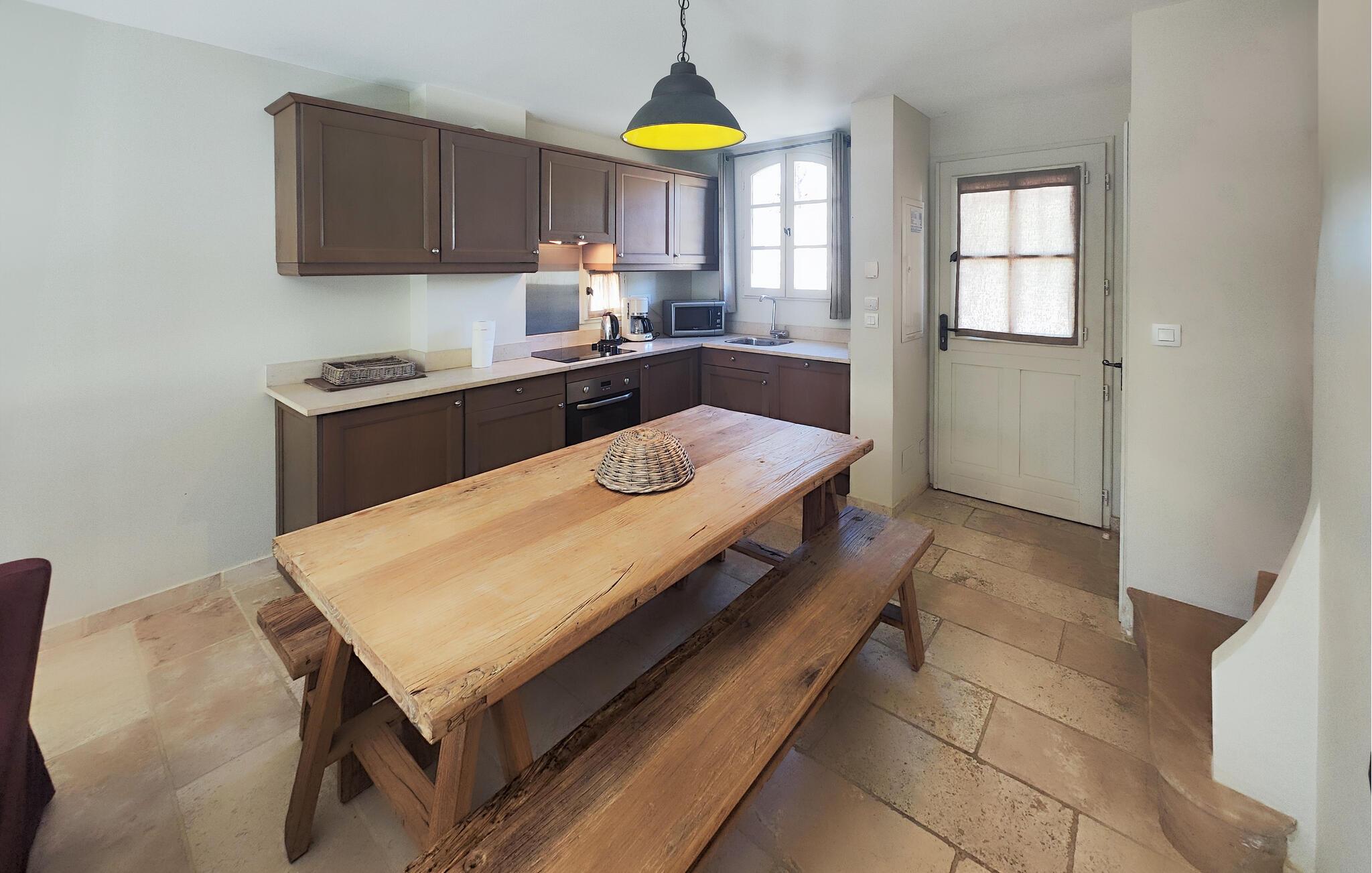 Freuen Sie sich auf einen erholsamen Urlaub in diesem schön gestalteten Ferienhaus, das Sie im Erdgeschoss mit einem offenen und komfortablen Wohnraum empfängt und durch die verbundenen Bereiche der Küche, des Esstisches und des Wohnzimmers zu gemeinsamen Aktivitäten auffordert. Erkunden Sie auch die übrigen Zimmer des attraktiven Hauses und genießen erholsame Nächte in den gemütlichen Schlafzimmern und genießen nach dem Aufstehen ein leckeres Frühstück auf der Terrasse, das Sie von dem Wohnraum erreichen. Genießen Sie den Schatten der Büsche oder nehmen ein Sonnenbad und schmieden Ihre nächsten Ausflüge und Aktivitäten.