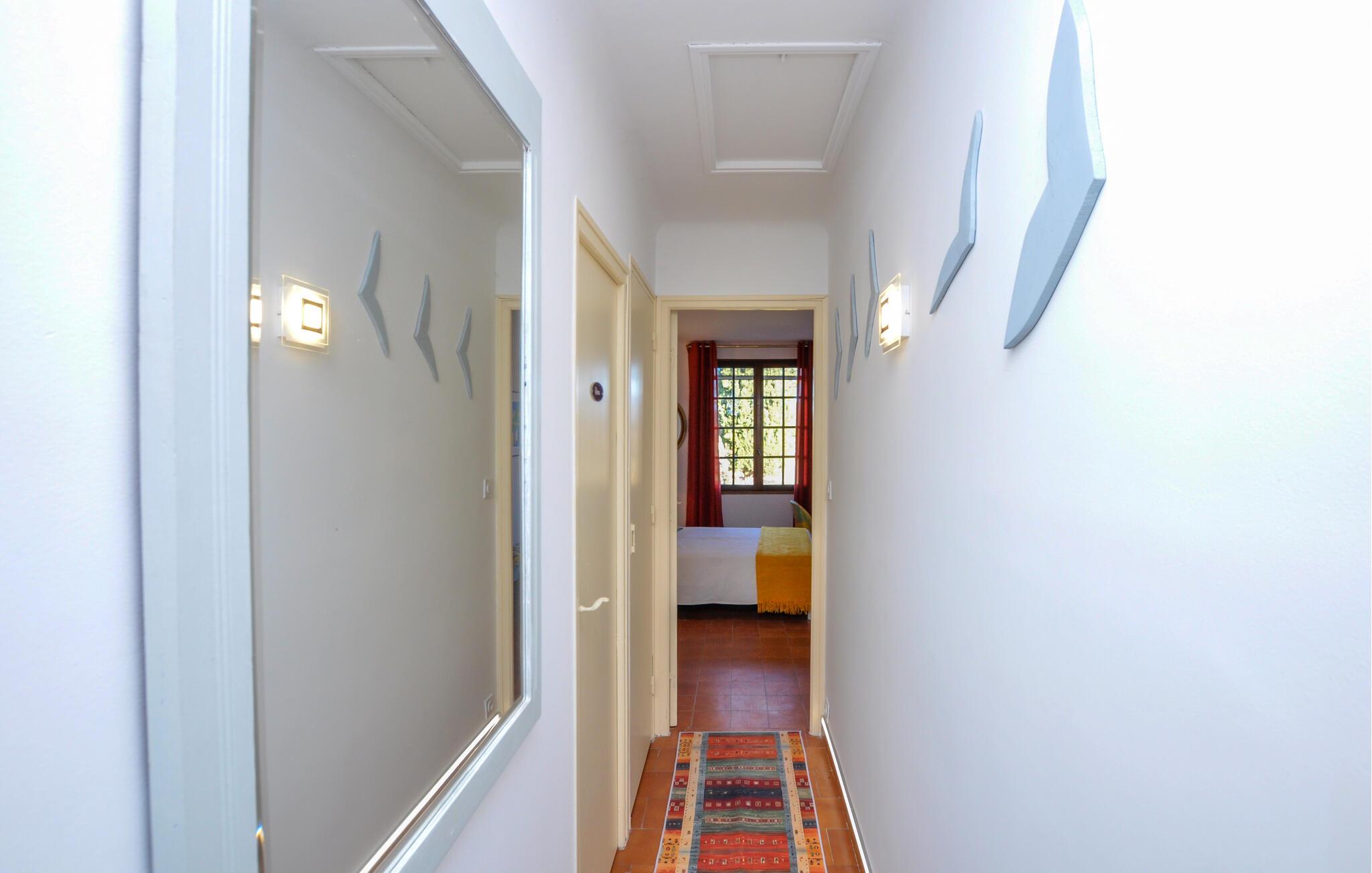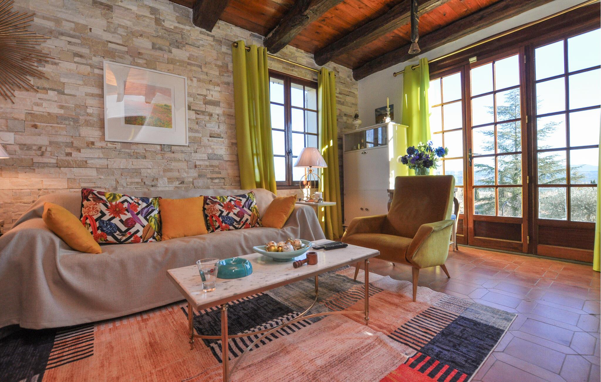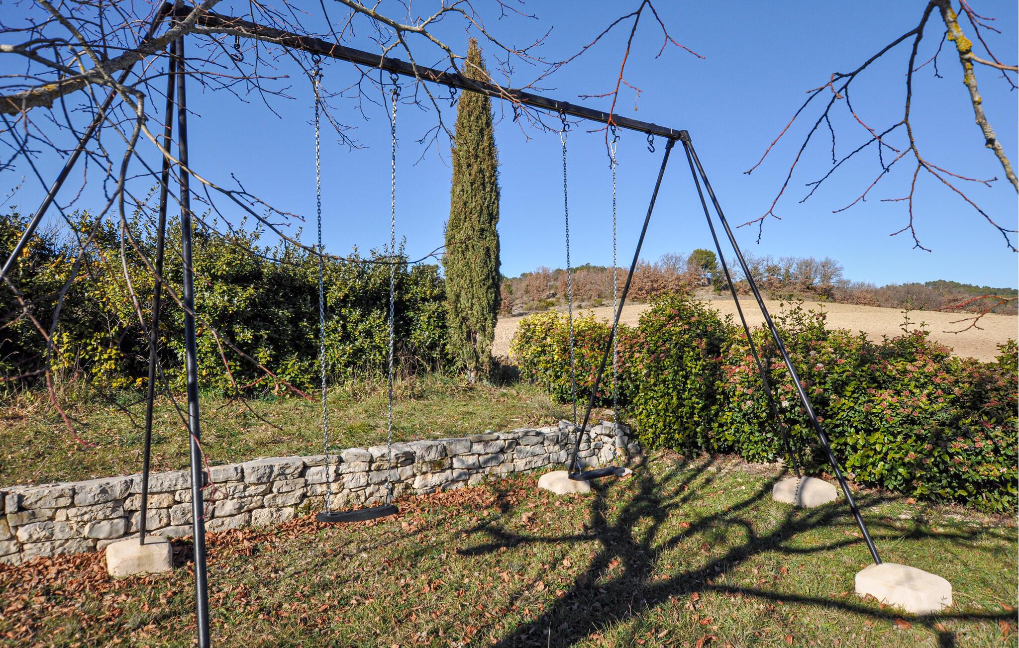 Draußen erwartet Sie ein weitläufiger Garten mit schattigen Plätzen unter Olivenbäumen und einer überdachten Terrasse. Beginnen Sie den Tag mit einem Frühstück im Freien, entspannen Sie am Pool oder erkunden Sie die Umgebung zu Fuß. Die Kinder können derweil auf der Schaukel spielen, während Sie den Blick auf die herrliche Landschaft genießen.