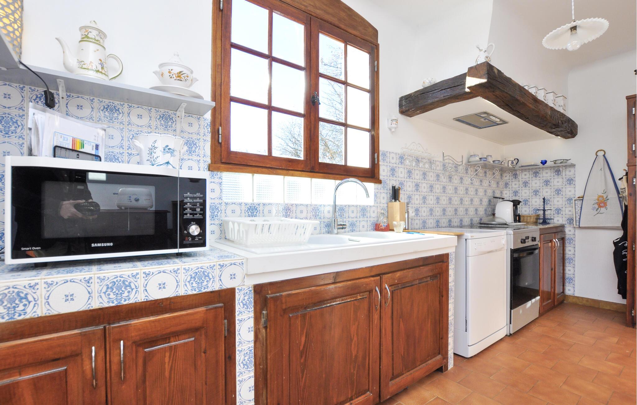 Willkommen im geschmackvoll eingerichteten Innenbereich dieses familienfreundlichen Ferienhauses, in dem rustikale Elemente und gemütliche Sitzmöglichkeiten ein einladendes Ambiente schaffen. Nutzen Sie die gut ausgestattete Landhausküche, um Ihre Lieblingsmahlzeiten zuzubereiten, und genießen Sie diese im lichtdurchfluteten Essbereich. Machen Sie es sich mit einem Glas Wein im großzügigen Wohnzimmer bequem und verbringen Sie gemeinsame Zeit bei einem Spieleabend am knisternden Kaminfeuer.