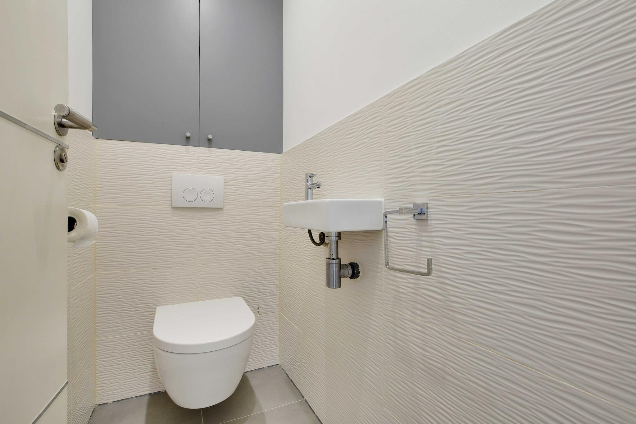 On the 2nd floor: (Living room(double sofa bed, TV, dining table), Kitchen(stove, electric kettle, toaster, coffee machine, oven, microwave, dishwasher, fridge, dishes and cutlery), bedroom(double bed), Bedroom with bathroom(double bed, shower), bathroom(bath tub, shower, toilet), toilet(toilet)) Bed Linen, Elevator, Hot Water, Internet Access DSL, Wardrobe, First Aid, Play area, tumble dryer, washbasin, washing machine, heating, iron, hairdryer, Towels/Sheets (Incl.), shampoo, Essentials, Dedicated workspace, Cooking basics, Carbon monoxide detector, Cleaning Disinfection, Downtown, Enhanced cleaning practices, High touch surfaces disinfected, Long term stays allowed, Room-darkening shades, Town