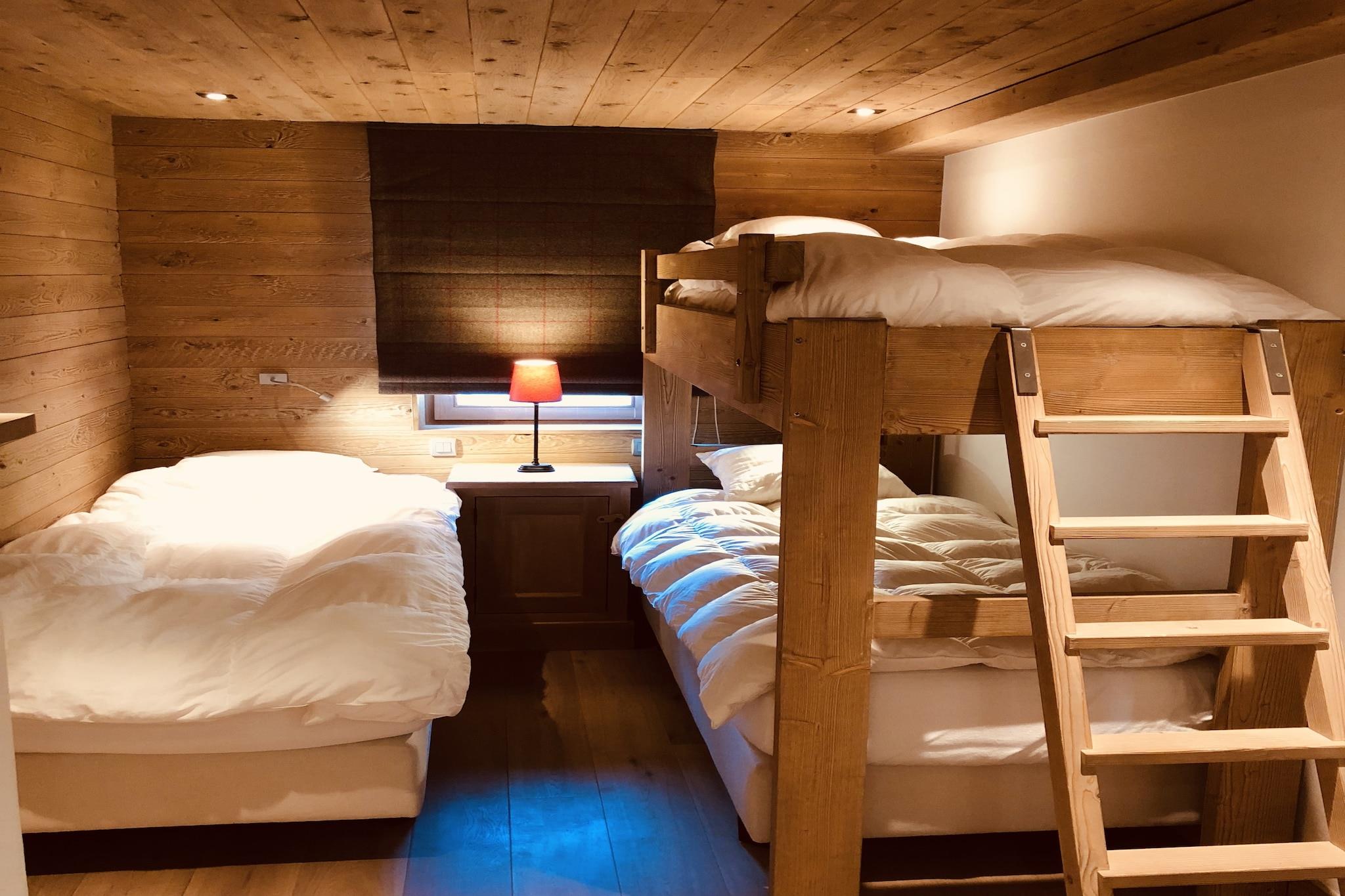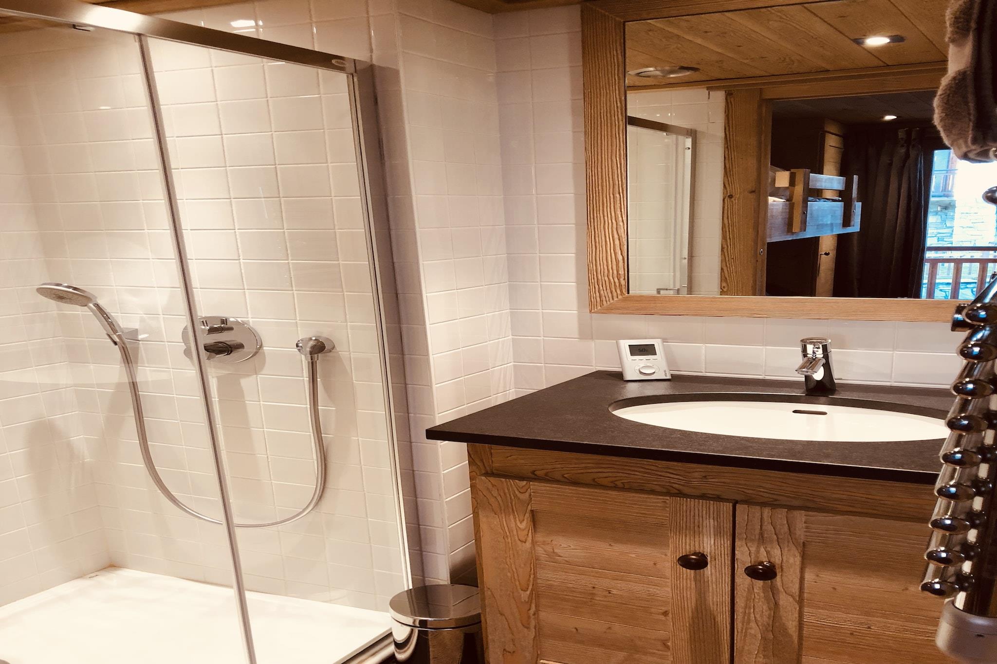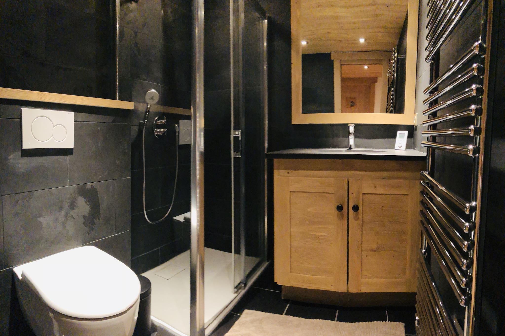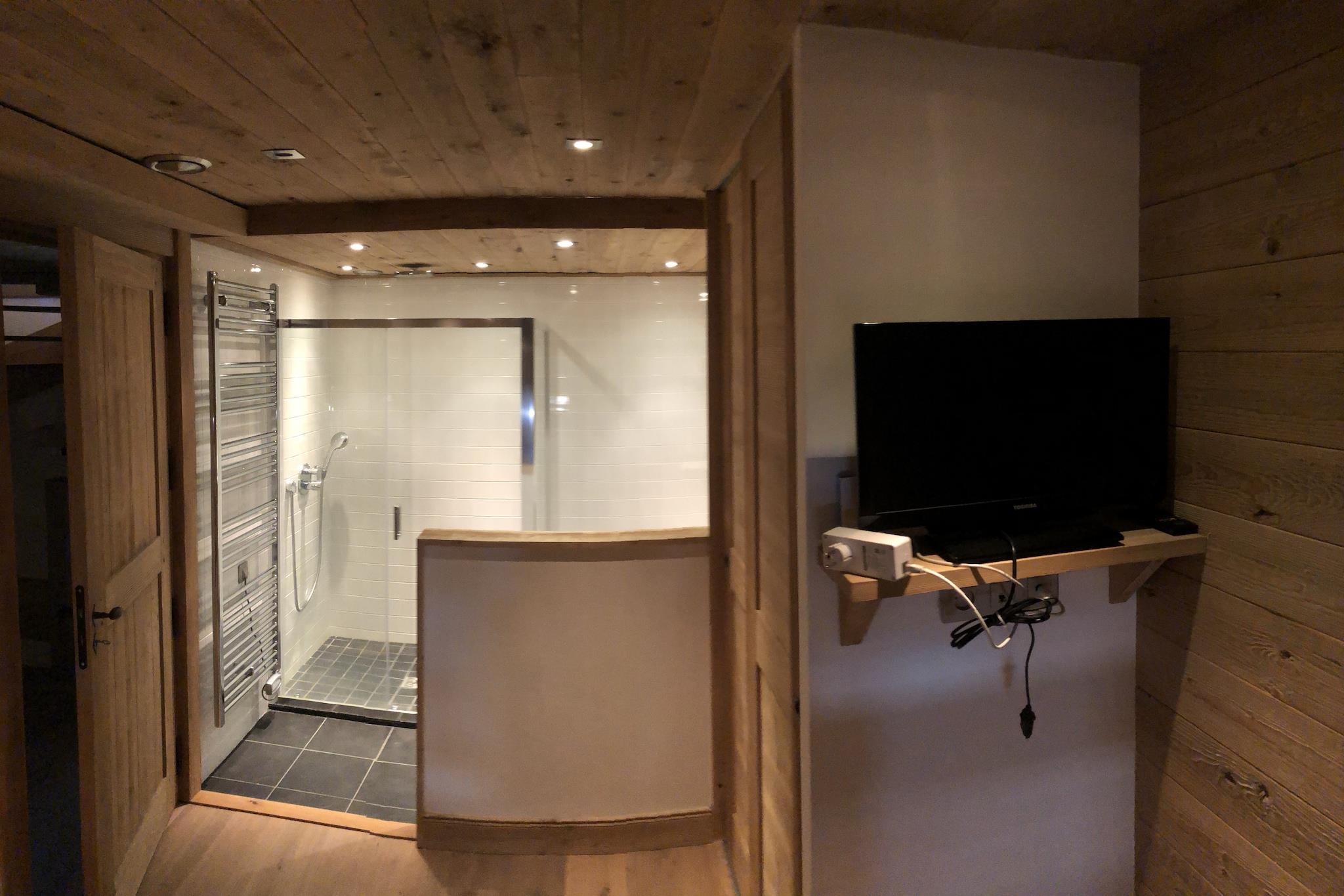 Ground floor: (Bedroom with bathroom(double bed, TV, shower, washbasin, toilet), Bedroom with bathroom(double bed, TV, bathtub with shower, washbasin, toilet), washing room(tumble dryer, washing machine), ski storage(ski boot heaters), garage, terrace) On the 1st floor: (Bedroom with bathroom(bunk bed, bath tub, shower, washbasin, toilet), Bedroom with bathroom(single bed, bunk bed, TV, shower, washbasin, toilet), Bedroom with bathroom(single loft bed, double bed, TV, shower, washbasin, toilet), terrace(heated)) On the 2nd floor: (Kitchen(electric kettle, cooker, coffee machine(espresso, pads), oven, microwave, dishwasher, fridge-freezer), Living/diningroom(TV(smart TV), fireplace, seating area, phone docking station, wireless music system, streamingservice), Bedroom with bathroom(double bed, TV, bath tub, shower, washbasin, toilet), terrace(heated, 14 m2)) BBQ(gas), parking