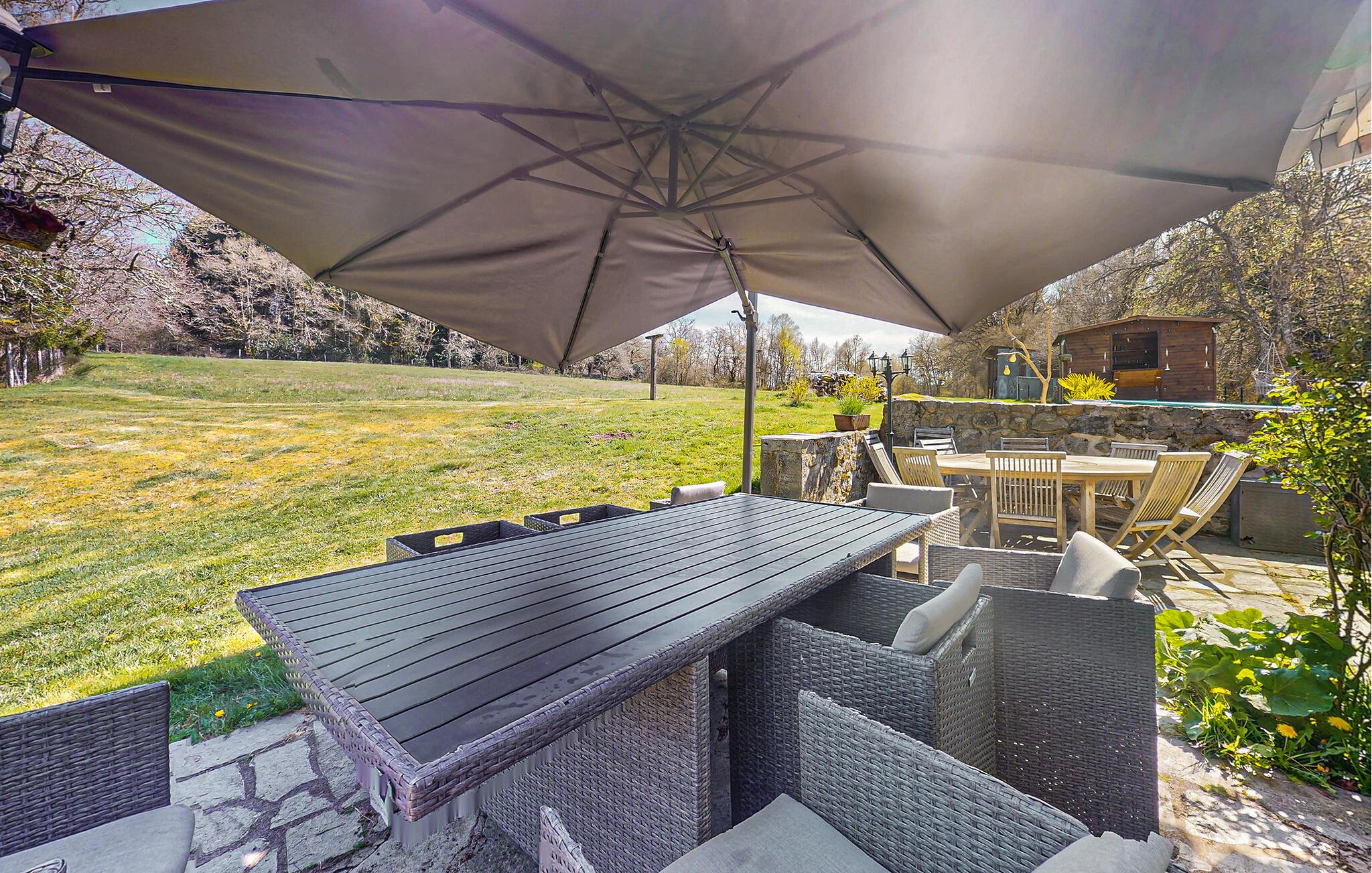 Treten Sie hinaus auf die schöne Terrasse und machen Sie es sich unter dem Sonnenschirm am Gartentisch bequem. Schwimmen Sie in Ihrem kleinen Pool oder entspannen Sie sich auf den bereitstehenden Liegen. Der weitläufige Garten lädt mit Wiesen, Bäumen und gemütlichen Sitzecken zum Verweilen ein. Nutzen Sie den Grillplatz für gemeinsame Mahlzeiten unter freiem Himmel.