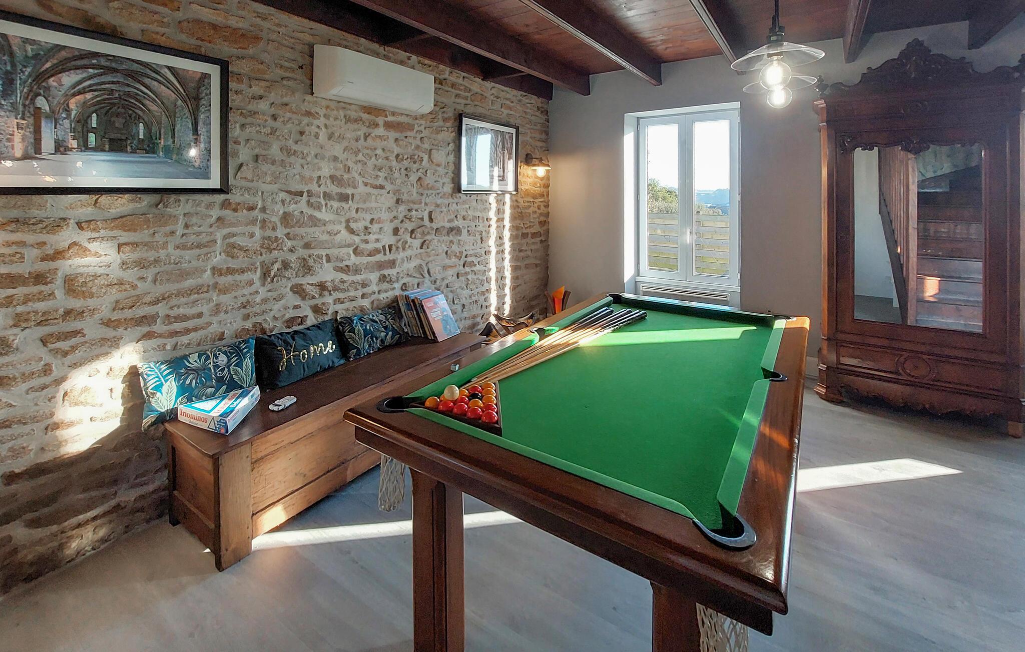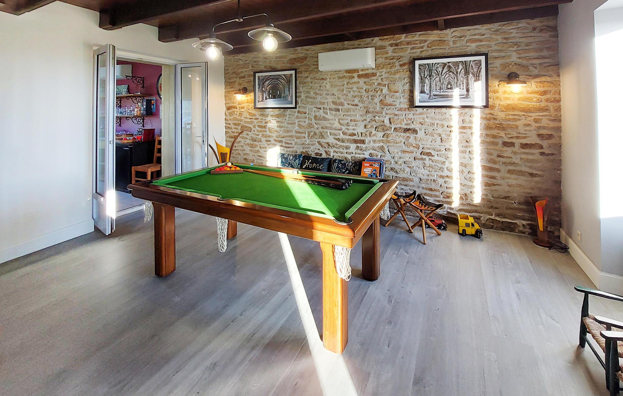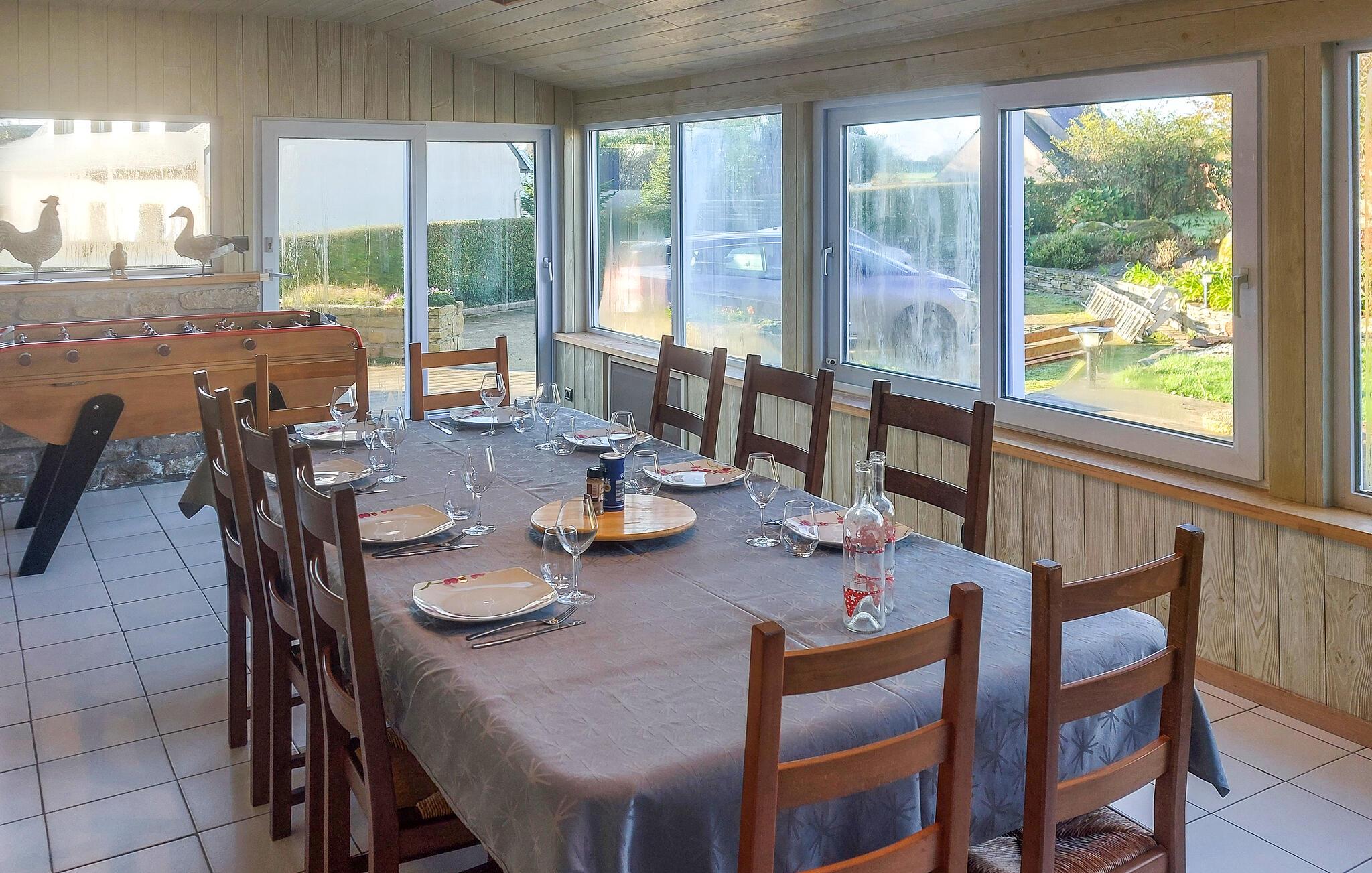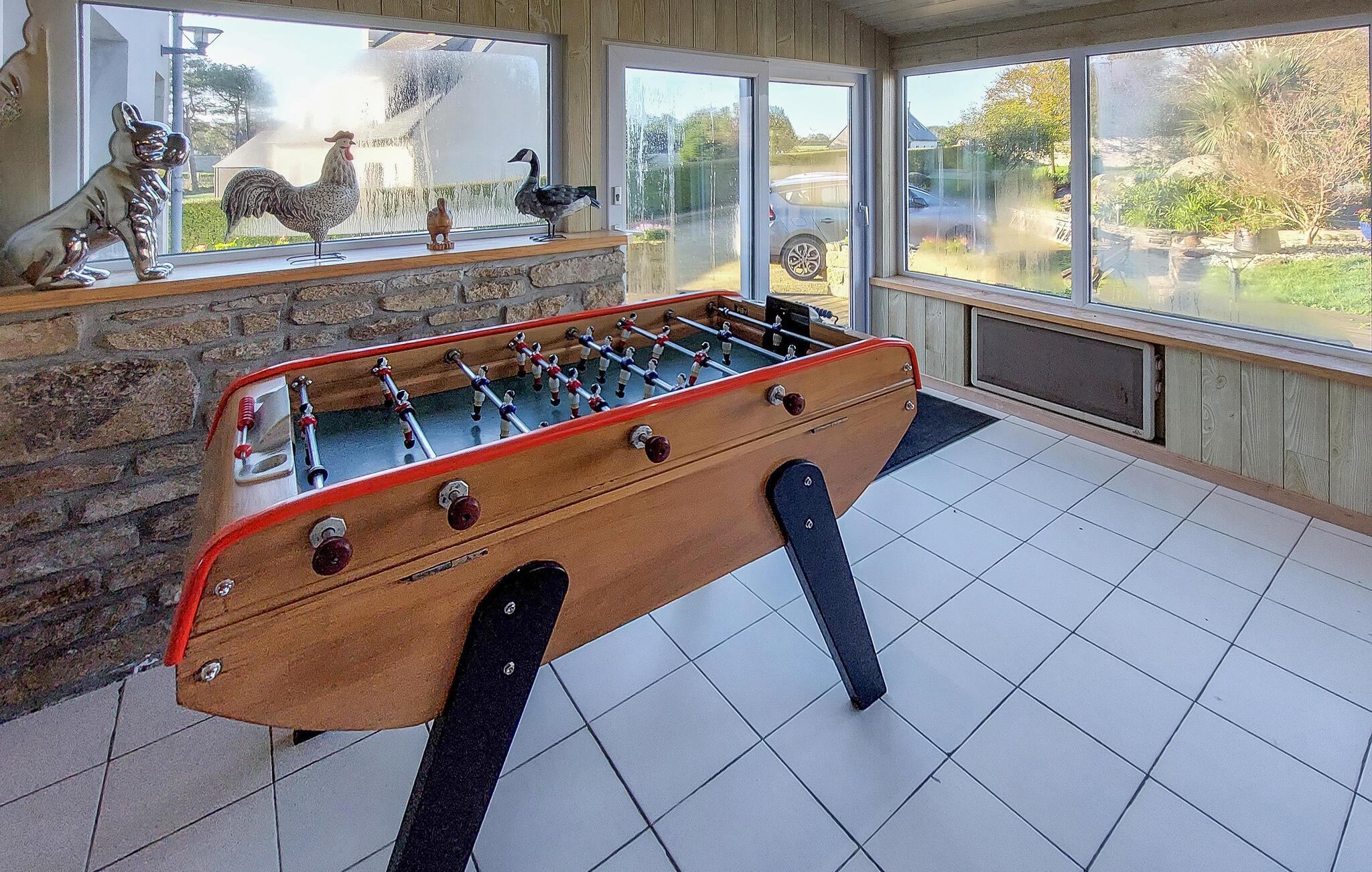 Dieses charmante Ferienhaus in Saint-Pabu bietet Ihnen und Ihrer Familie den perfekten Rückzugsort. Die geschmackvolle Einrichtung auf drei Etagen sorgt für Gemütlichkeit und Raum zum Wohlfühlen. Spielen Sie eine Partie Billard oder Tischfußball im Aktivitätsbereich, und kochen Sie gemeinsam in der voll ausgestatteten Küche. Machen Sie es sich im Wohnzimmer gemütlich und planen Ihre nächsten Ausflüge.
