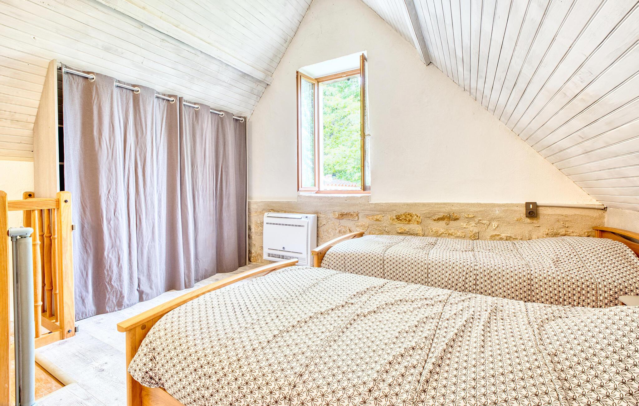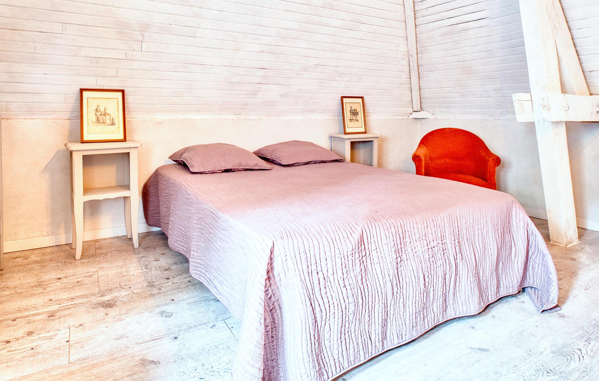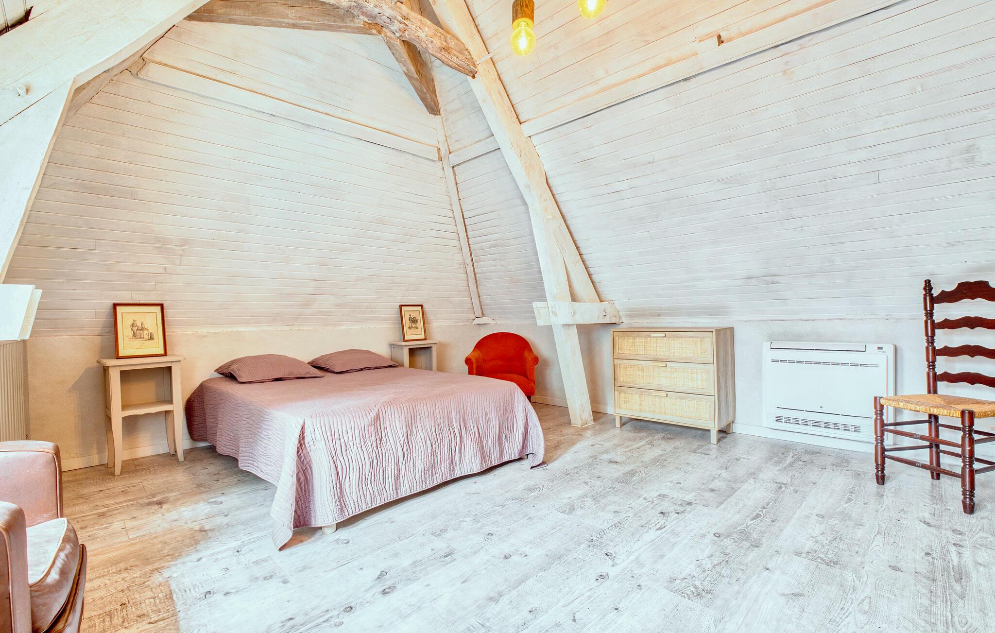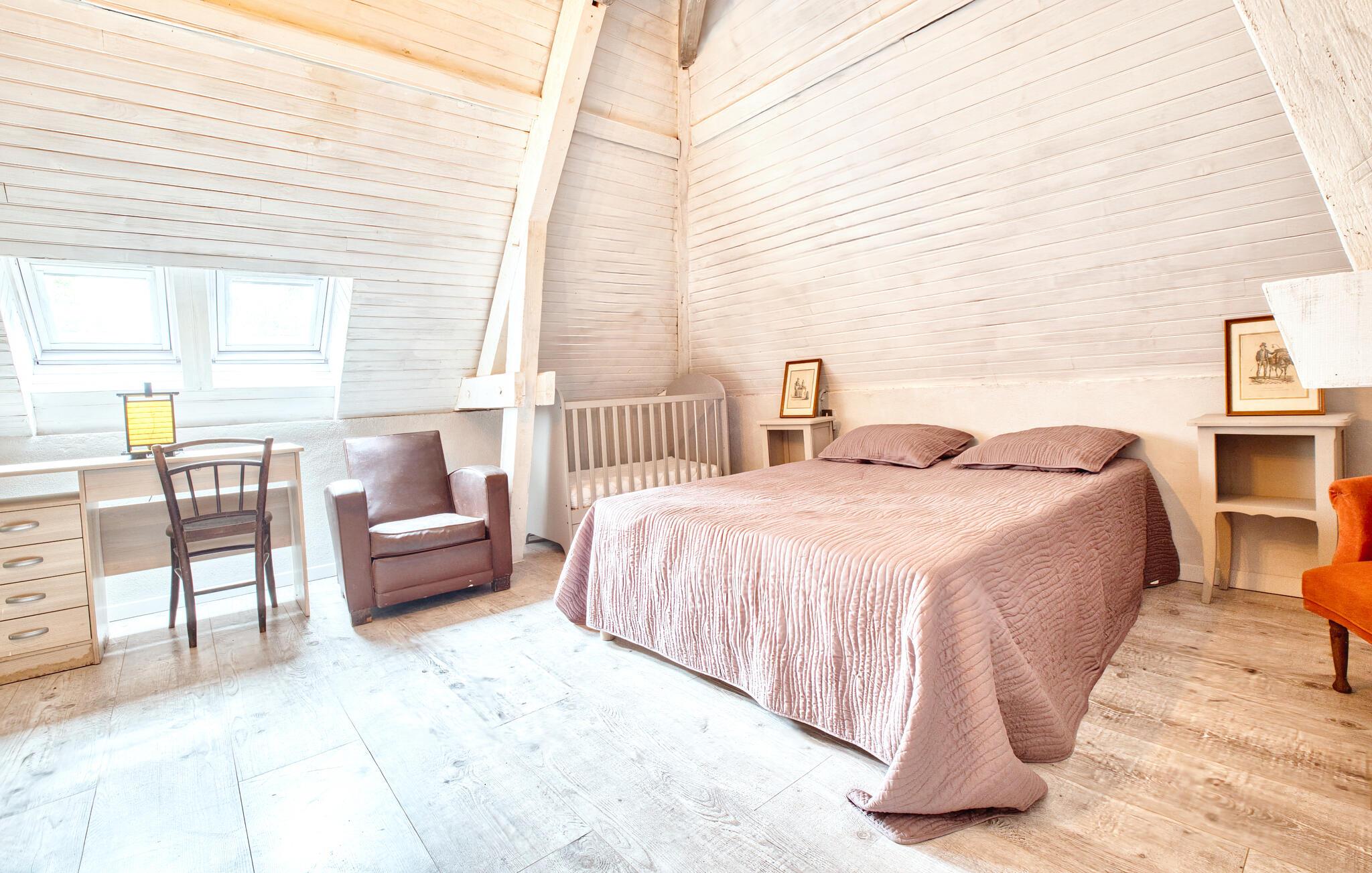 Umgeben von viel Grün und eingebettet in eine ländliche Umgebung, bietet dieses Haus die ideale Kulisse für erholsame Tage mit der Familie. Treten Sie ein in den liebevoll renovierten Innenbereich mit sichtbarem Mauerwerk, freiliegenden Holzbalken und warmen Farbtönen und spüren Sie den Hauch der Geschichte. Machen Sie es sich in den bequemen Sesseln gemütlich oder genießen Sie Ihre Mahlzeiten am kleinen Esstisch mit Blick ins Grüne. In der praktischen Küche ist alles bereit für unbeschwerte Selbstversorgung in stilvoller Atmosphäre.
