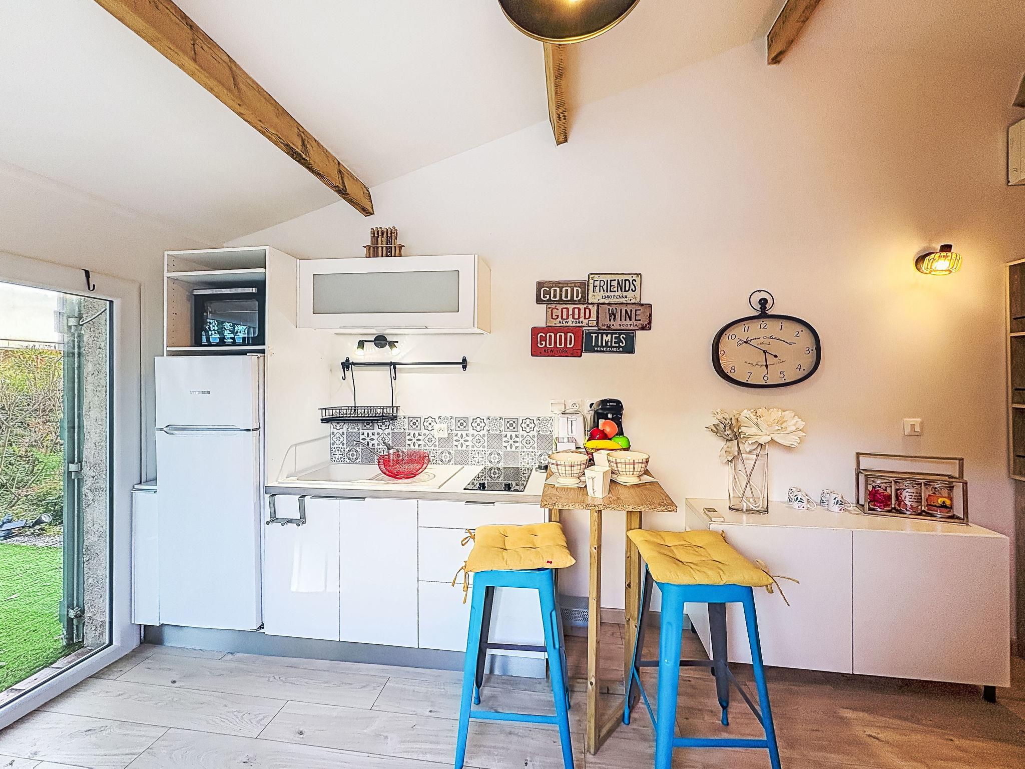 1-room apartment 25 m2, on the ground floor. Object suitable for 2 adults. Renovated in 2024, modern furnishings: living/sleeping room with 1 double sofabed (1 x 140 cm, length 190 cm), TV (flat screen), air conditioning. Exit to the terrace. Kitchenette (mini-oven, 2 ceramic glass hob hotplates, toaster, kettle, freezer, electric coffee machine, Capsules for coffee machine (Tassimo) extra) with dining nook. Exit to the terrace. Shower/WC. Heating. Large terrace. Terrace furniture. Of the garden. Facilities: iron, hair dryer. Internet (WiFi, free). Parking (1 car). Please note: private entrance, smoke alarm. Offer by a private individual according to Art. 155, IV of CGI. HC25UH