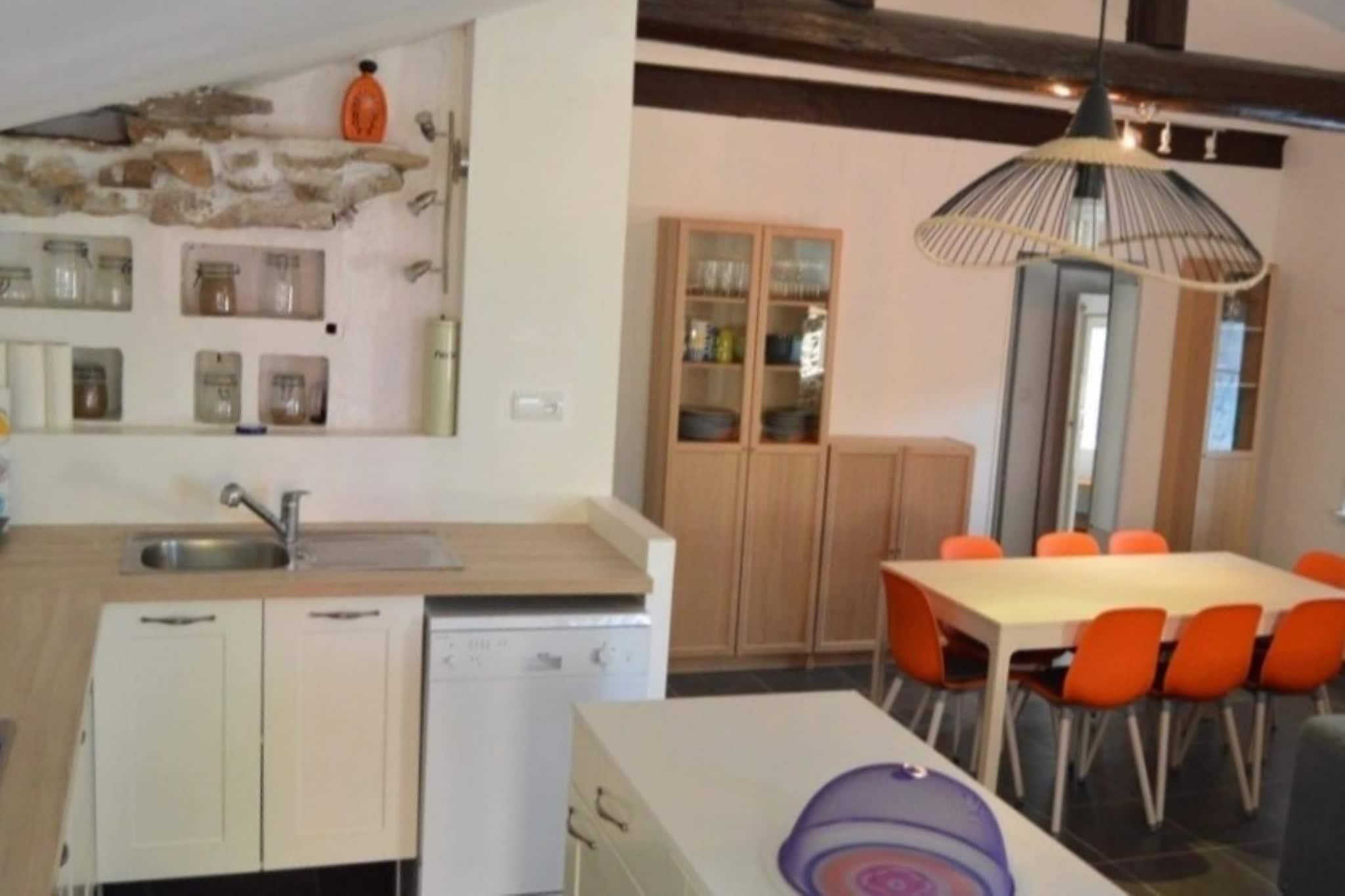Hidden in the peaceful countryside of Saint-Sébastien-d'Aigrefeuille, this charming holiday home offers space, comfort, and the soothing rhythm of nature. Designed for up to 6 guests, it features a private pool, leafy outdoor spaces, and warm, welcoming interiors — the perfect setting for slow mornings, outdoor meals, and quiet evenings under the Cévennes sky. Inside, the open kitchen is fully equipped for home-cooked feasts, while the cozy living and dining area invites you to relax with a smart TV and soft seating. The ground floor includes two comfortable bedrooms with double beds and a modern bathroom with a washing machine. Upstairs, a third bedroom with two single beds and an additional bathroom offers privacy and flexibility for families or friends. Air conditioning, a roofed terrace, a fenced garden, sun loungers, and a private 8×4 m pool complete the picture of effortless holiday living. A table tennis table promises cheerful afternoon matches. Set in a rural area by the river, this location is a dream for nature lovers. The magnificent Cévennes National Park and the historic Chemin de Régordane invite long walks, scenic exploration, and endless outdoor adventure. For culture seekers, the Musée du Désert and the Pierre André Benoit Museum offer fascinating insight into local history. Families will love the famous Bamboo Garden and the Cévennes Steam Train from Anduze. Nearby waterways are perfect for rafting, fishing, or quiet moments by the shore, while the surrounding hills offer opportunities for caving, hunting, and discovering the raw beauty of southern France at your own pace.