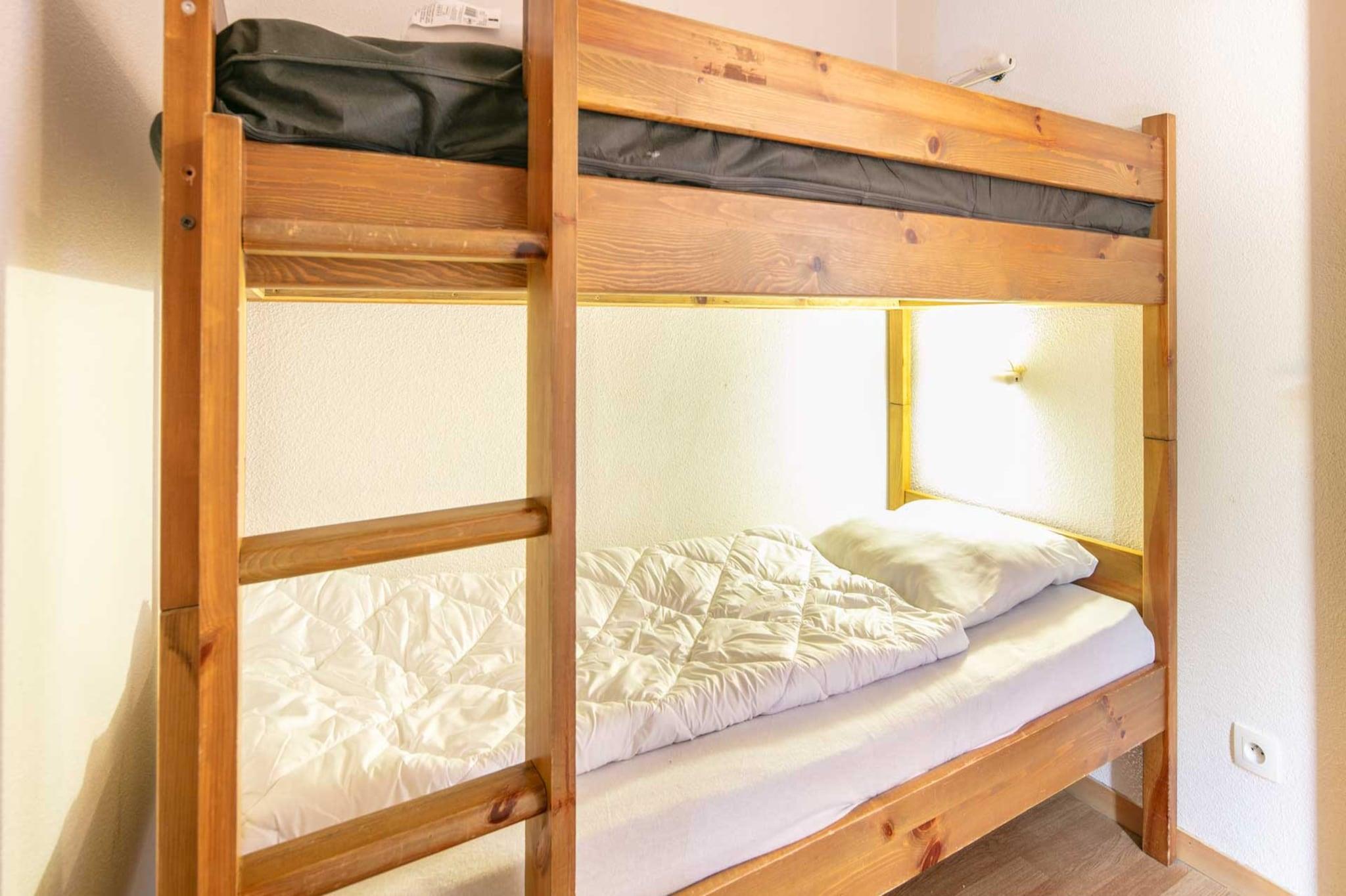 Open kitchen(electric kettle, toaster, coffee machine, microwave, dishwasher, fridge, freezer, dishes and cutlery), Living/diningroom(bunk bed, TV, dining table, seating area), bedroom(double bed), bedroom(single bed, double bed), bedroom(single bed, single bed, single bed), bedroom(single bed, single bed), bathroom(shower, washbasin, toilet), bathroom(shower, washbasin, toilet), bathroom(bath tub, washbasin, toilet), balcony, parking, swimming pool(shared with other guests, heated)