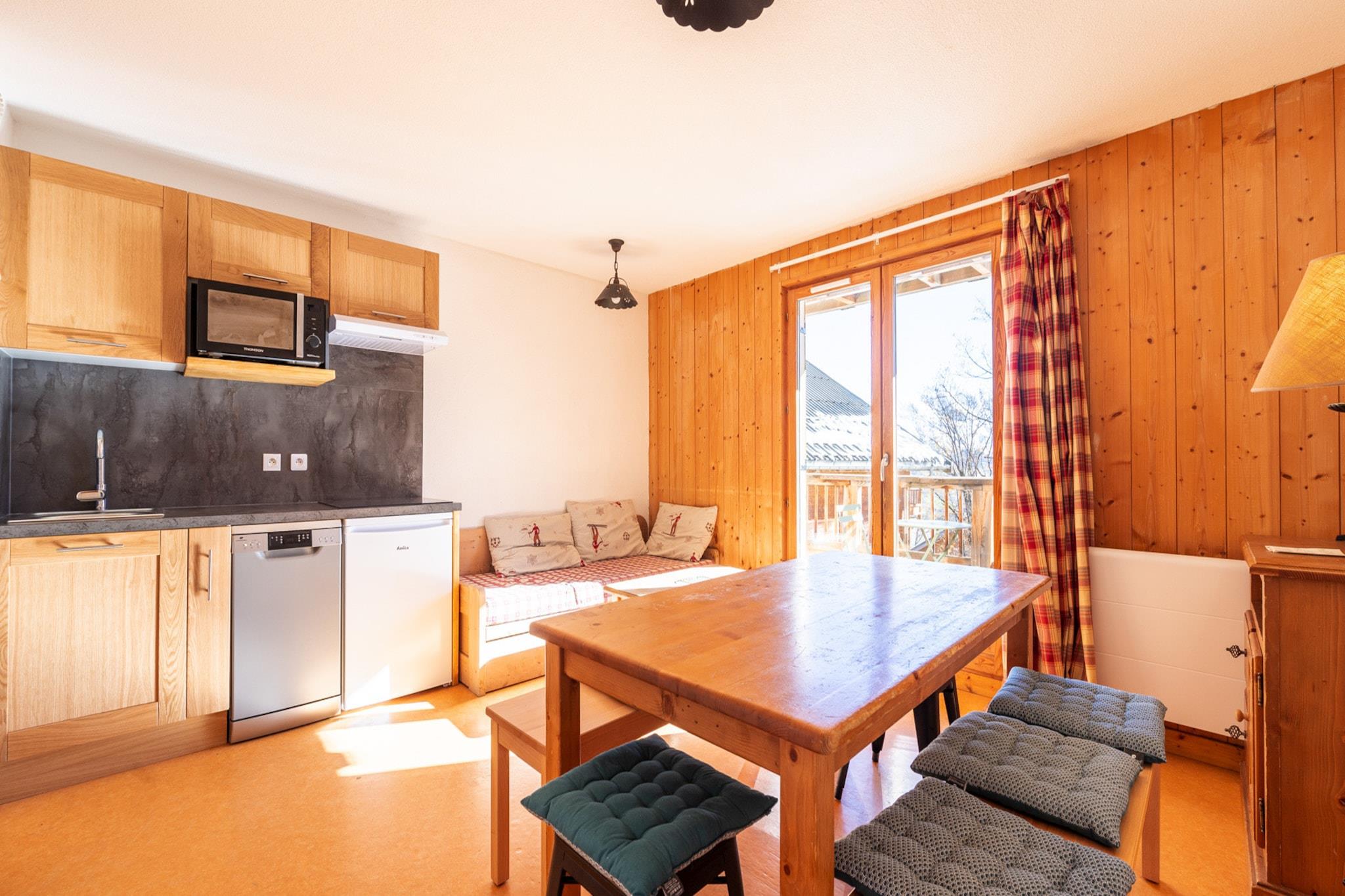 This homely 35 m² apartment in Saint-Sorlin-d'Arves offers a fully equipped retreat for up to six guests, featuring two comfortable bedrooms ideal for families or small groups. Located in Résidence Le Hameau de l'Alpage, the property sits in a peaceful, family-friendly zone surrounded by mountain views—just 500 meters from the supermarket and 800 meters from the ski resort. Guests can enjoy a private balcony, a communal swimming pool, and open-air parking in the adjoining building. The apartment also includes an elevator for easy access and a TV for entertainment, making it a convenient and relaxing base for alpine adventures. The electric kitchen is fully equipped with a refrigerator, microwave, dishwasher, coffee machine, toaster, kettle, and all necessary dishes and utensils—perfect for preparing meals with ease. Whether you're skiing, hiking, or simply unwinding, this cozy apartment offers everything needed for a memorable stay in the Southern Alps.