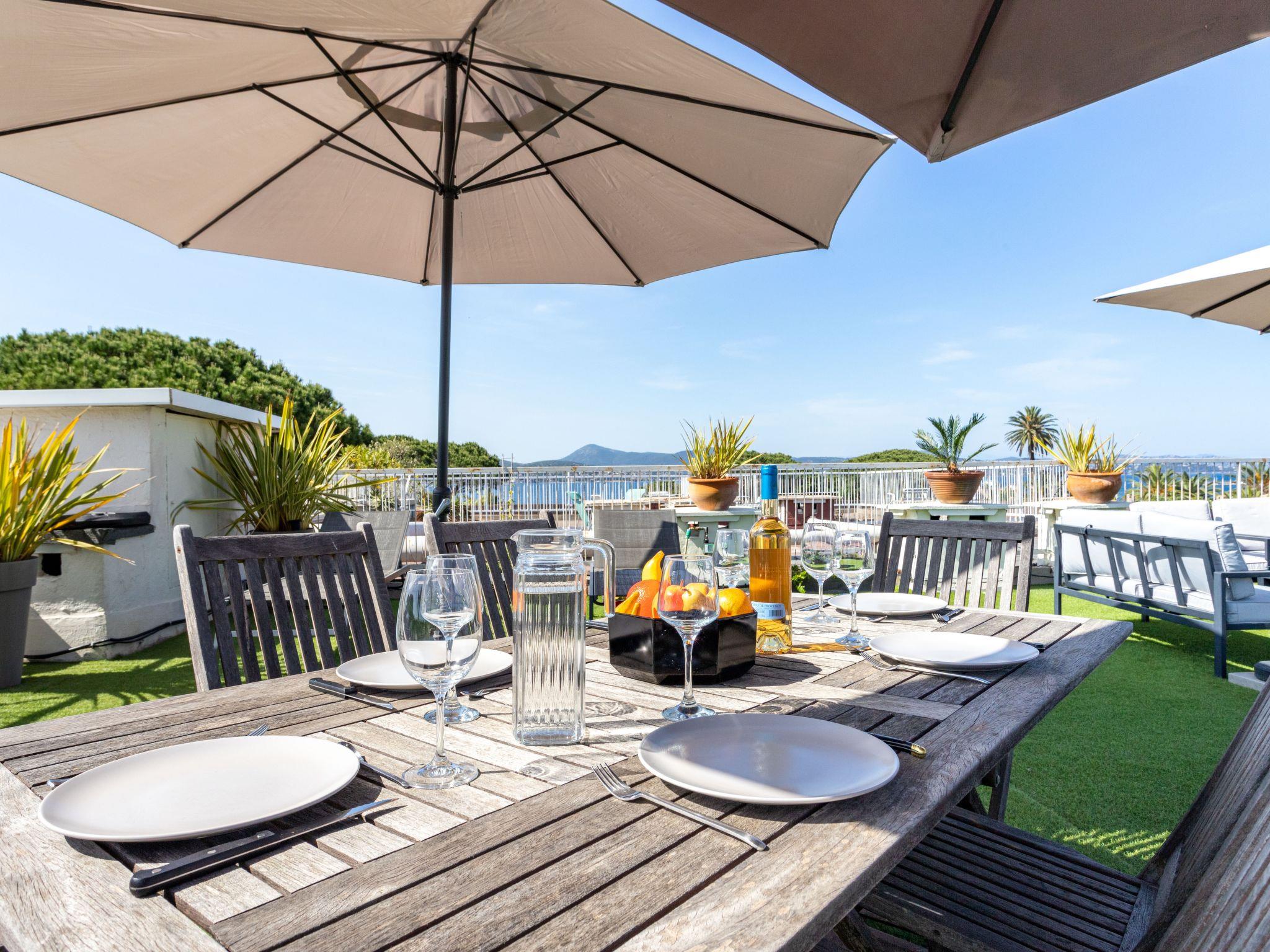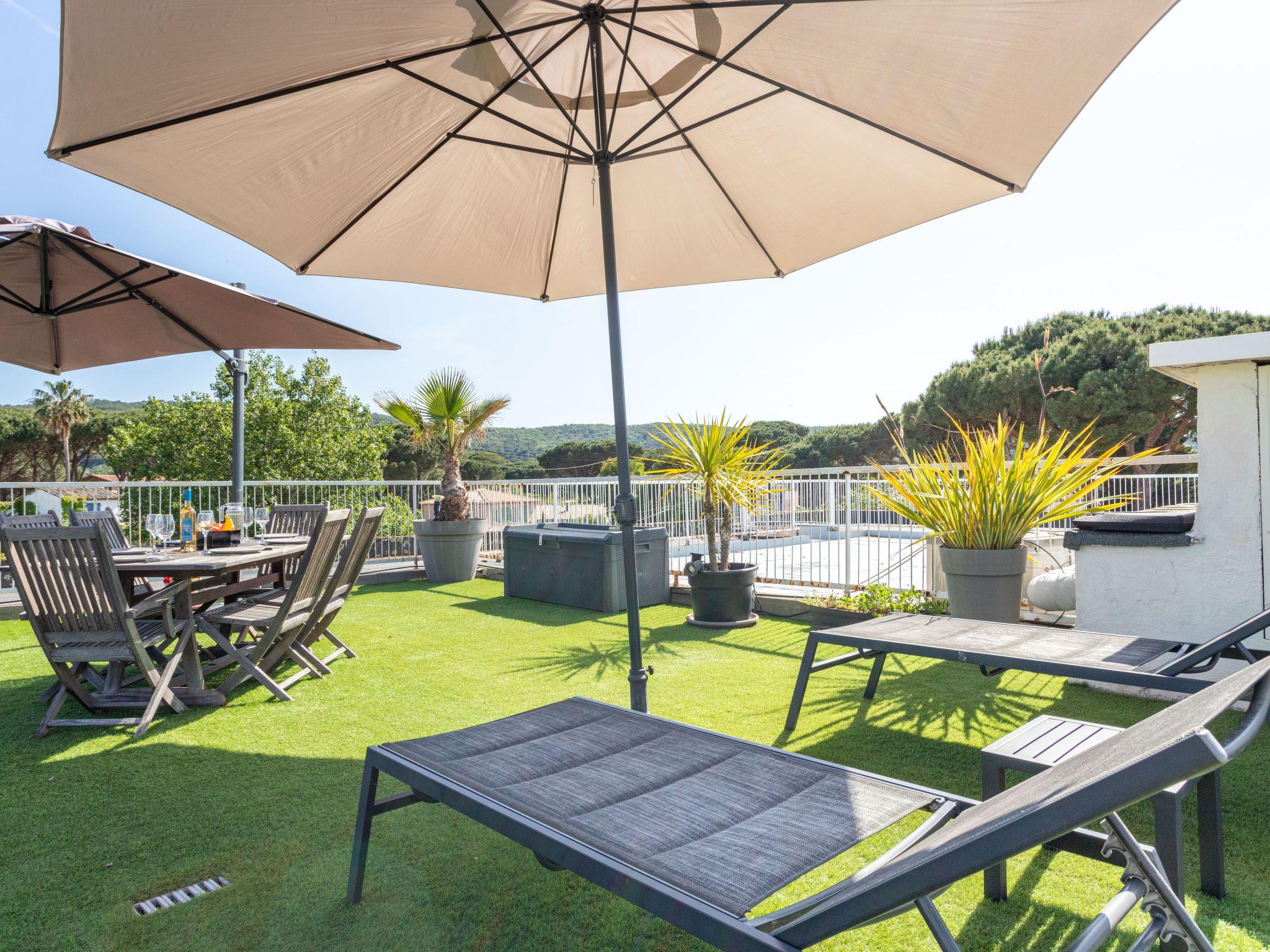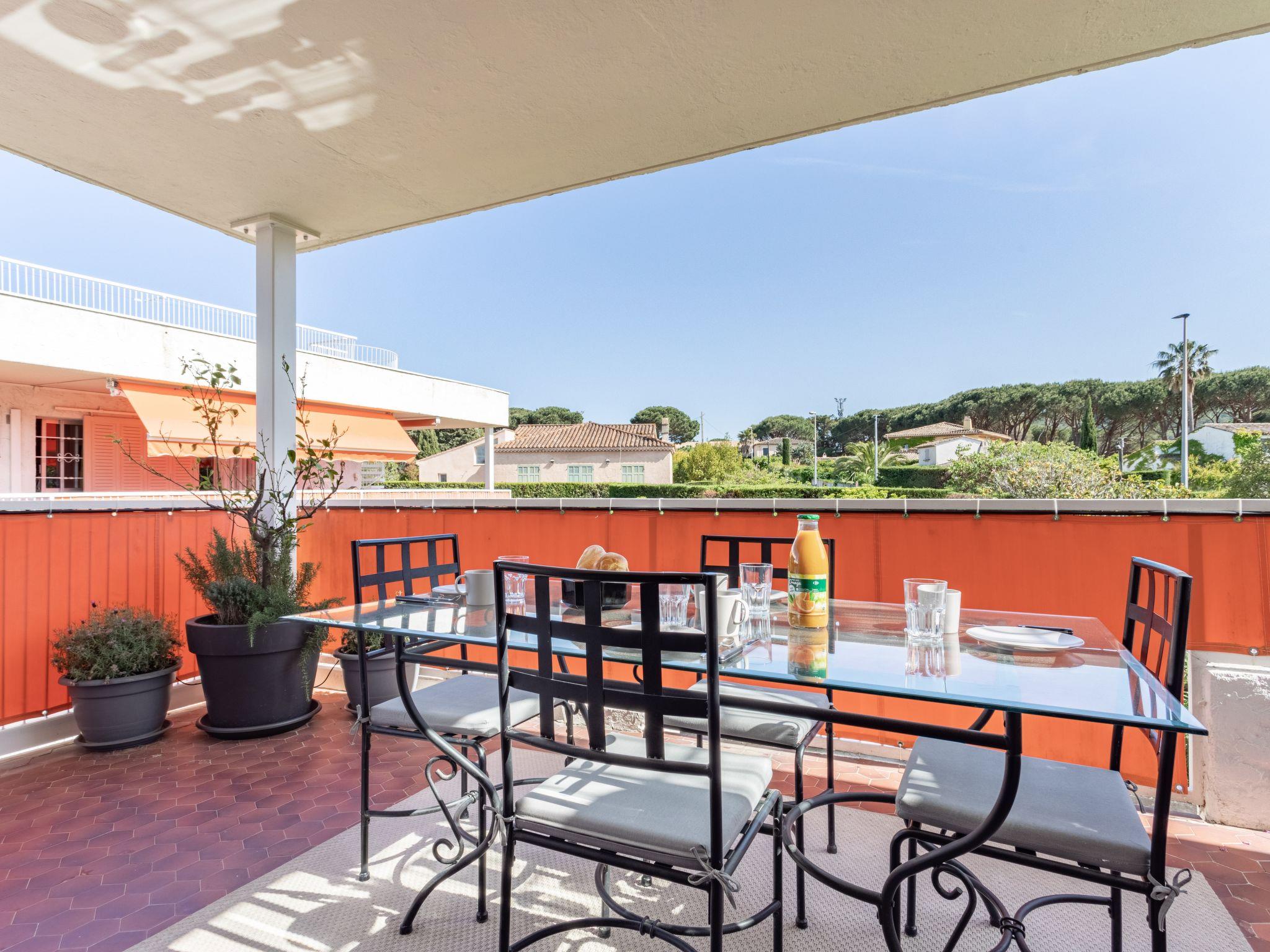 "Résidence Les Patios 7", 2-room apartment 45 m2 on 2nd floor. Renovated in 2019, beautiful and modern furnishings: living/dining room with 1 double sofabed (160 cm, length 190 cm), TV (flat screen). 1 room with 1 french bed (160 cm, length 200 cm), TV (flat screen). Exit to the terrace. Kitchenette (oven, dishwasher, 2 induction hot plates, toaster, kettle, microwave, freezer, electric coffee machine). Bathroom, sep. WC. Electric heating, air-conditioning. Terrace 35 m2, roofed, large terrace 100 m2. Terrace furniture, barbecue, deck chairs (4). View of the sea. Facilities: washing machine, safe, iron, hair dryer. Internet (WiFi, free). Parking space n 734 (roofed), height 180 cm, width 200 cm. Please note: non-smokers only. Smoke alarm. Offer by a private individual according to Art. 155, IV of CGI. 83119002433DP