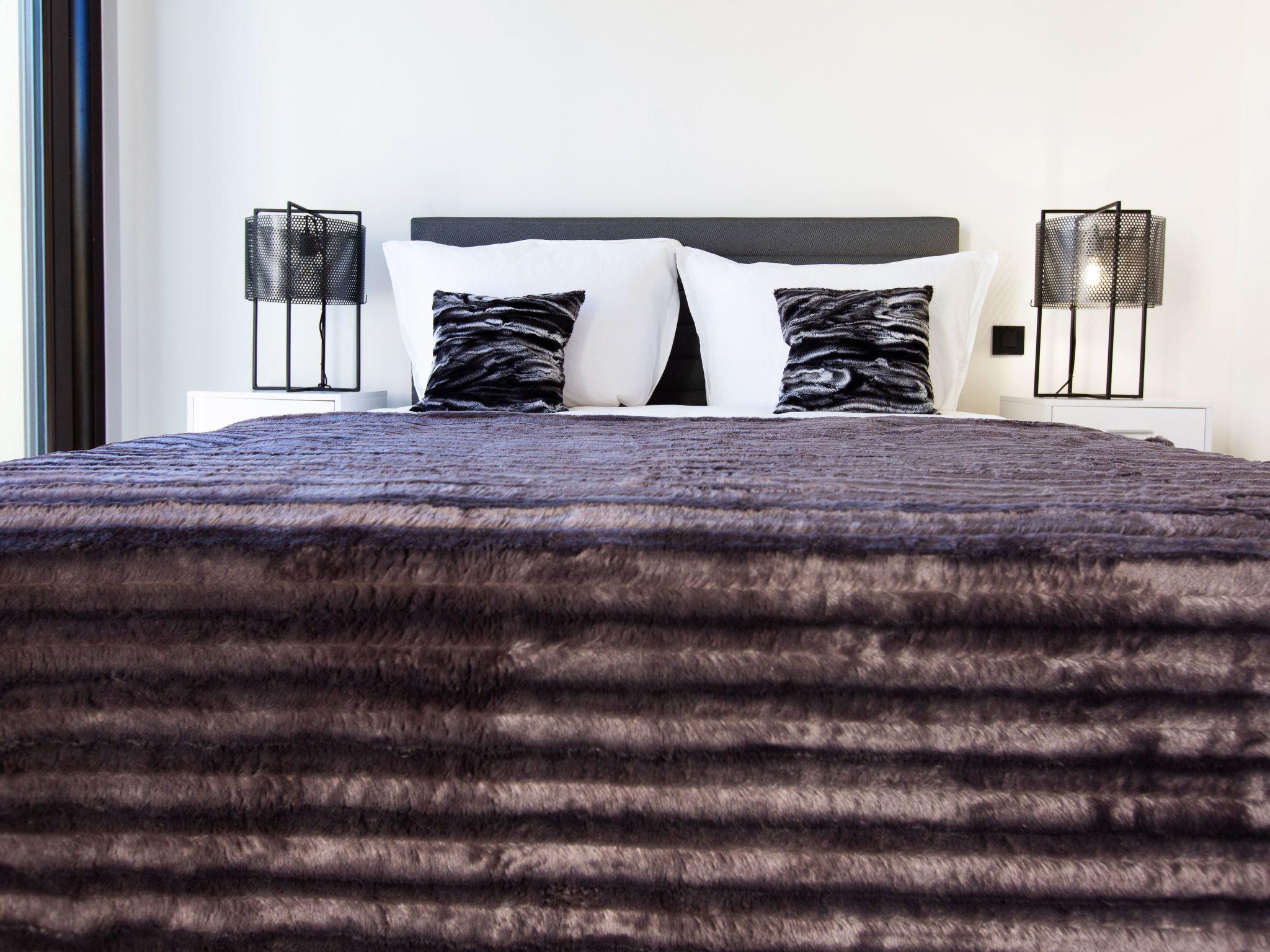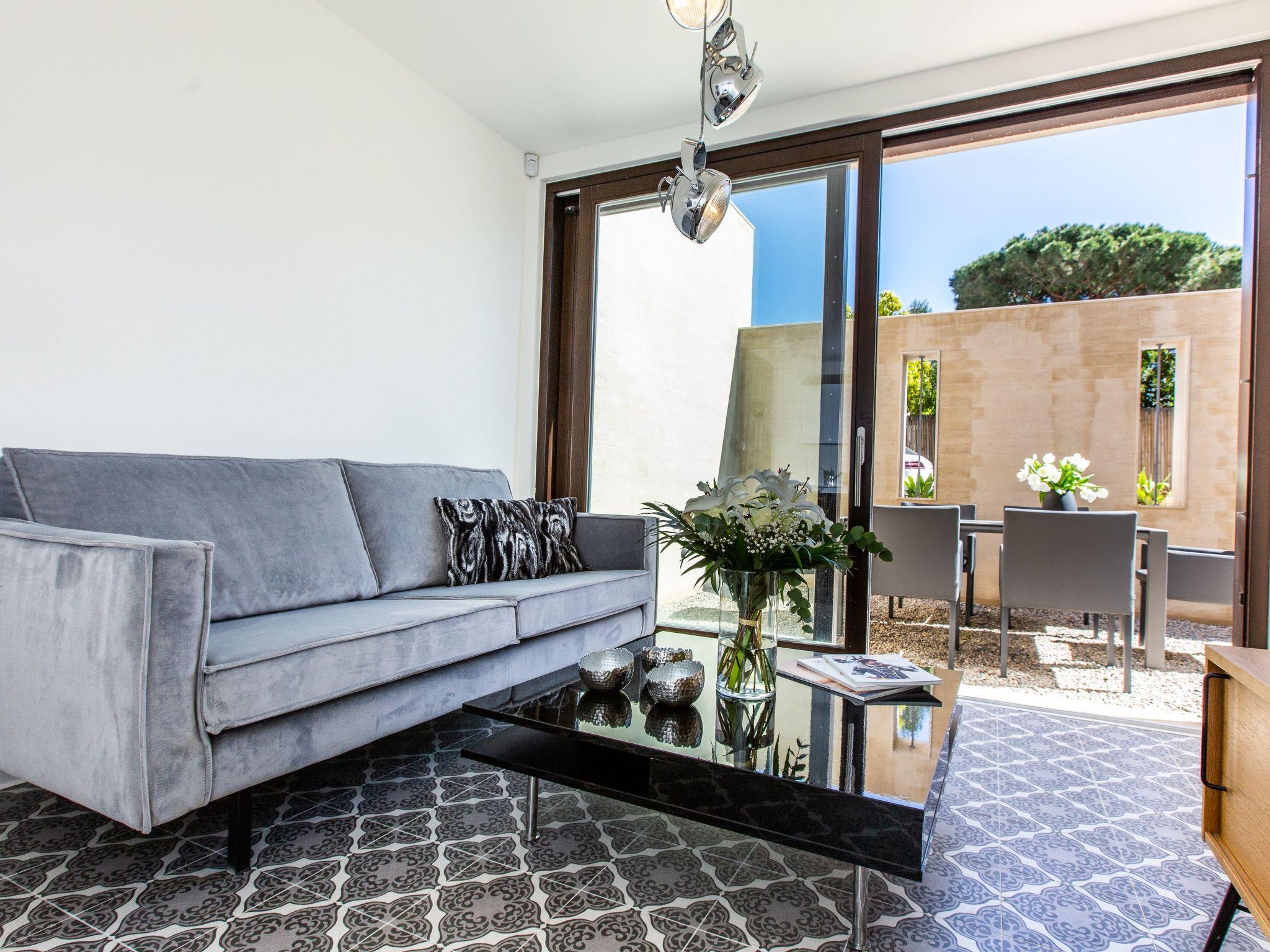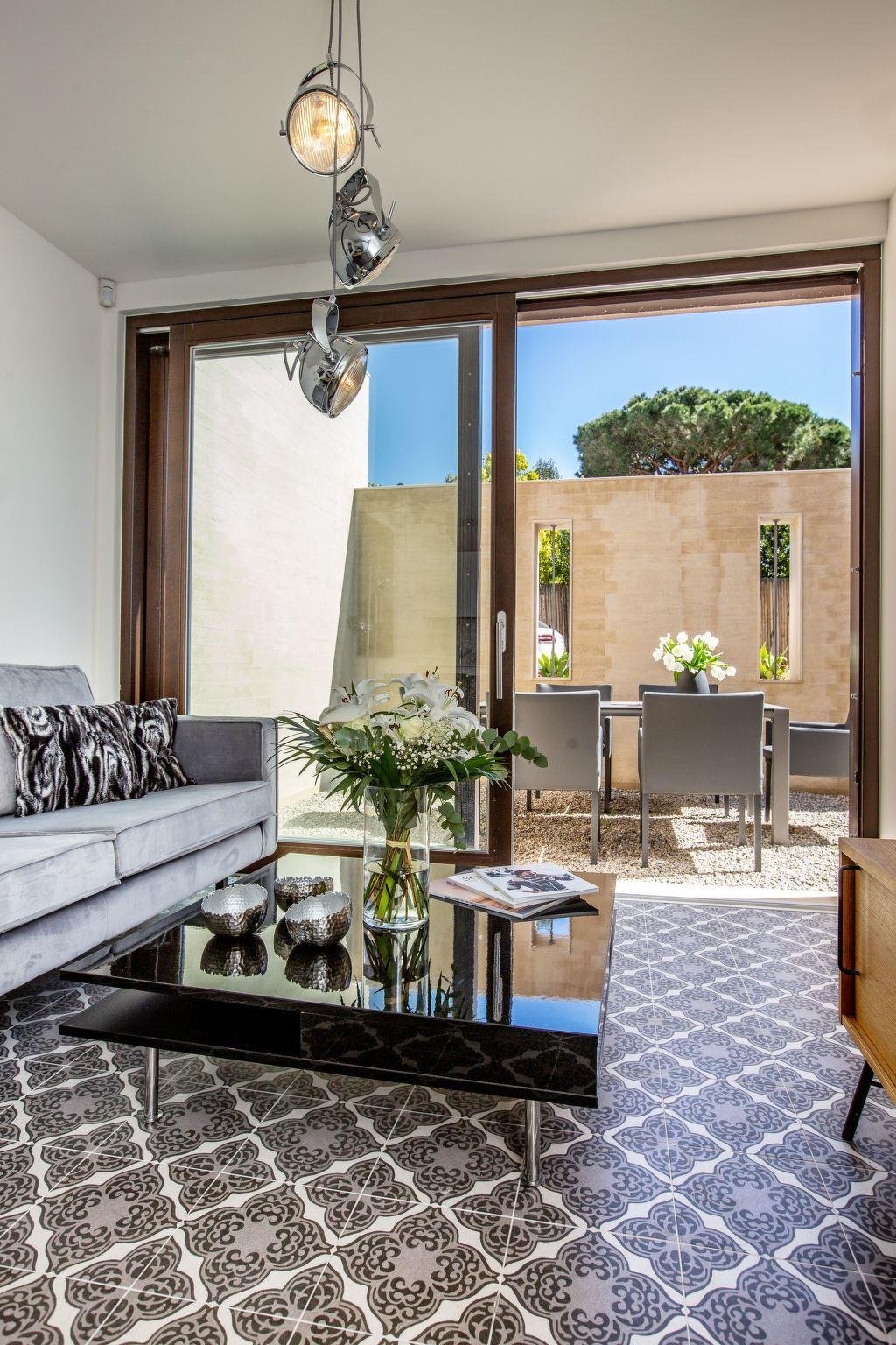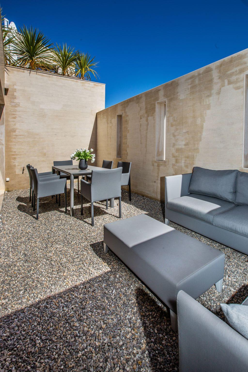 The flat is on the ground floor and sleeps 2 people. The living area includes the lounge, dining area and fully-equipped open-plan kitchen, and opens onto an outdoor terrace with dining table for 6. The flat also has a bedroom with a queen-size bed and a bathroom with a walk-in shower, washbasin, WC and washing machine/dryer.