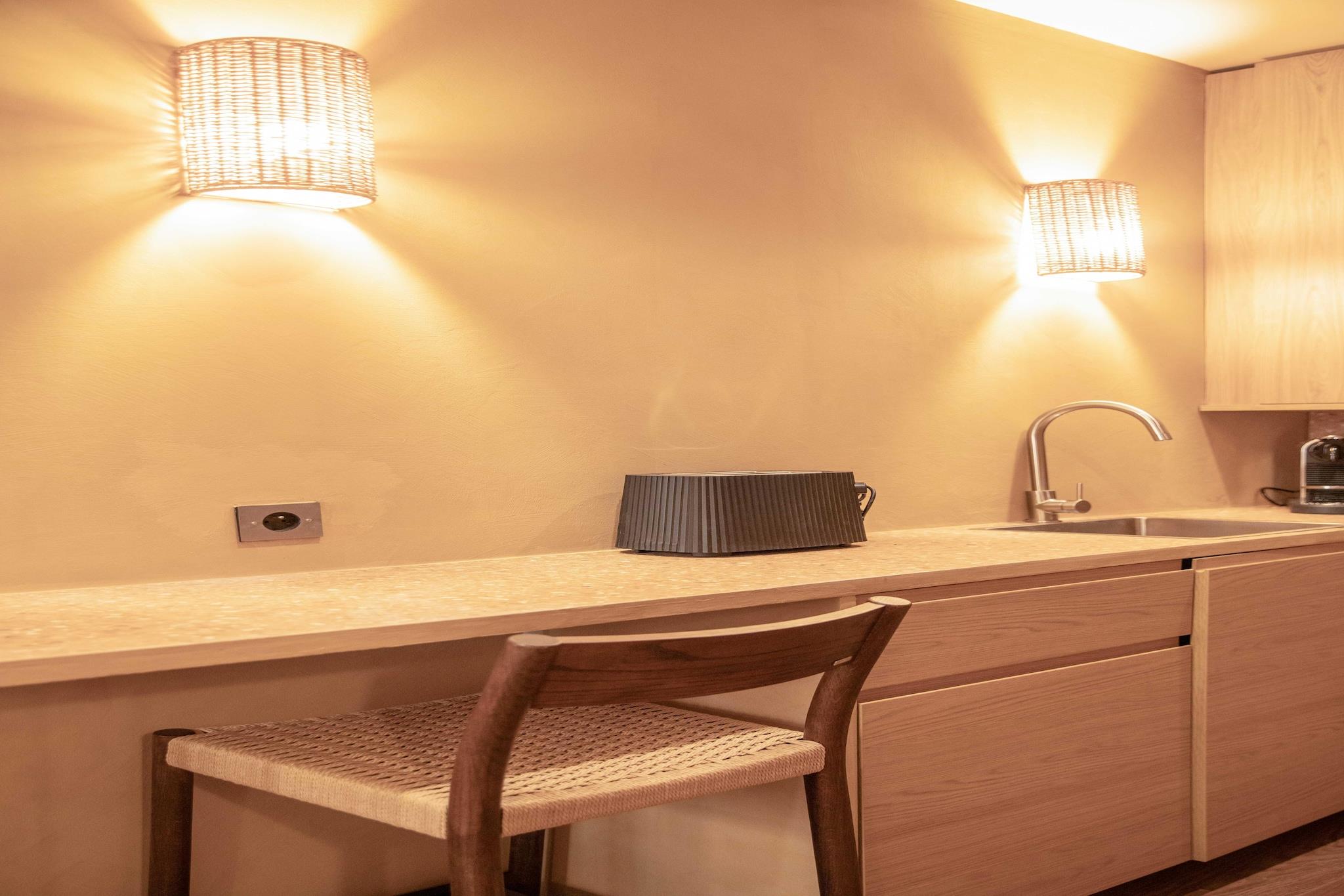 On the 1st floor: (Kitchen(stove, electric kettle, toaster, coffee machine, microwave, dishwasher, fridge, dishes and cutlery), Living/bed room(Bed Linen, TV, dining table, cot, Queen Bed), bathroom(shower, toilet, hairdryer, Towels/Sheets (Incl.), shampoo)) Hot Water, Internet Access DSL, Wardrobe, First Aid, Play area, heating, air conditioning, iron, Essentials, Dedicated workspace, Cooking basics, Carbon monoxide detector, Cleaning Disinfection, Downtown, Enhanced cleaning practices, Extra pillows and blankets, High touch surfaces disinfected, Long term stays allowed, Near Ocean, Room-darkening shades, Town, Village