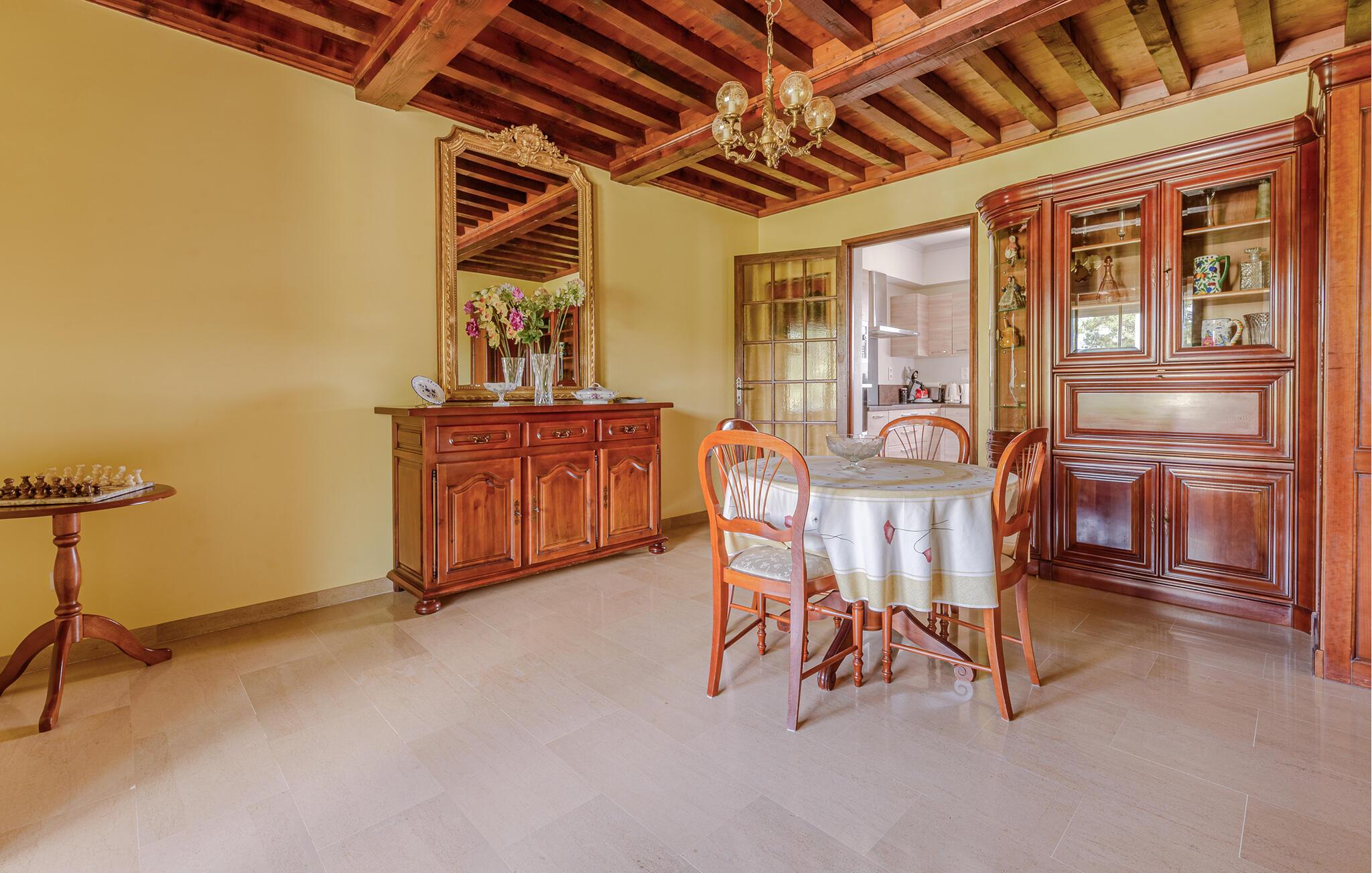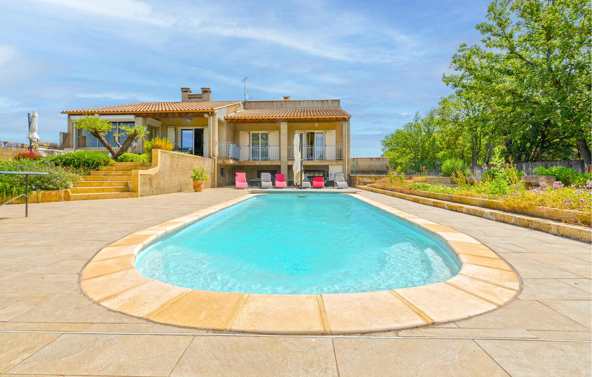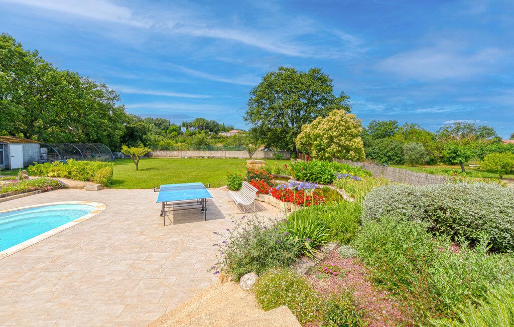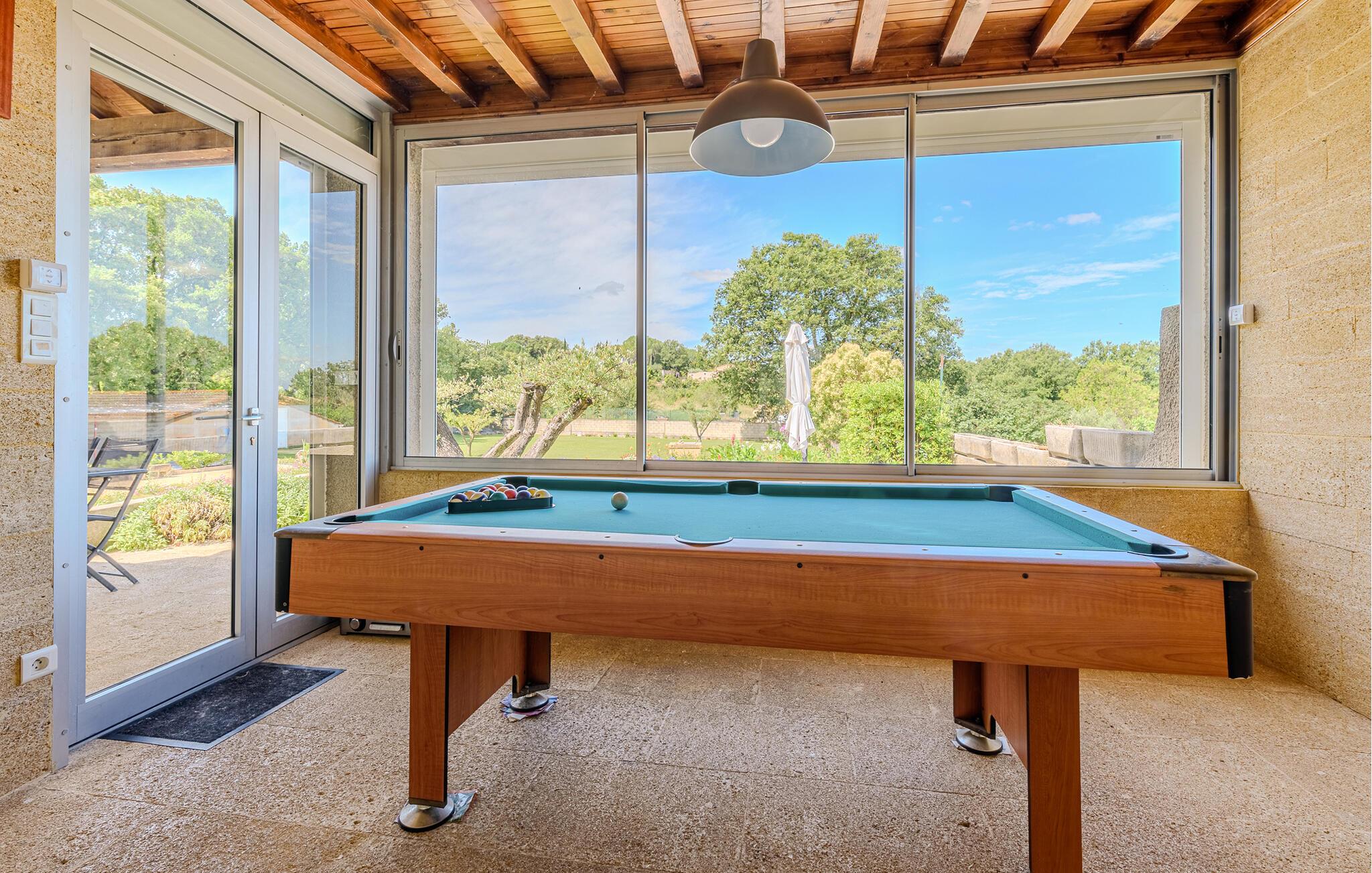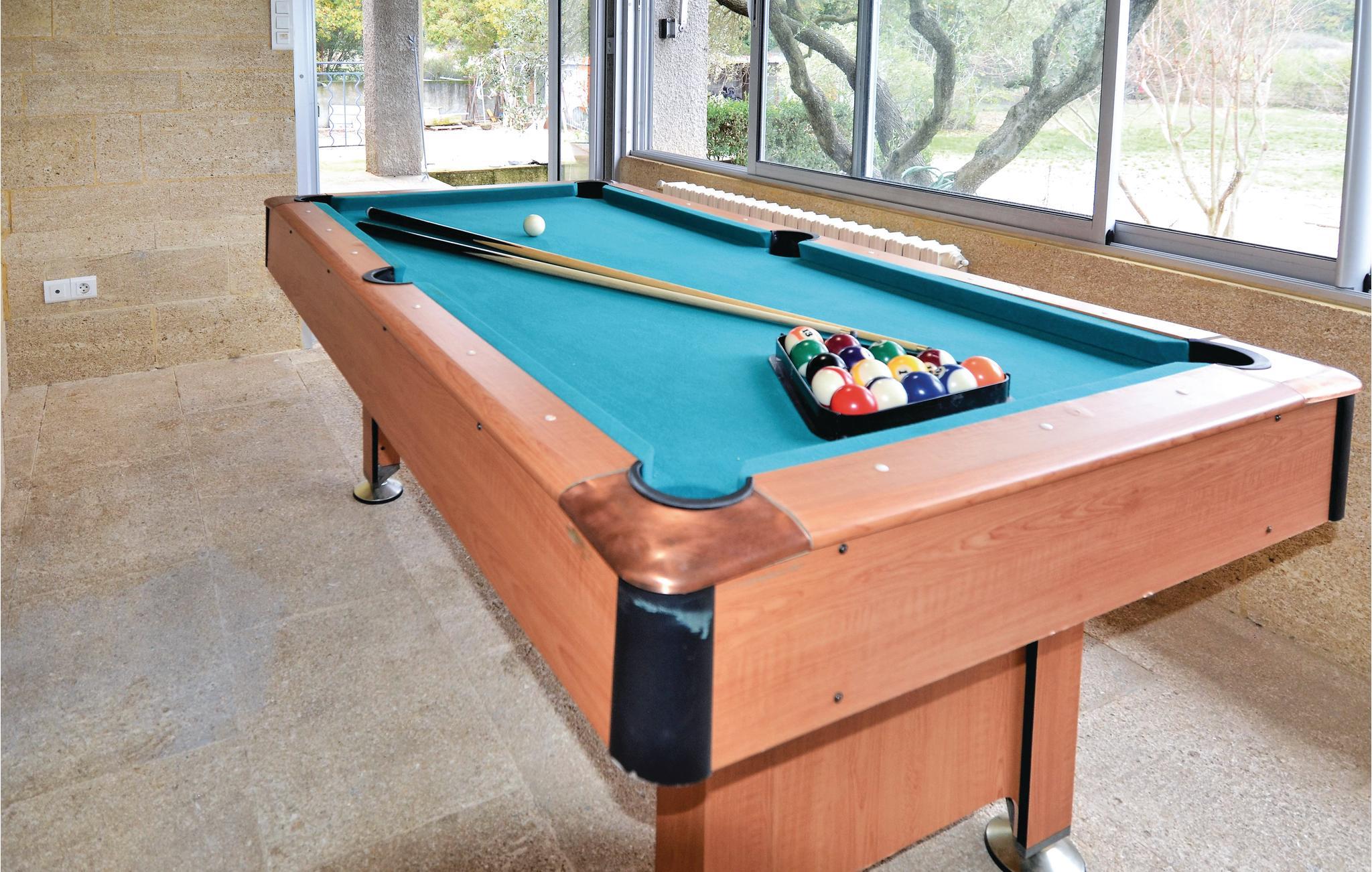 Umgeben von Weinfeldern empfängt Sie dieses großzügig geschnittene Ferienhaus mit sichtgeschütztem Privatpool auf einem 2.500 m² großen und geschlossenen Privatgrundstück. Das Haus profitiert von einer tollen Lage inmitten der Natur und überzeugt durch helle und komfortable Räume. Nach Nîmes sind es 19 km, nach Uzès 10 km, und ebenfalls 10 km entfernt verläuft ein schöner Fluss mit tollen Badestellen. Die Terrasse öffnet sich zur Natur hin, und auf der kleinen Veranda sorgt ein Billardtisch für Abwechslung. Die Küche und die Bäder sind modern und praktisch eingerichtet. Eingebettet in eine schöne Naturlandschaft begrüßt Sie das charmante Dörfchen Aubarne-Sainte-Anastasie in einer extrem ruhigen Umgebung. Gleich in der Nähe können Sie von dem klaren Wasser des Gardon profitieren und den Pont du Gard erleben. Nîmes, eine halbe Stunde entfernt, besticht durch einen Stadtkern mit vielen Monumenten aus der römischen Epoche. 20 Minuten entfernt können Sie sich in Uzès und seiner unter Denkmalschutz stehenden Altstadt umschauen. Erleben Sie etwa die Place aux Herbes, die Rue de l'Aspic und die Place d'Horloge und profitieren Sie von seinen Boutiquen, Restaurants und gemütlichen Cafés. Mittwochmorgens und samstags ganztägig findet in Uzès außerdem einer der schönsten Märkte in ganz Frankreich statt. Nehmen Sie Ihre Kinder mit ins Haribo-Museum oder in den Wasserpark Bouscarasse, und besuchen Sie das Musée 1900 mit Relikten aus der Zeit um die vorige Jahrhundertwende. Natürlich ist der Pont du Gard ein Muss, und in der Umgebung locken Dörfer wie Collias, Lussan, Saint-Victor-la-Coste und Saint-Laurent-des-Arbres.