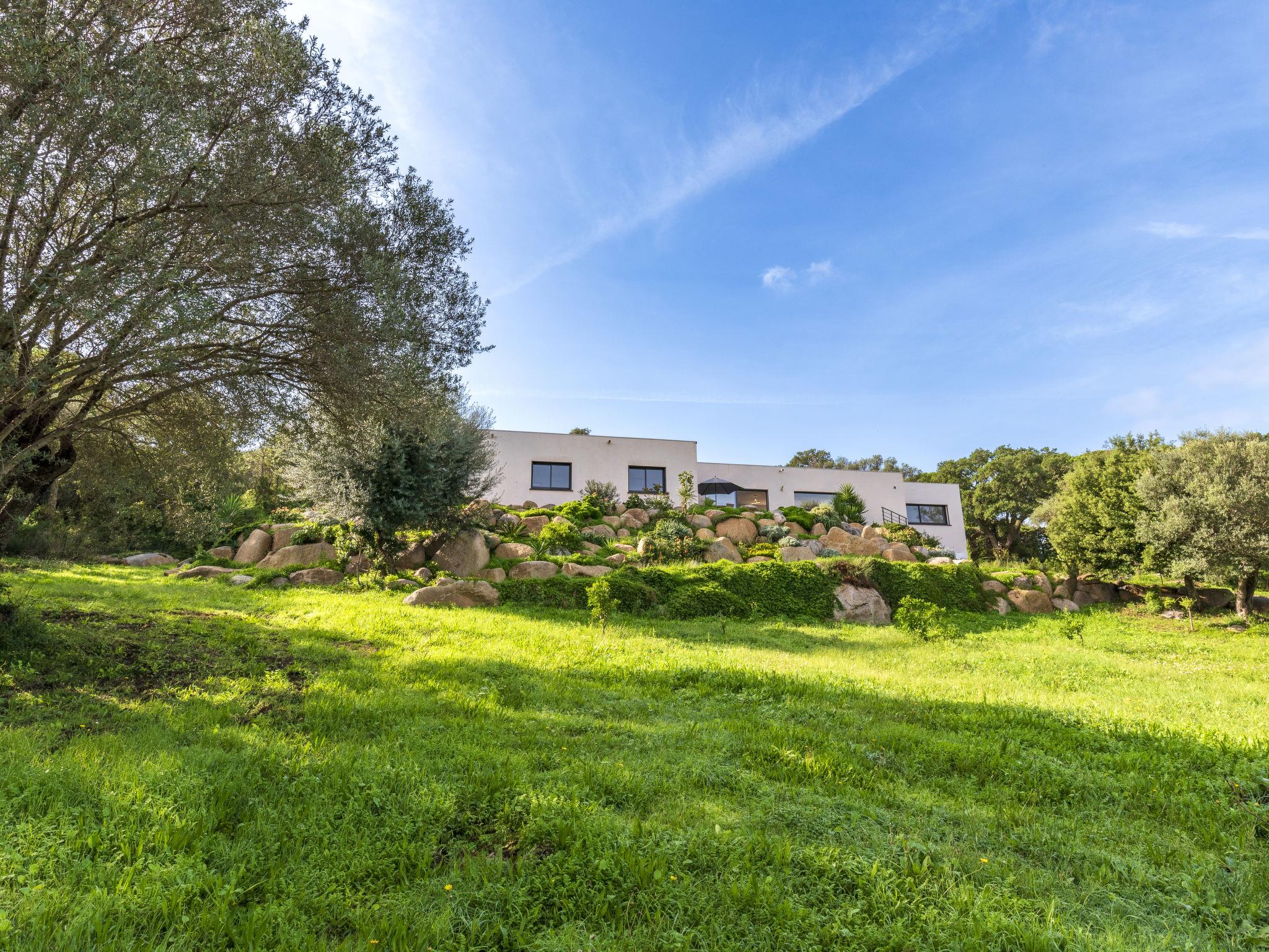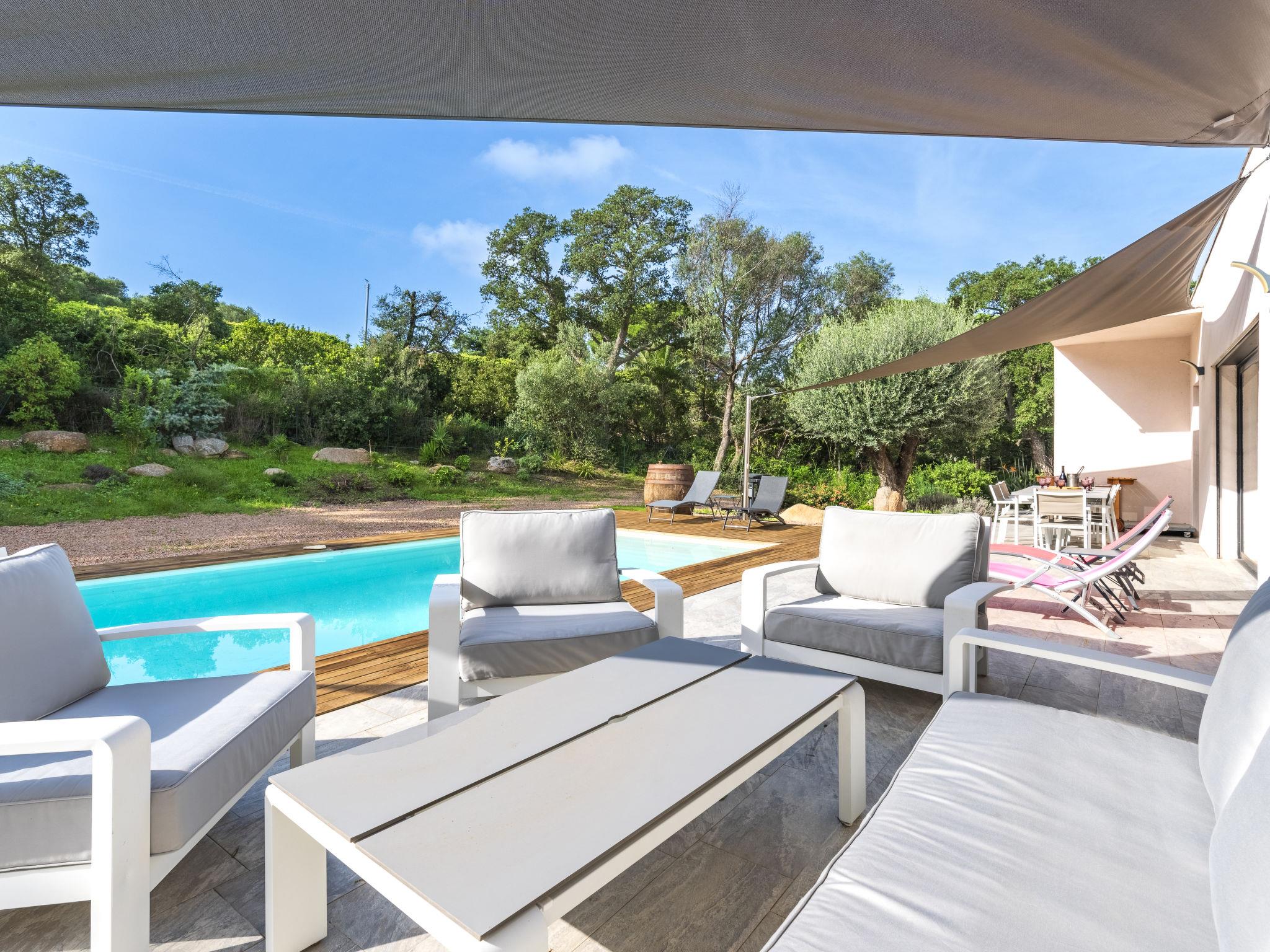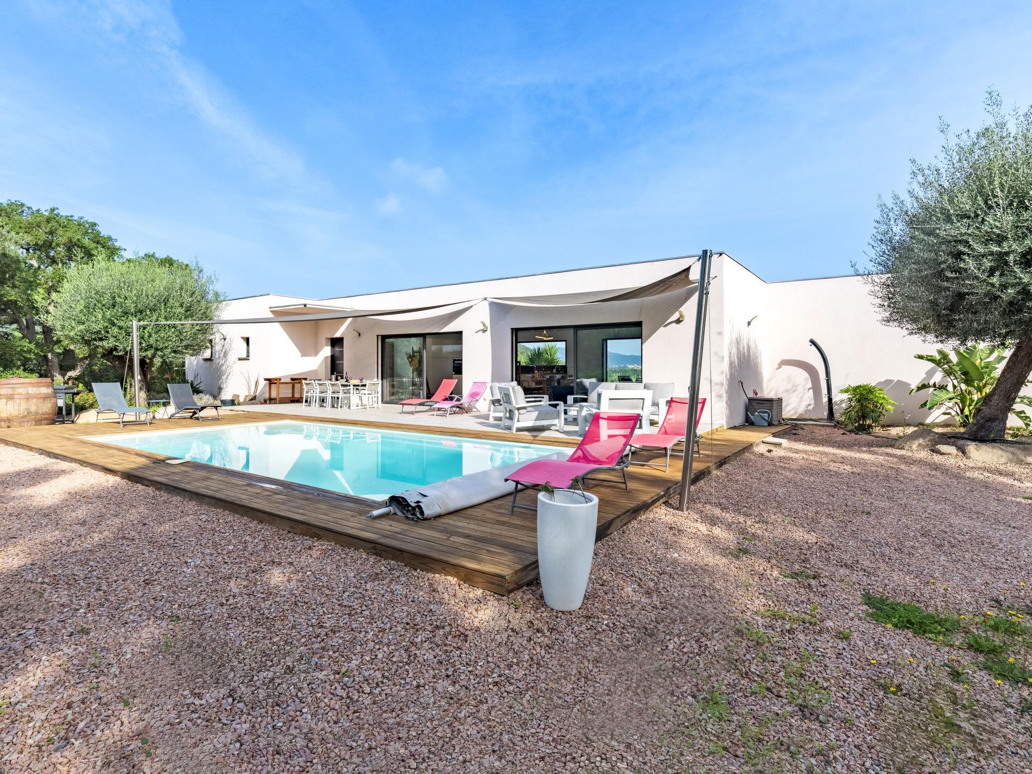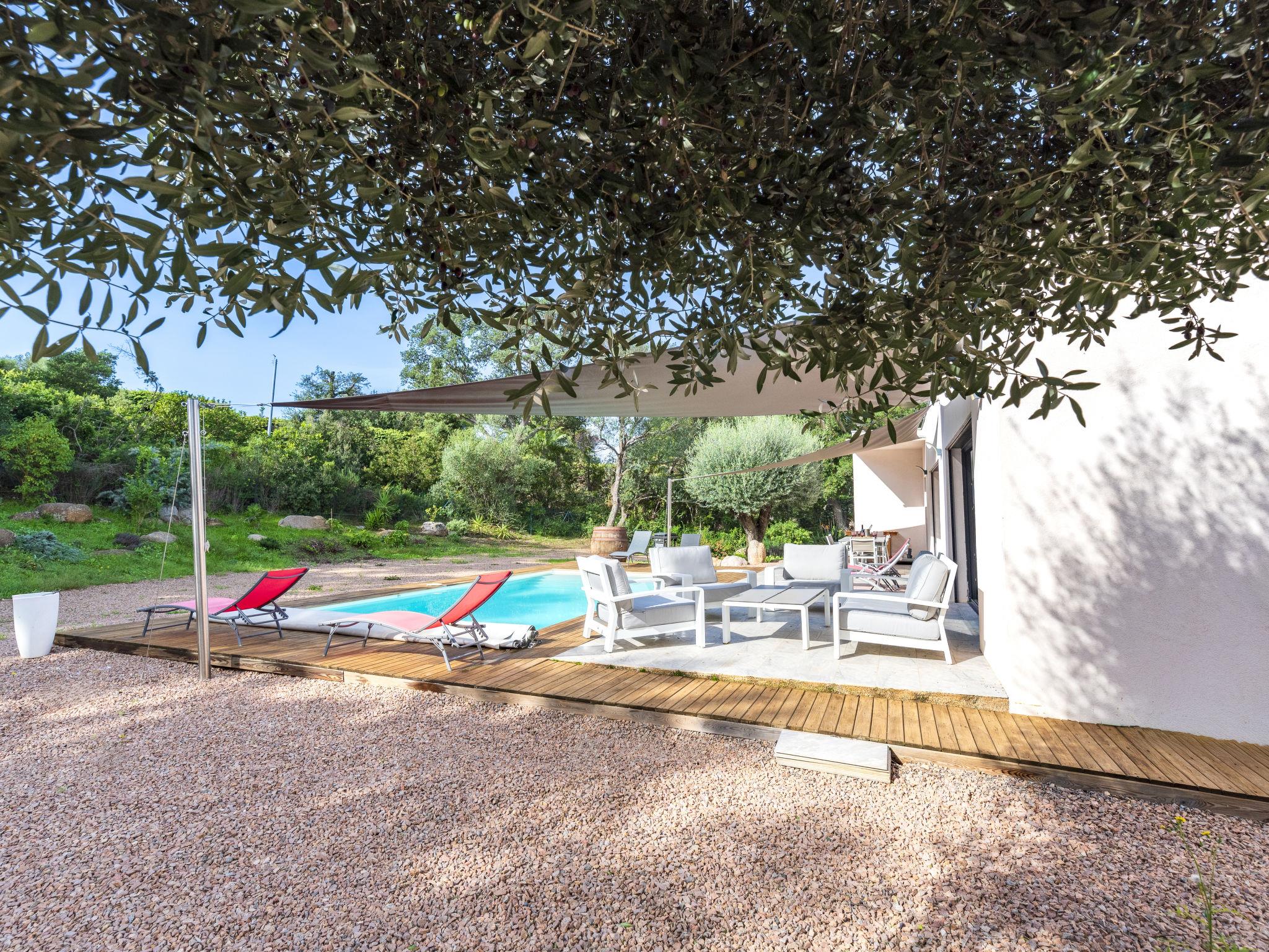 Cirindinu: Modern, beautiful villa "Villa Lamas", built in 2022. 3.5 km from the beach. Private: well-kept terraced garden (fenced), swimming pool angular (8 x 4 m, depth 150 - 150 cm, seasonal availability: 01.Jun. - 01.Sep.). Outdoor shower, terrace, garden furniture, barbecue house, parking (for 3 cars). Supermarket 8 km, restaurant 2 km, bus stop 4.4 km, sandy beach "Pinarellu" 3.5 km. Marina 3 km. Nearby attractions: Plage de Saint Cyprien 4 km, Plage de Pinarellu 3.5 km, Plage de Palombaggia 24 km, Plage de Santa Giulia 21 km, Golf de Lezza 21 km, Port de Porto-Vecchio 14 km. Well-known lakes can easily be reached: Lac de l'Ospedale 34 km. Hiking paths: Les aiguilles de Bavella 58 km. Please note: car recommended. Object suitable for 8 adults.