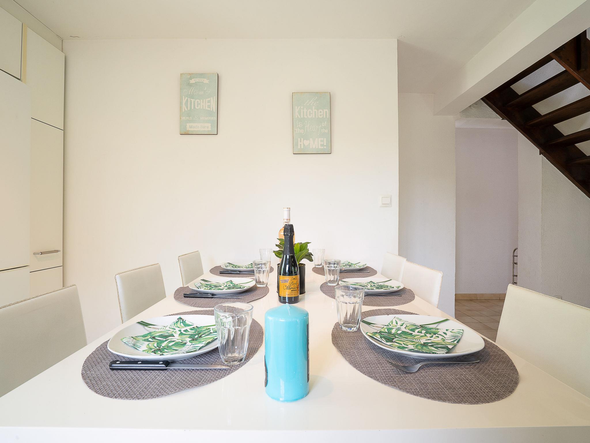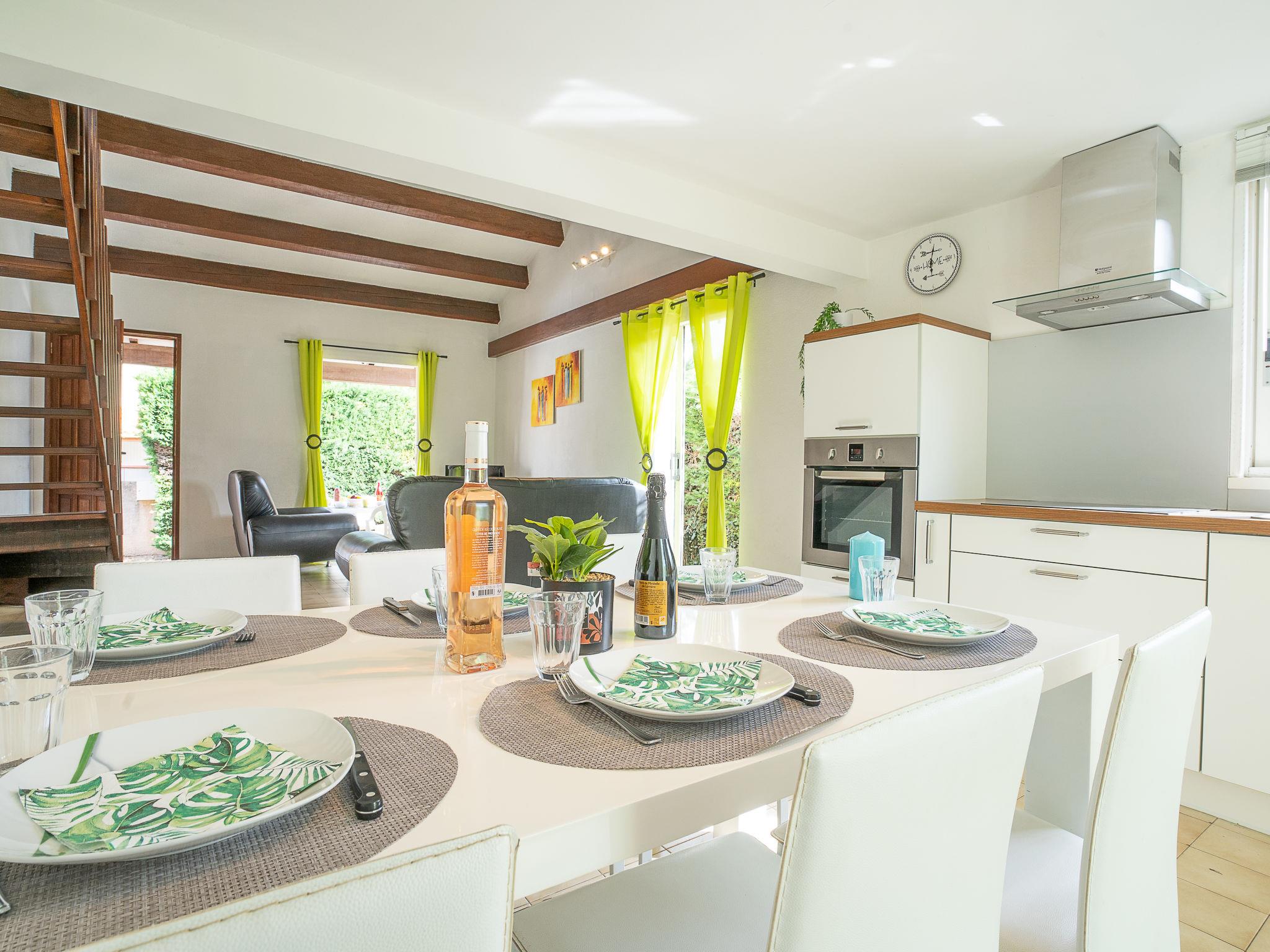 4-room house 110 m2 on 2 levels. Practical and beautiful furnishings: living/dining room with TV (flat screen). Exit to the terrace. 1 room with 1 french bed (140 cm, length 190 cm), bath/WC and fan. Open kitchen (oven, dishwasher, 4 ceramic glass hob hotplates, microwave, electric coffee machine) with dining table. Exit to the garden. Sep. WC. Upper floor: 1 room with 2 beds (90 cm, length 190 cm), fan. 1 room with 2 beds (90 cm, length 190 cm), fan. Shower/WC. Small terrace 15 m2, large garden. Terrace furniture. Facilities: washing machine, iron. Internet (WiFi, extra). Parking at the house. Please note: non-smoking house. 1 small pet/ dog allowed. Smoke alarm. As part of the water restriction measures linked to drought in some of our departments, please note that the rental swimming pool may be closed by prefectural decree.