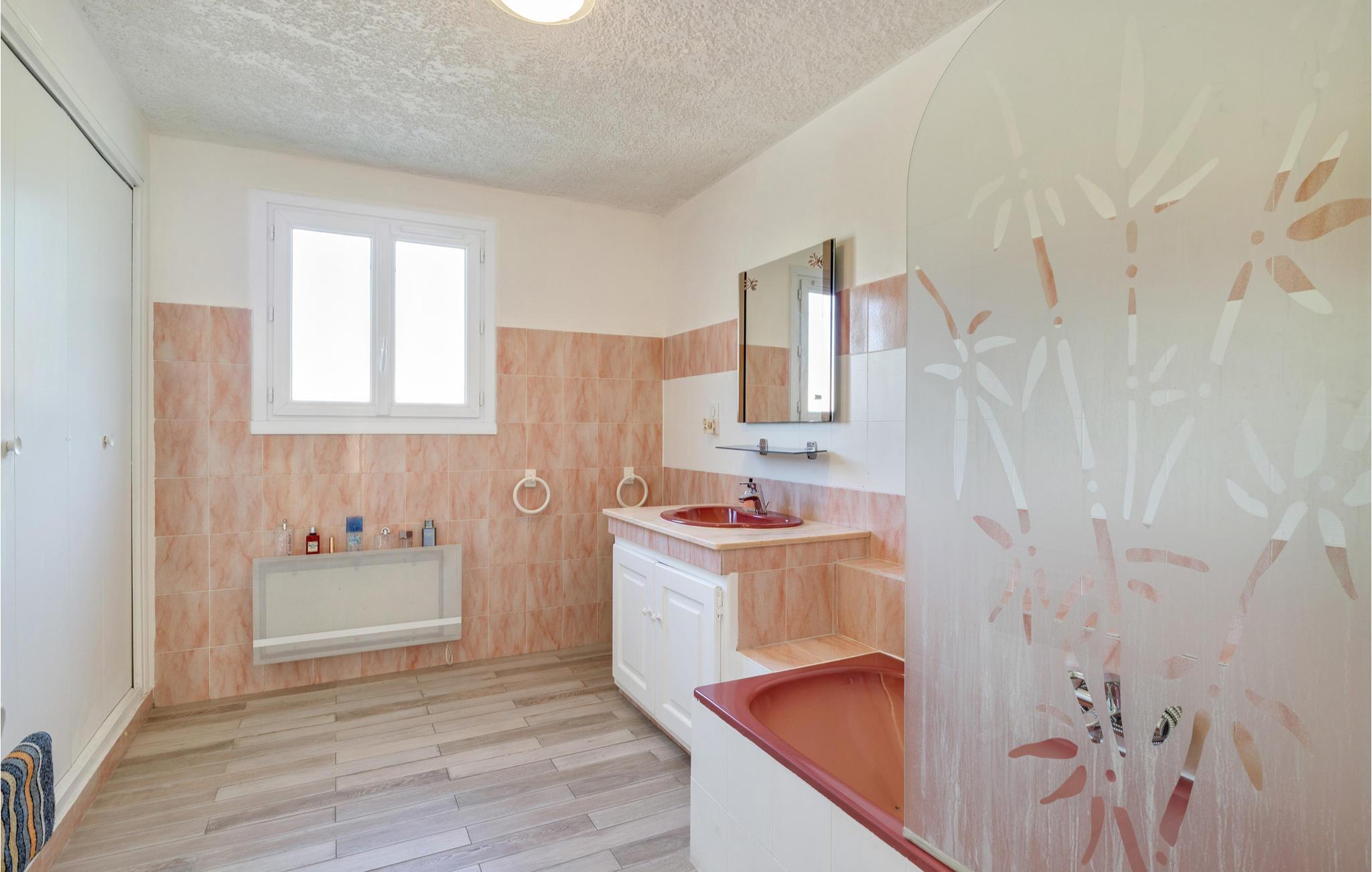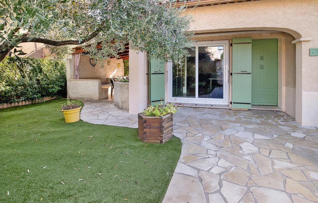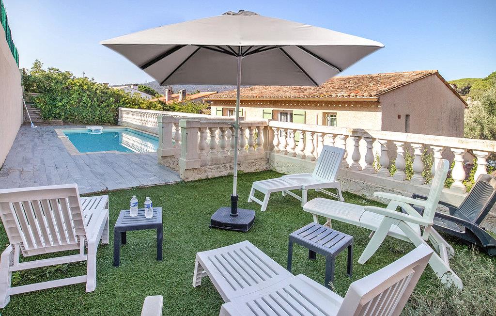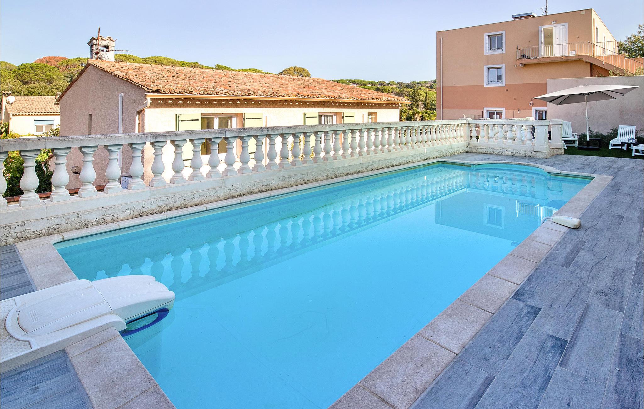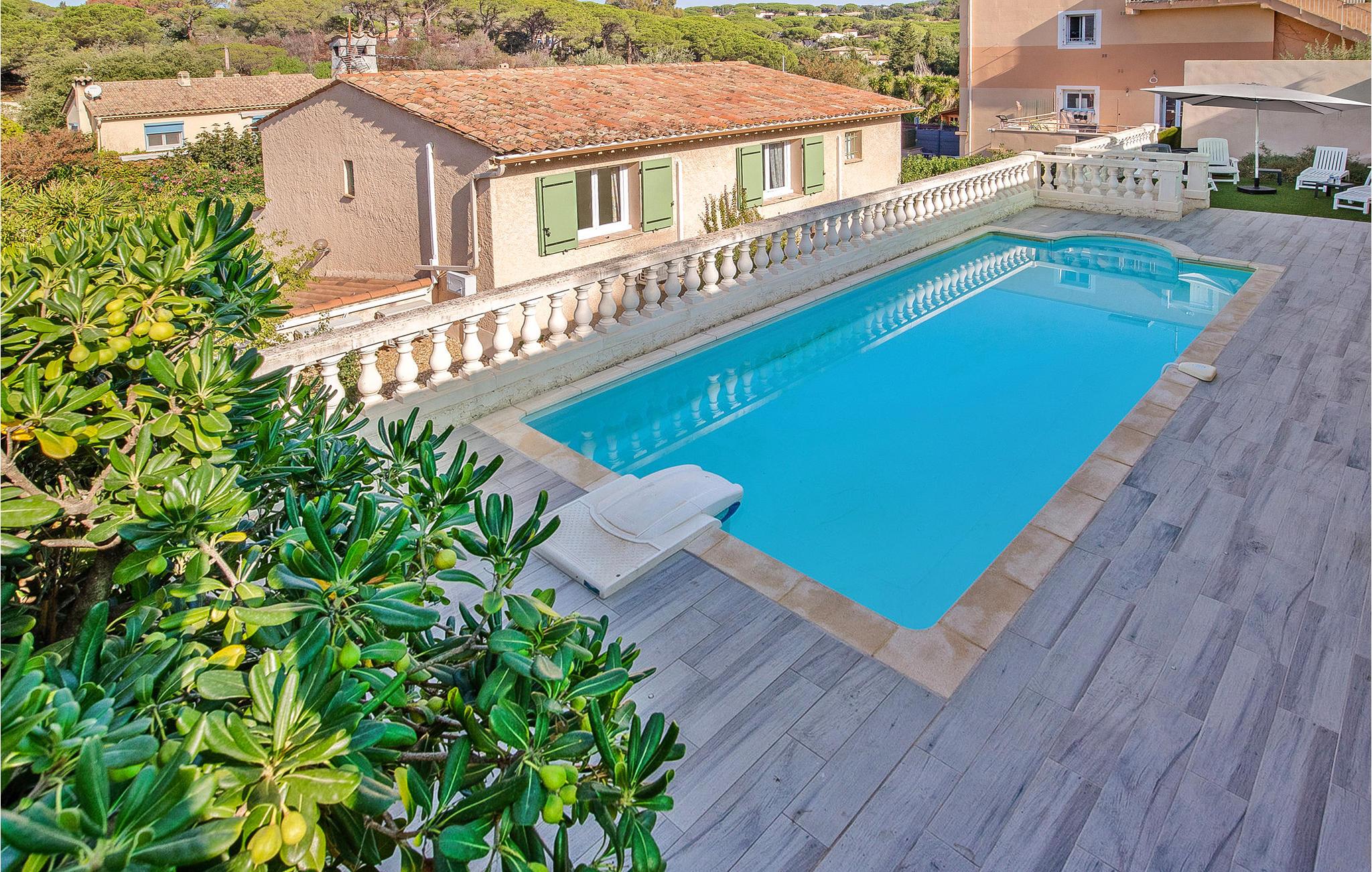 Dieses sehr schöne Ferienhaus in den Farben der Provence und mit einem Swimmingpool steht in einem Wohnviertel von Sainte-Maxime, nur 1 km von den nächsten Mittelmeerstränden. Großzügig geschnittene Räume sowie eine helle und moderne Einrichtung zeichnen dieses Objekt aus, das ebenfalls mit einer Klimaanlage für die heiße Sommerzeit ausgestattet ist. Die bis zu zehn Urlauber, die in diesem Haus Platz finden, erwarten ein weitläufiger Garten sowie eine 20 m² große und überdachte Terrasse für viele schöne Grillabende im Schoß der Familie. 17 km entfernt liegt Ihnen Saint-Tropez zu Füßen. Dieser als Spielwiese des Jetsets bekannter Ort besticht durch seinen charmanten kleinen Hafen und den berühmten Strand Pampelonne. Entdecken Sie seine Zitadelle mit einem Museum für Seefahrts- und Ortsgeschichte und machen Sie einen Spaziergang auf dem Cap Camarat. Auch das Musée de la Tour Carrée bzw. das Heimatkundemuseum in Sainte-Maxime ist einen Besuch wert. Es findet hier jeder sein persönliches Glück, und für jeden ist die richtige Freizeitaktivität dabei: Golf, Reiten, Tennis sowie unvergessliche Ausflüge zu Fuß oder mit dem Mountainbike. Machen Sie Ihren Kindern eine Freude und nehmen Sie sie mit ins Aqualand, dessen Rutschen natürlich nicht nur ein Spaß für die Kleinen sind. Wer sich für dieses charmante Feriendomizil mit Pool entscheidet, hat einen gelungenen und sonnigen Familienurlaub im Var in Aussicht. Terrasse etwas versetzt gelegen. Pool erreichbar über Stufen.