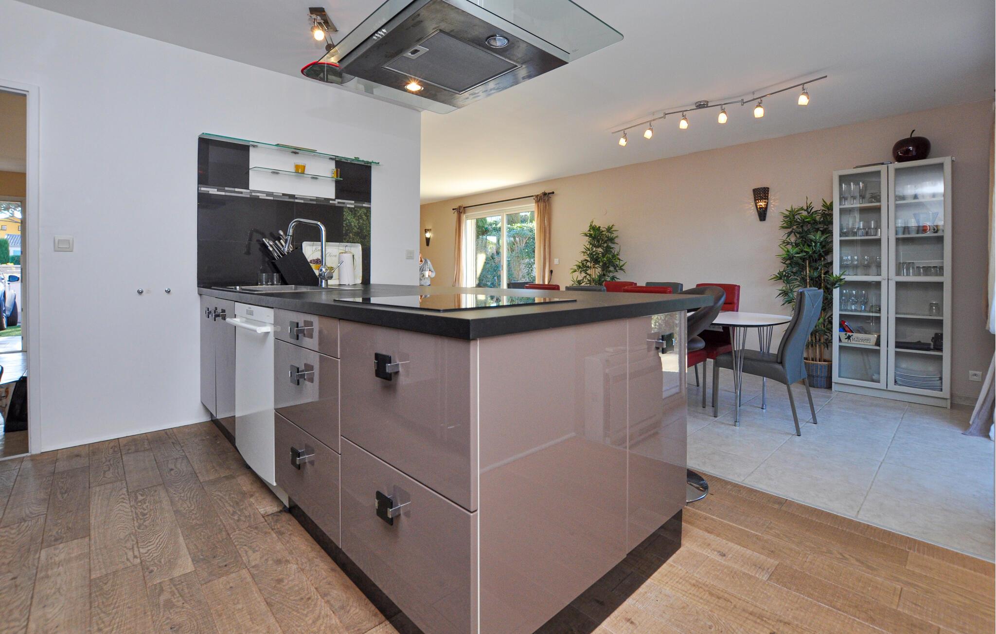Treten Sie ein und fühlen Sie sich im eleganten, offenen Ambiente dieses Ferienhauses wie zuhause. Kochen Sie gemeinsam in der modernen, voll ausgestatteten Küche und kommen Sie für gesellige Mahlzeiten im einladenden Essbereich zusammen. Genießen Sie entspannte Abende mit einem Glas Wein oder einem guten Buch im stilvollen Wohnzimmer