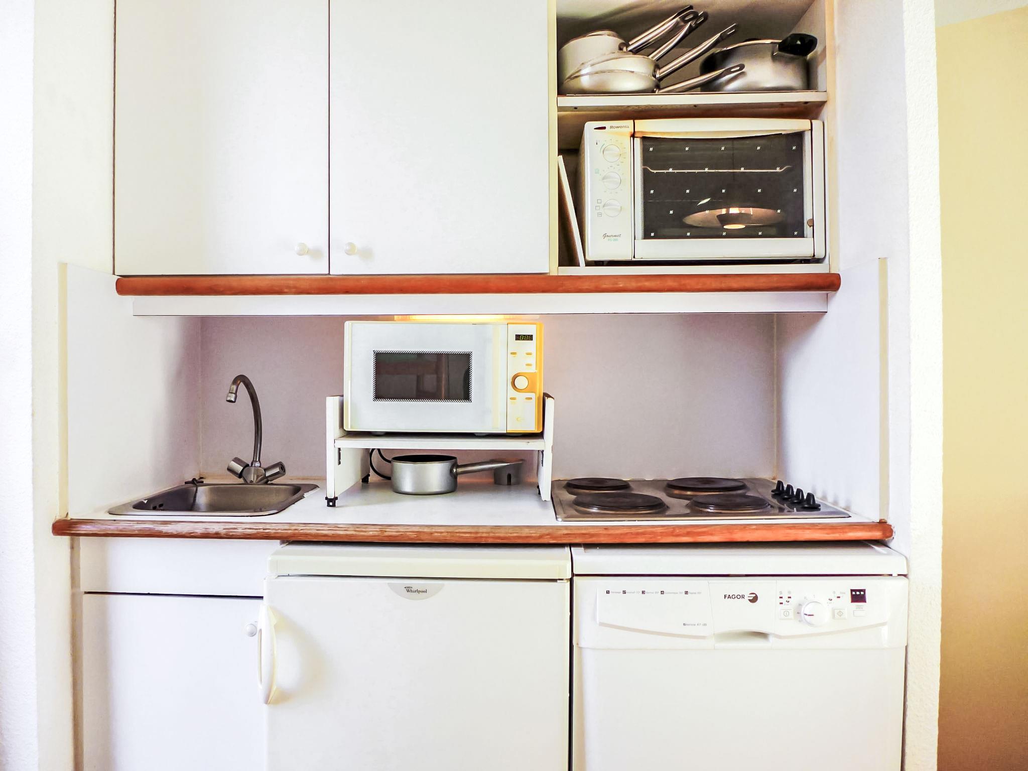 3-room apartment 45 m2 on 2 levels on 1st floor. Simple furnishings: living room with TV. Exit to the balcony. Sleeping alcove with 1 x 2 bunk beds (80 cm, length 190 cm). Bath/WC. Electric heating. Upper floor: 1 room with 1 french bed (140 cm, length 190 cm). Open kitchen (mini-oven, dishwasher, 2 ceramic glass hob hotplates, toaster, kettle, microwave, electric coffee machine). Exit to the terrace. Terrace 25 m2, south facing position. Very beautiful view of the sea. Facilities: Internet (WiFi, extra). Parking. Please note: non-smokers only. Maximum 1 pet/ dog allowed. Smoke alarm. The property is accessed via 45 steps and is situated 600 m from the beach. This property has access to the round swimming pool. 83115003380HT
