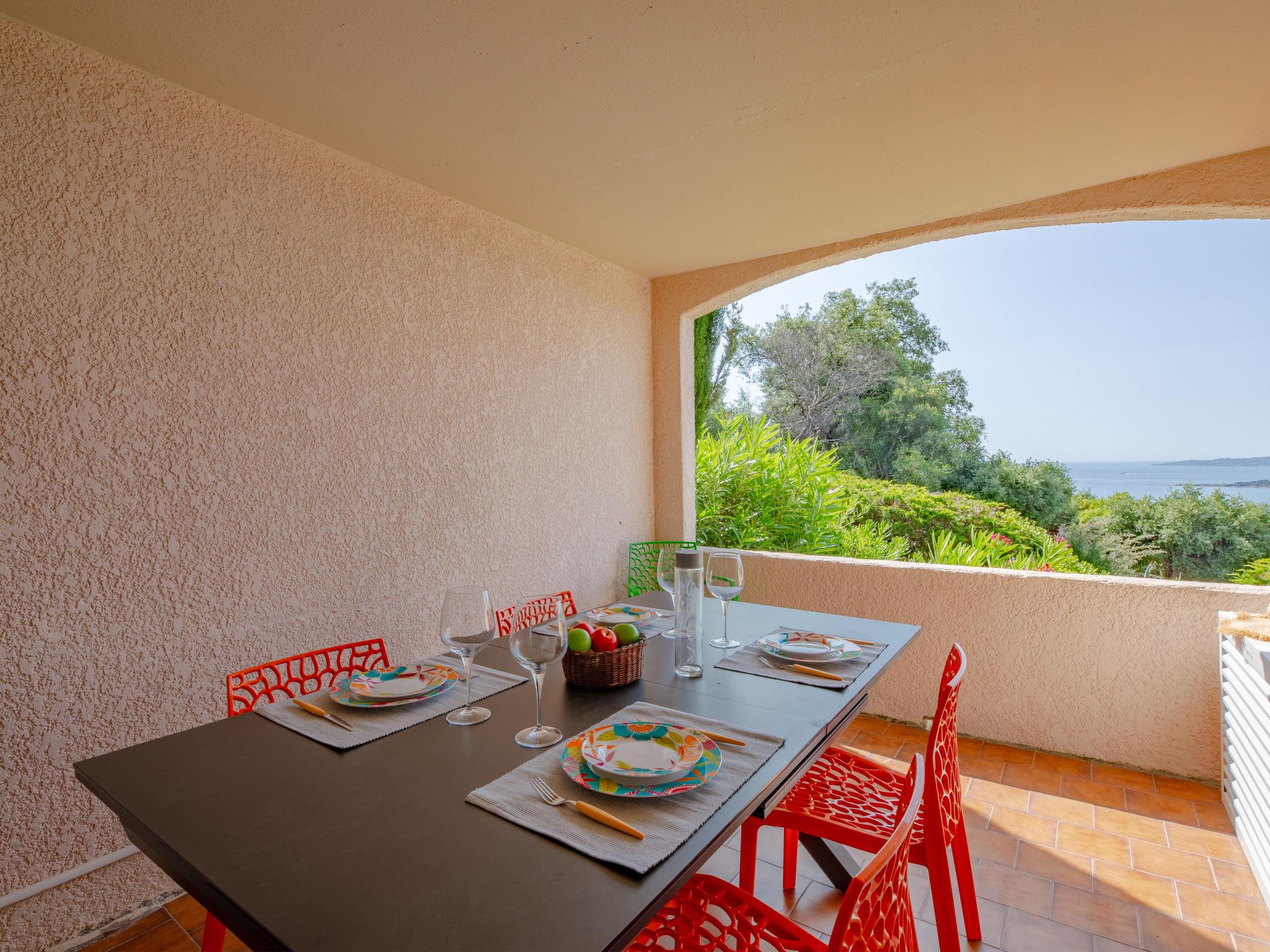 2-room apartment 25 m2. Comfortable furnishings: dining room with 1 double sofabed (140 cm, length 190 cm), TV and air conditioning. Exit to the terrace. 1 small room with 1 french bed (140 cm, length 190 cm). Kitchenette (2 hot plates, dishwasher, toaster, kettle, microwave, electric coffee machine). Shower/WC. Electric heating. Terrace 11 m2, south facing position. Balcony furniture. Very beautiful view of the sea. Facilities: washing machine. Internet (WiFi, free). Parking. Please note: non-smokers only. Maximum 1 pet/ dog allowed. Smoke alarm. The property is accessible by 39 steps. This property has access to the round swimming pool. Offer by a private individual according to Art. 155, IV of CGI. 83115003012AK