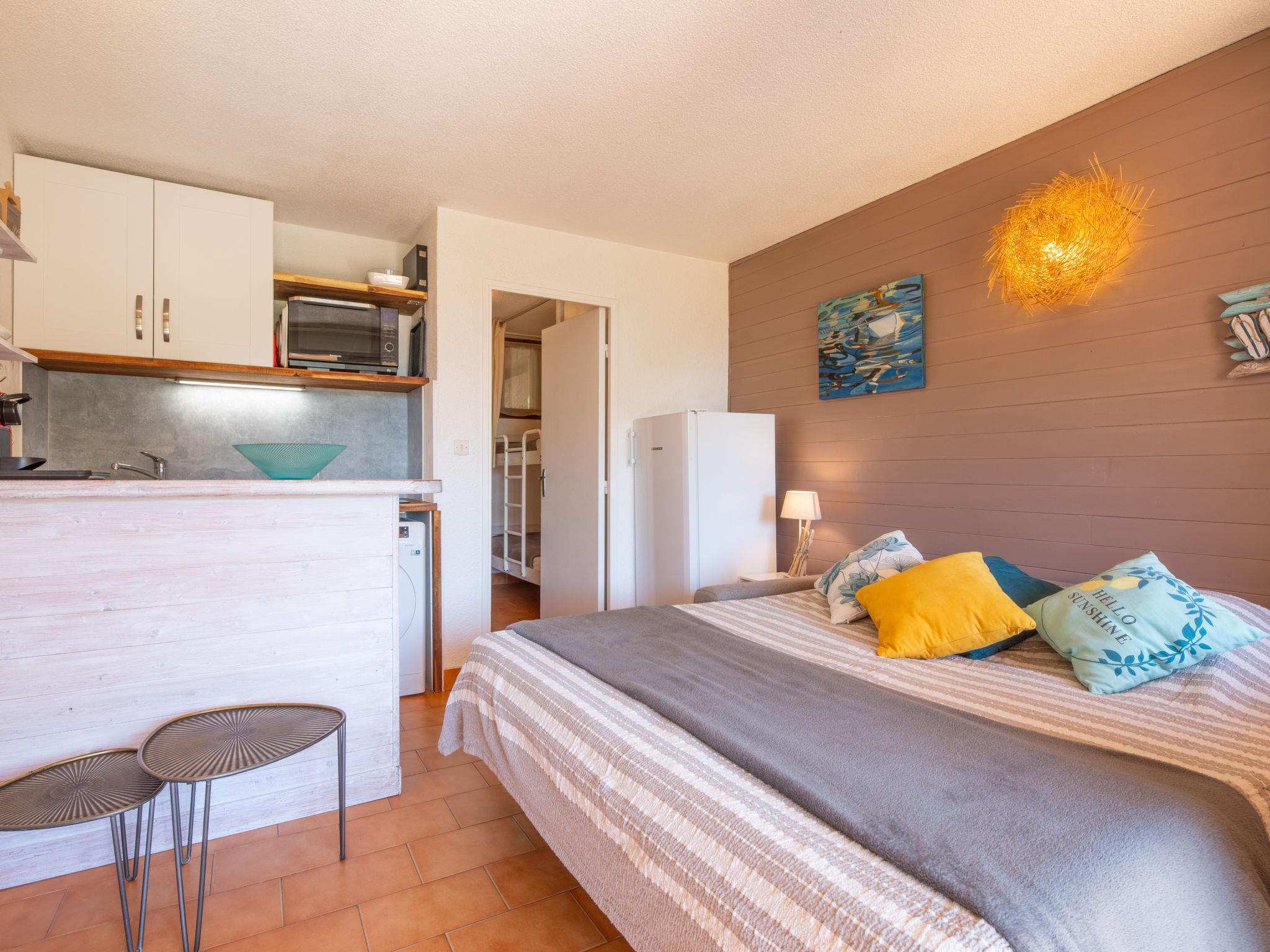 1-room apartment 21 m2. Object suitable for 2 adults + 2 children. Beautiful furnishings: entrance hall with 1 x 2 bunk beds (80 cm, length 190 cm). Living/sleeping room with 1 double sofabed (160 cm, length 200 cm), TV (flat screen). Exit to the terrace. Kitchenette (dishwasher, 2 induction hot plates, toaster, kettle, electric coffee machine, combination microwave). Bath/WC. Electric heating. Terrace 12 m2. Terrace furniture. Partial view of the sea. Facilities: washing machine. Internet (WiFi, extra). Please note: non-smokers only. Maximum 1 pet/ dog allowed. Smoke alarm. Instead of an enclosed bedroom, some sleeping areas are located in an open-plan area (gallery, alcove, etc.). 83115003597NH