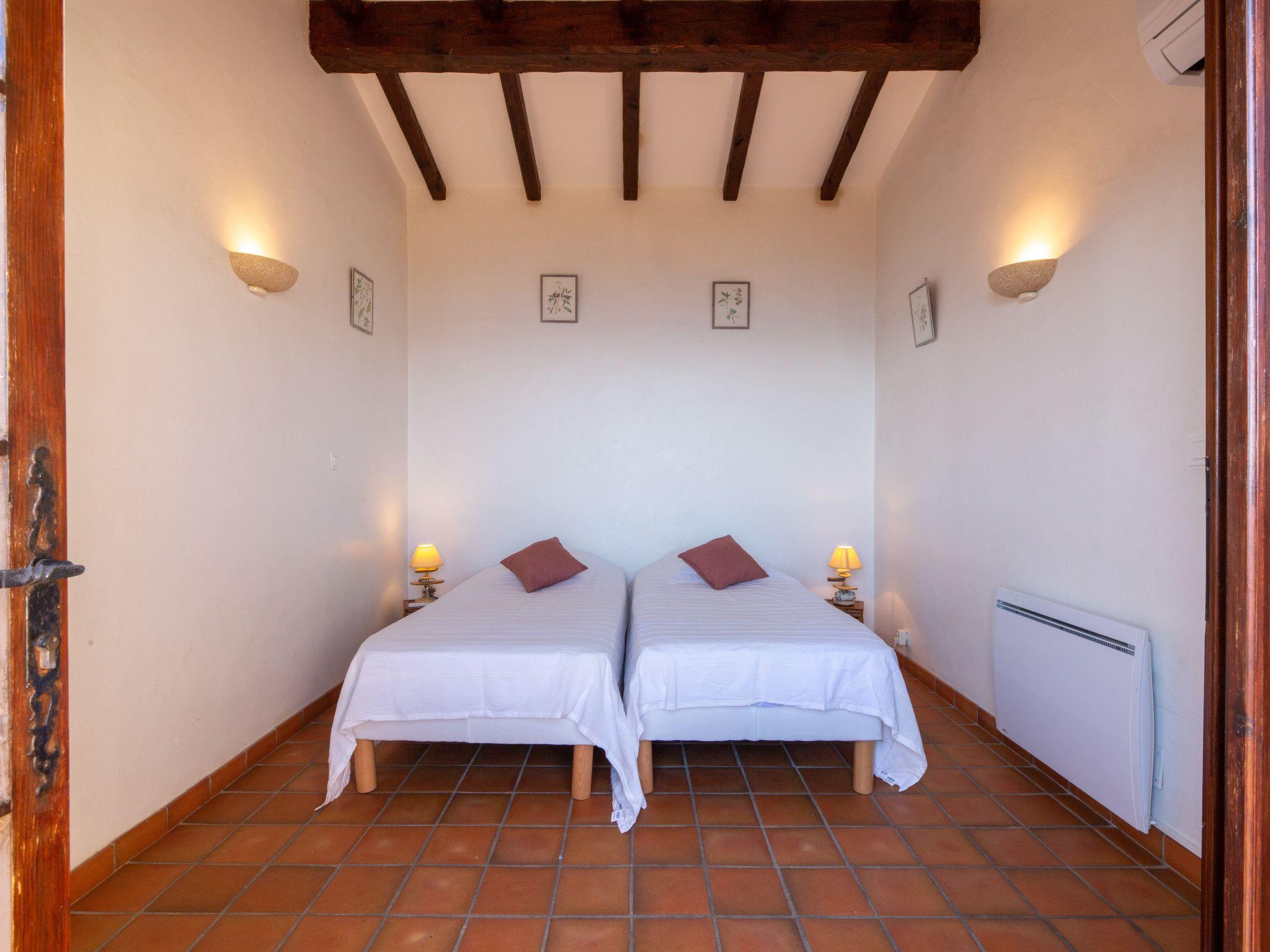 5-room villa 160 m2 on 2 levels. Rustic and antique furnishings: living/dining room with open-hearth fireplace (only for decoration), TV. Exit to the terrace. 2 rooms, each room with 1 french bed (140 cm, length 190 cm), air conditioning. Exit to the terrace. Kitchen (oven, dishwasher, 3 ceramic glass hob hotplates, toaster, kettle, microwave, freezer, electric coffee machine). Exit to the terrace. Bathroom, sep. WC. Electric heating. Upper floor: 1 room with 1 french bed (140 cm, length 190 cm), air conditioning. Exit to the balcony. 1 room with 2 beds (90 cm, length 190 cm), air conditioning. Exit to the balcony. Shower, sep. WC. Large terrace roofed, east facing position. Terrace furniture. Marvellous panoramic view of the sea. Facilities: washing machine, baby cot for up to 2 year olds. Internet (WiFi, free). Garage. Please note: non-smokers only. Smoke alarm. 83115000760SM