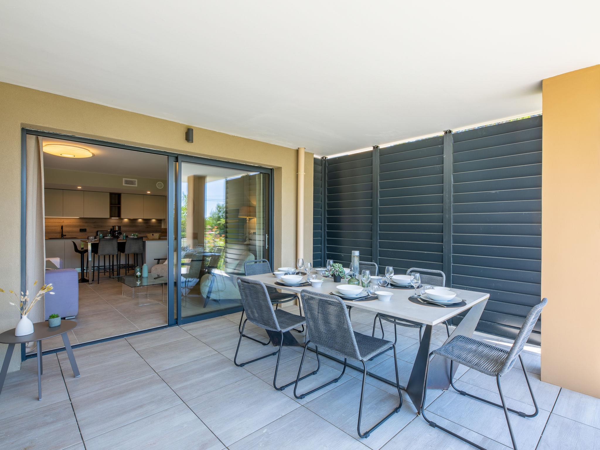 3-room apartment 75 m2, on the ground floor, south-west facing position. Spacious, beautiful and modern furnishings: entrance hall with separate WC. Large living/dining room with 1 sofabed (130 cm, length 190 cm), TV (flat screen). Exit to the terrace, to the patio. 1 room with 1 french bed (1 x 160 cm, length 200 cm). Exit to the garden. 1 room with 1 french bed (1 x 140 cm, length 190 cm). Exit to the terrace. Large, open kitchen (oven, dishwasher, 3 induction hot plates, toaster, kettle, microwave, freezer, electric coffee machine). Shower. Air-conditioning, forced-air heating. Terrace 20 m2, roofed, south-west facing position, patio 40 m2, south-west facing position. Terrace furniture. View of the swimming pool and the garden. Facilities: washing machine, iron, hair dryer. Internet (WiFi, free). Garage space n 28/29, height 190 cm, width 300 cm. Please note: non-smokers only. Maximum 1 pet/ dog allowed. Smoke alarm. Single storey accommodation, accessible by wheelchair or with reduced mobility. Offer by a private individual according to Art. 155, IV of CGI. 83115005166AV