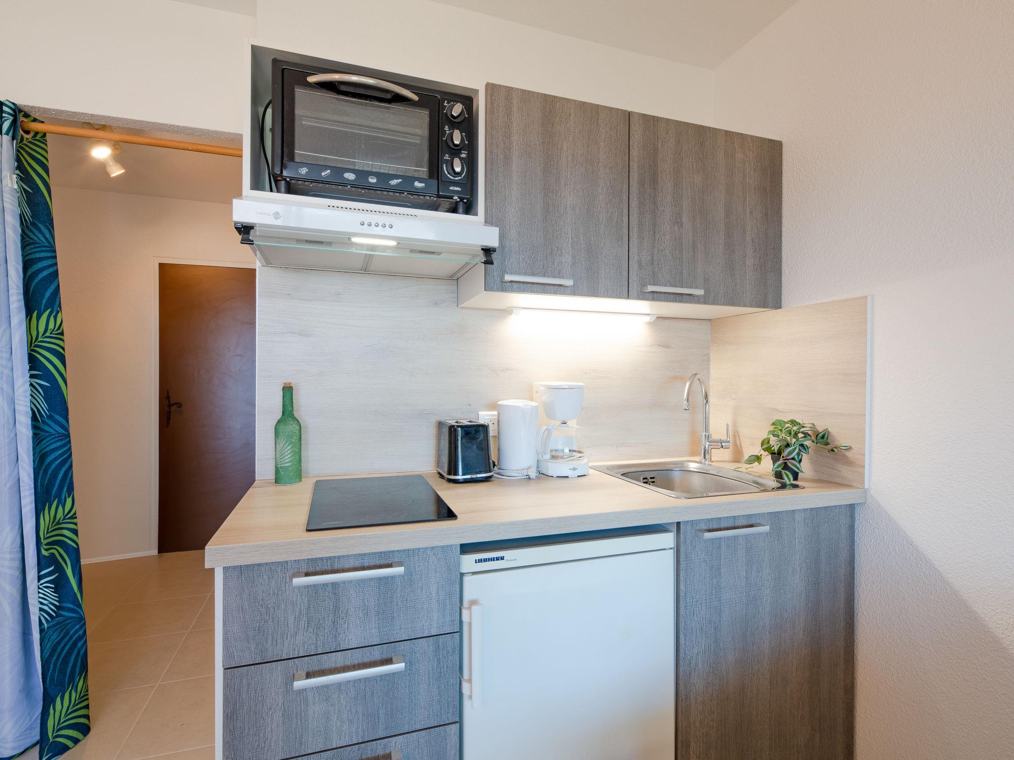 1-room apartment 28 m2, on the ground floor. Beautiful furnishings: living/sleeping room with 1 double sofabed (140 cm, length 190 cm), TV. Exit to the terrace. Kitchenette (2 hot plates, mini-oven, toaster, kettle, electric coffee machine). Shower/WC. Electric heating. Terrace 15 m2, south facing position. Terrace furniture. View of the sea. Facilities: Internet (WiFi, extra). Parking. Please note: maximum 1 pet/ dog allowed. TV only FR. Smoke alarm. 83115003023WR