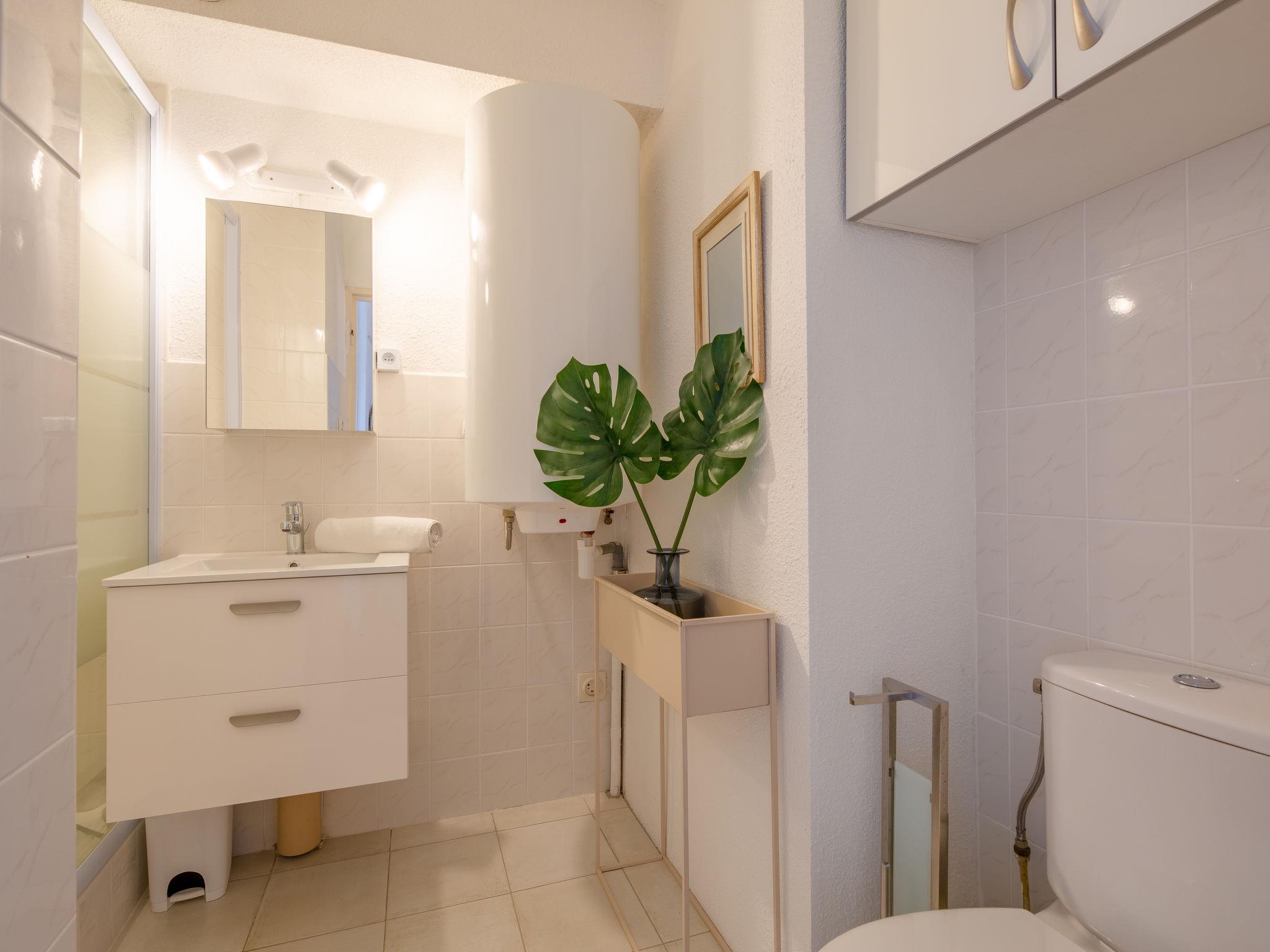 1-room studio 36 m2 on 6th floor, east facing position. Bright, beautiful furnishings: living/sleeping room with 1 french bed (1 x 140 cm, length 200 cm), TV (flat screen). Exit to the balcony. Kitchenette in the entrance (2 ceramic glass hob hotplates, toaster, kettle, electric coffee machine). Shower/WC. Air-conditioning, forced-air heating. Balcony 8 m2, east facing position. Balcony furniture. Beautiful view of the sea and the resort. Facilities: hair dryer. Internet (WiFi, free). Please note: non-smokers only. Maximum 1 small pet/ dog allowed. Smoke alarm. Offer by a private individual according to Art. 155, IV of CGI. 83115004508HT